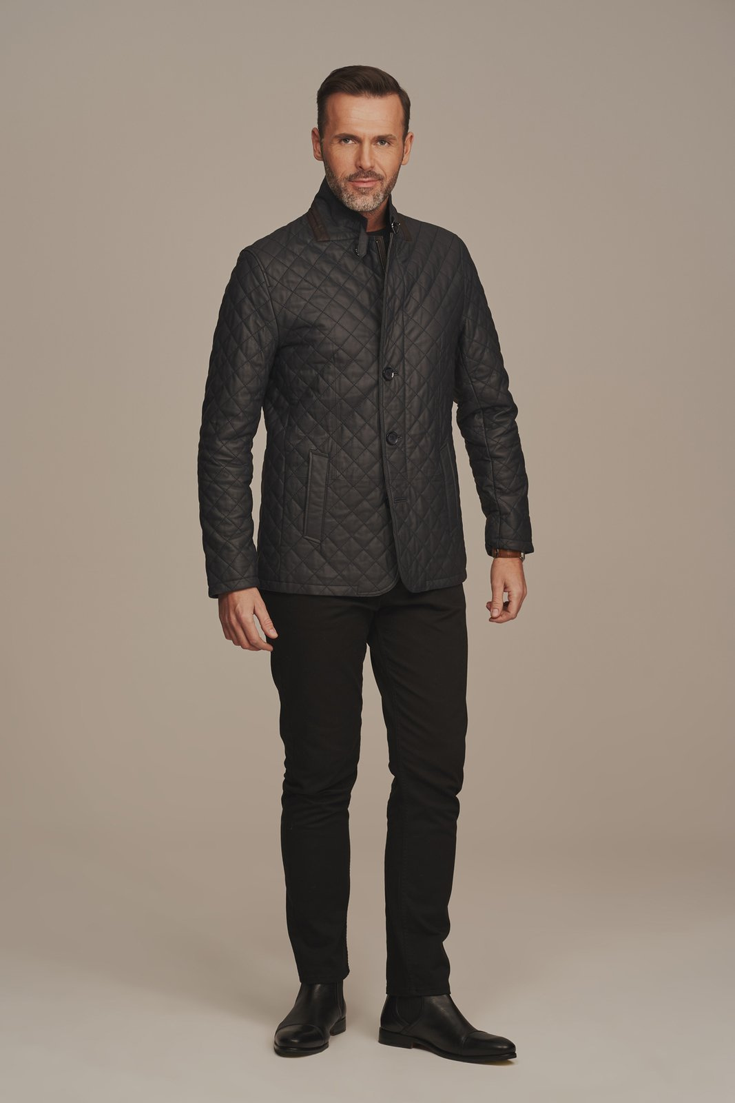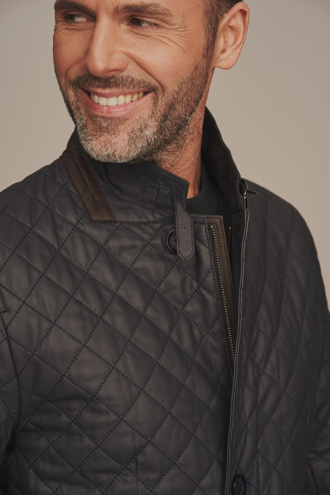 Vyriška dygsniuota odinė striukė iš natūralios avių odos – tamsiai mėlyna spalva. Vyriška dygsniuota odinė striukė iš natūralios, minkštos avių odos išsiskiria moderniu dizainu ir klasikinėmis detalėmis. Tamsiai mėlyna odinė striukė vyrams su tiesiu siluetu puikiai tinka tiek miesto stiliui, tiek kaip elegantiška alternatyva tradiciniam švarkui. Dygsniuotas paviršius suteikia tekstūros, o kokybiškas odos apdirbimas užtikrina patogumą ir ilgaamžiškumą. Striukė užsegama paslėptu užtrauktuku ir mygtukais, turi dvi įleistines kišenes, kurios išlaiko subtilų, švarų siluetą. Apykaklė-stovė su galimybe atversti klasikiniu būdu padidina universalumą ir prisitaikymą prie skirtingų įvaizdžių. Vyriška natūralios odos dygsniuota striukė skirta rudens ir pavasario sezonams, tačiau jos struktūra leidžia dėvėti ją ir pereinamuoju laikotarpiu. Tamsiai mėlyna spalva pabrėžia išskirtinumą ir išlaiko elegantišką, bet neperkrautą išvaizdą. Ši dygsniuota odinė vyriška striukė yra funkcionalus pasirinkimas vyrui, vertinančiam kokybę, komfortą ir nepriekaištingą stilių.