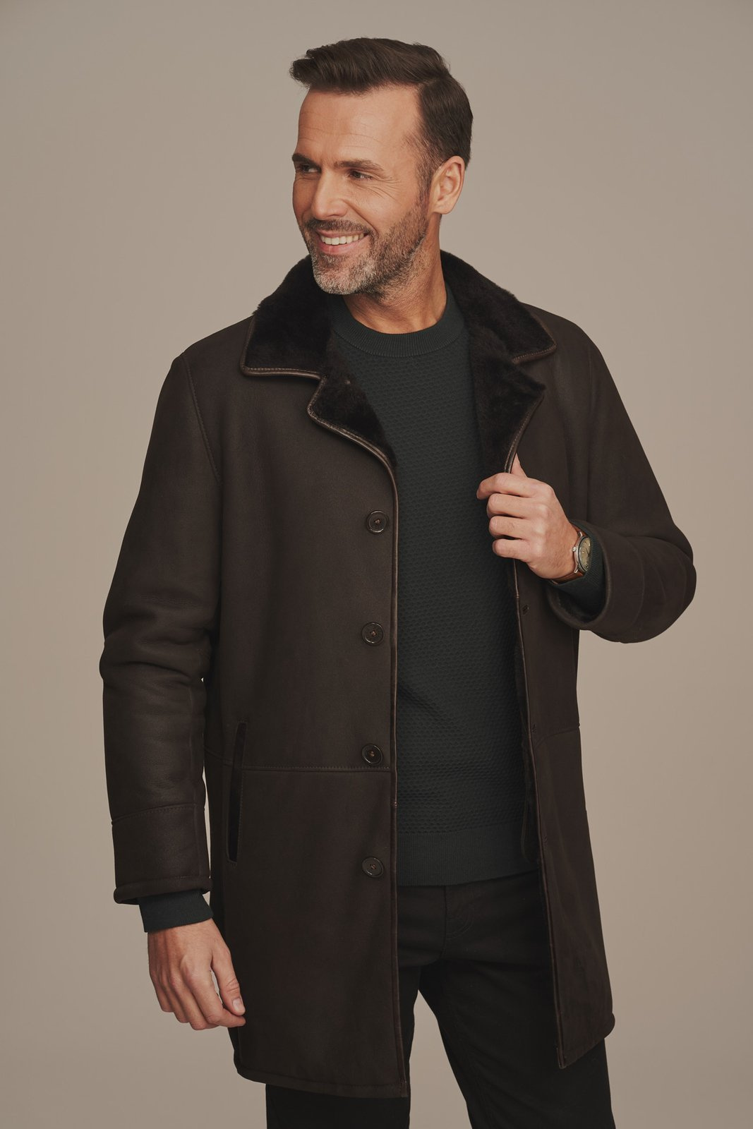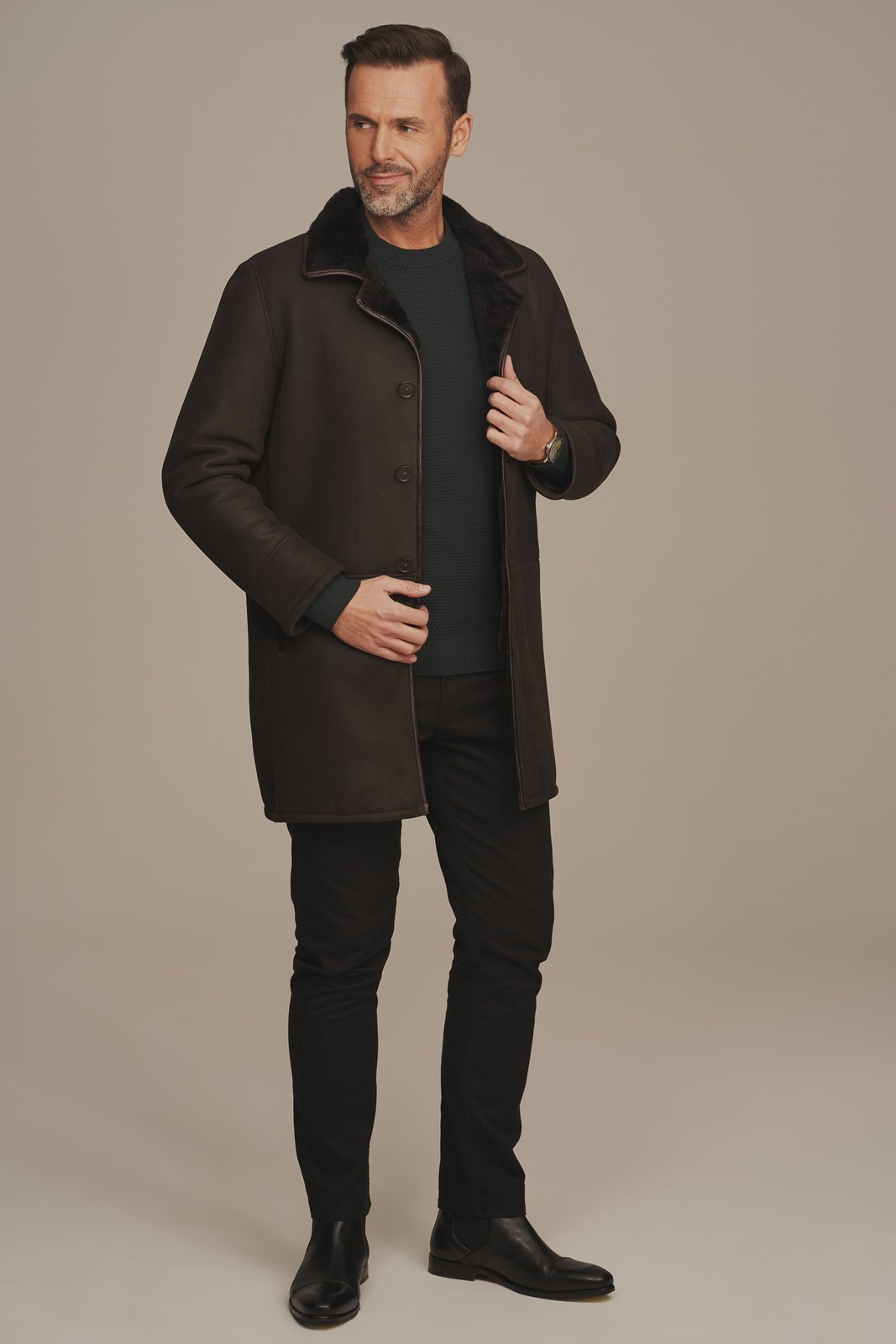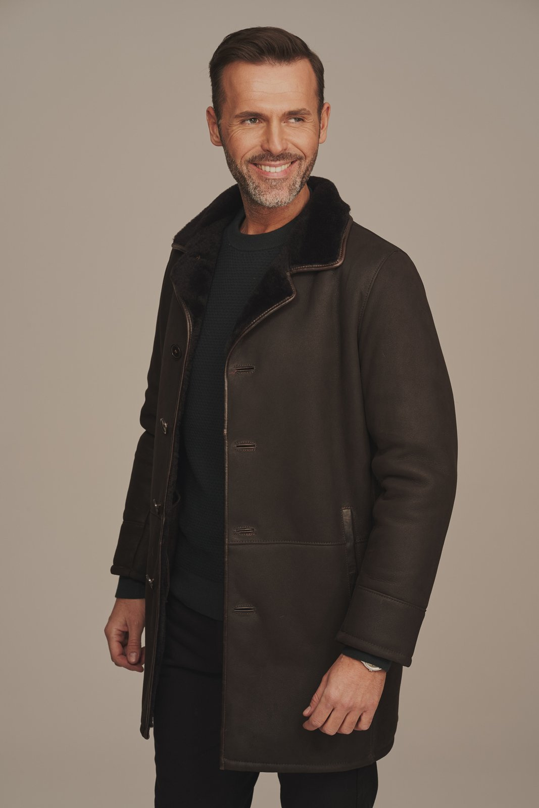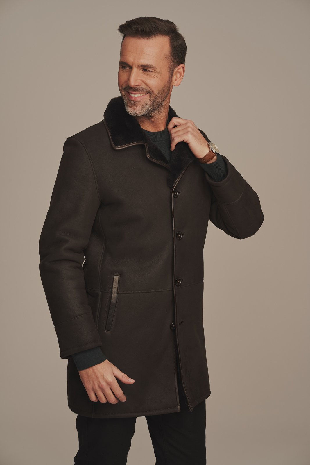 Vyriškas žieminis paltas iš natūralios avikailio odos – elegantiška šokolado rudos spalvos. Šis vyriškas žieminis paltas pagamintas iš aukščiausios kokybės natūralios avikailio odos su matinio paviršiaus apdaila, suteikiančia paltui prabangų ir patvarų įvaizdį. Šiltas ir stilingas avikailio paltas puikiai tiks vyrams, vertinantiems klasikinį, tvarkingą kirpimą ir natūralių medžiagų privalumus. Paltas pasižymi tiesiu, klasikiniu kirpimu, o odinės apvadų detalės – prie kišenių, apykaklės ir sagų – išryškina aukštą kokybės lygį ir eleganciją. Avikailio paltas, kurio ilgis siekia klubus, idealiai tinka dėvėti virš švarko ar kostiumo – tiek kasdien, tiek ypatingoms progoms. Šis paltas yra rankų darbo, pagamintas iš natūralios, aukštos kokybės avikailio odos – tai investicija į komfortą, šilumą ir išskirtinį stilių, kuris tarnaus ilgus metus.