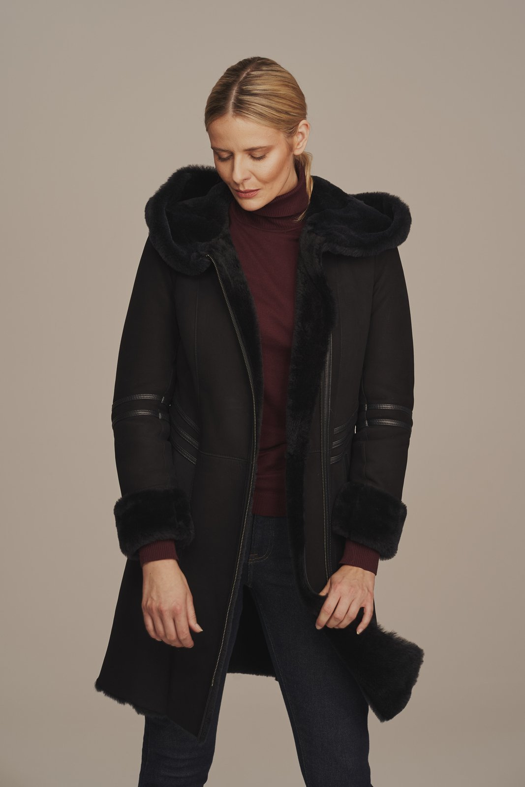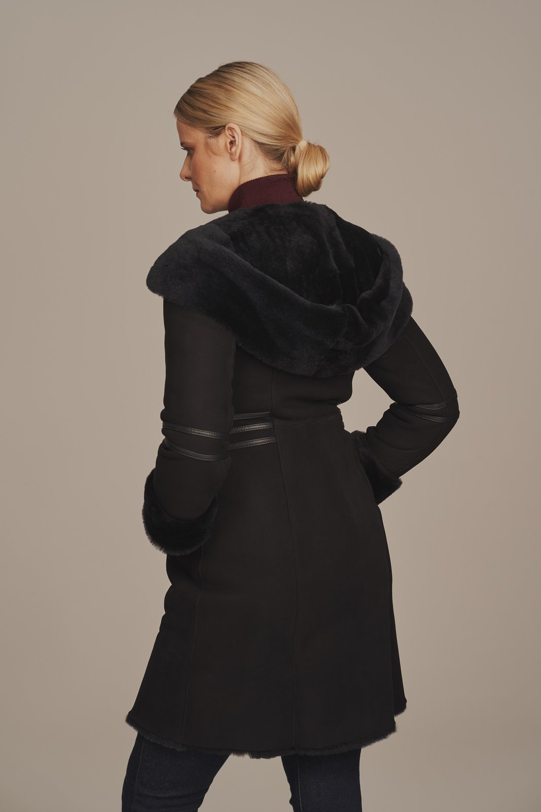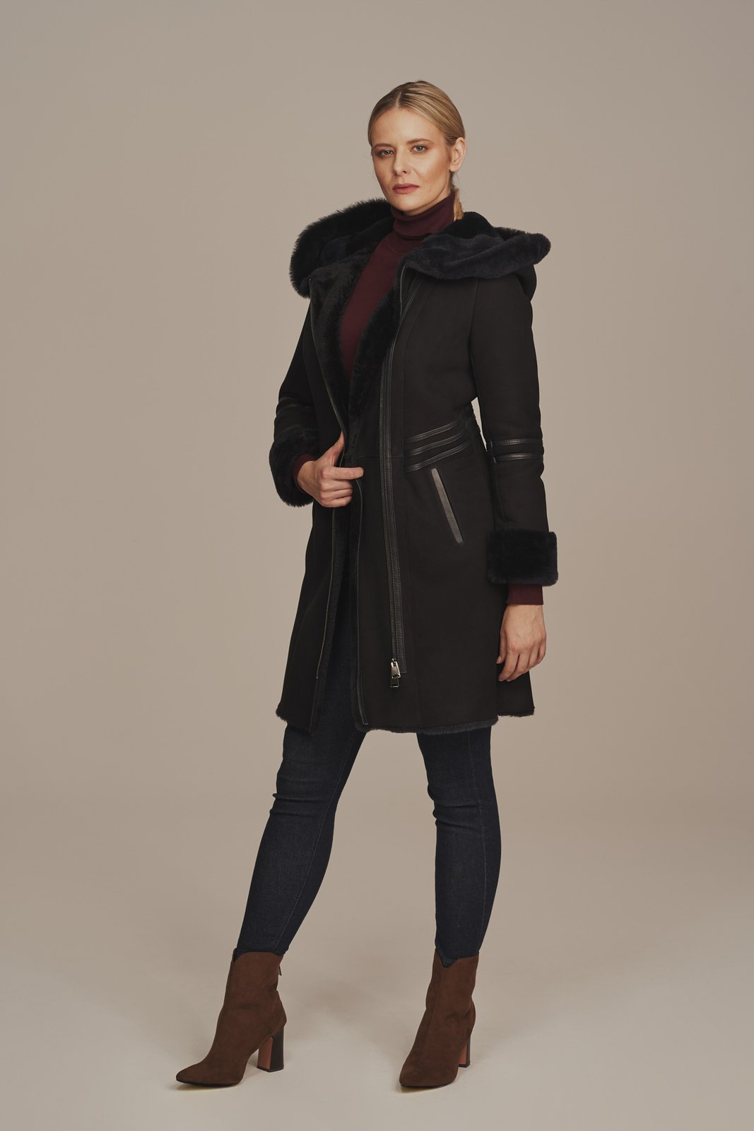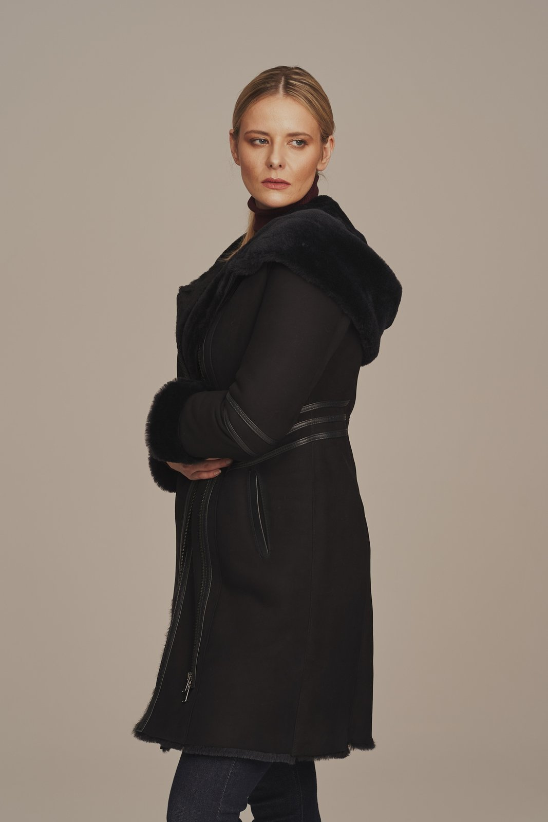 Tamsiai mėlynas moteriškas avikailio paltas iki kelių su juodu vidiniu kailiu. Moteriškas natūralios tamsiai mėlynos spalvos avikailio paltas, pasiūtas iš lengvo ir švelnaus ėriuko kailio, yra idealus pasirinkimas žiemai. Vidinė pusė išklota juodu natūraliu kailiu, kuris suteikia išskirtinį šilumos ir komforto pojūtį. Tai klasikinio kirpimo puskailis iki kelių, puikiai tinkantis tiek kasdieniam dėvėjimui, tiek išskirtinėms progoms. Modelis turi asimetriškai į šoną paslinktą užtrauktuką, kuris suteikia modernumo ir unikalumo. Dvi įleistos kišenės yra praktiškos ir neapkrauna silueto, o platus, gražiai krentantis gaubtas (kapišonas) leidžia sukurti įvairius stiliaus variantus bei apsaugo nuo vėjo ir šalčio. Dekoratyviniai natūralios odos dirželiai ties liemeniu pabrėžia figūros linijas ir vizualiai lieknina siluetą. Šis žieminis moteriškas kailinis paltas puikiai dera tiek su klasikiniu, tiek su miesto stiliaus garderobu. Tamsiai mėlynas avikailio paltas moterims – tai šiltas, ilgaamžis ir stilingas drabužis, kuris derina natūralumą, funkcionalumą ir eleganciją.