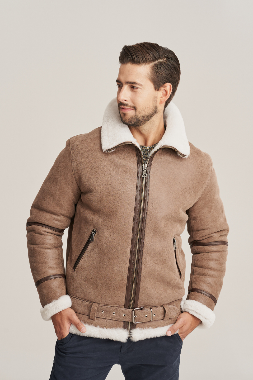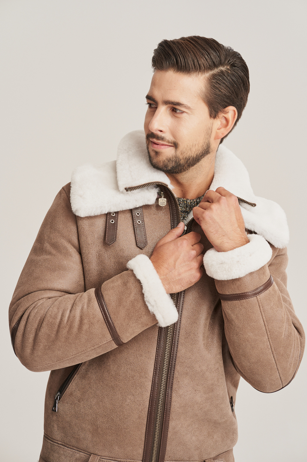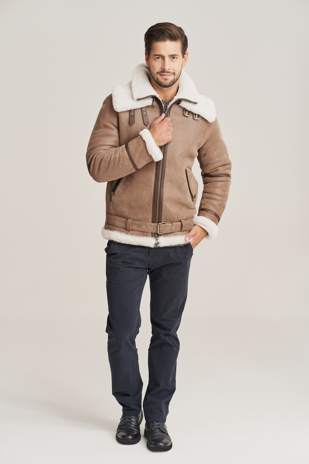 Aviatoriaus stiliaus vyriška striukė žiemai – natūralaus avikailio, bežinės spalvos, su dvigubu apykakle. Ši aviatoriaus stiliaus vyriška striukė žiemai, siekianti klubus, pagaminta iš aukščiausios kokybės natūralios ėriuko odos, bežinės spalvos, su balto avių kailio vidaus sluoksniu. Odos minkštumas, lengvumas ir šiluma garantuoja neprilygstamą komfortą net šalčiausiu metu. Striukė užsegama užtrauktuku, turi reguliuojamą diržą ties klubais, leidžiantį subtiliai pritaikyti modelį pagal figūrą. Tai – ne tik vyriška odinė striukė su kailiu, bet ir tikras stiliaus akcentas miesto vyrui. Modelis išsiskiria dviguba, nuimama apykakle, kurią galima dėvėti įvairiais būdais – tai suteikia funkcionalumo bei stiliaus įvairovės. Tamsesnės rudos spalvos licuotos odos intarpai ir odinės lamelės palei užtrauktuką suteikia kontrasto bei pabrėžia striukės aviatorišką charakterį. Tai – puikus pasirinkimas vyrui, vertinančiam autentišką dizainą, funkcionalumą ir kokybę. Ši aviatoriaus tipo avikailio striukė idealiai tinka kasdieniam dėvėjimui mieste ar savaitgalio išvykoms. Avikailio paltas vyrams – tai išliekanti vertybė kiekvieno šiuolaikinio vyro garderobe.
