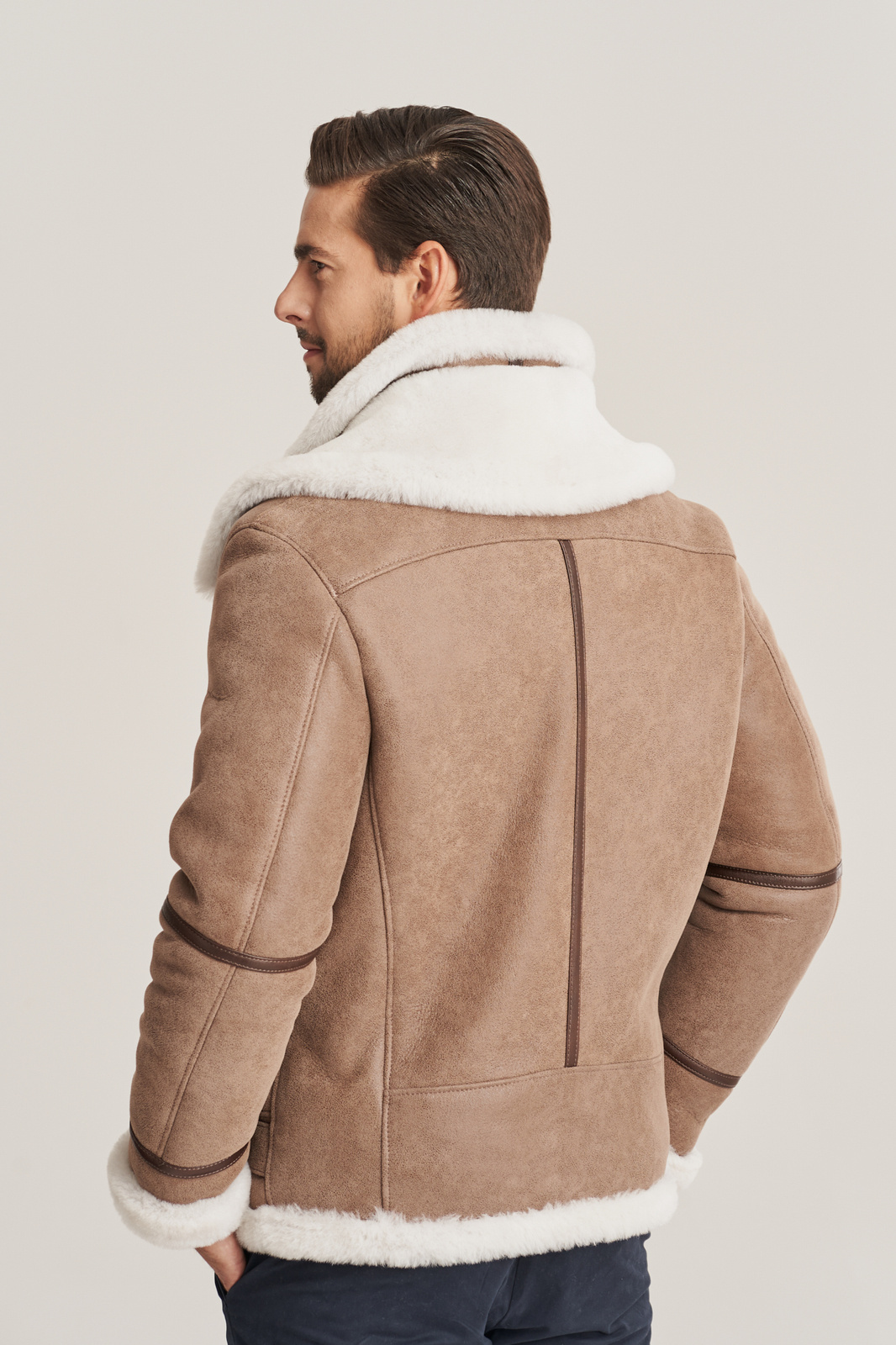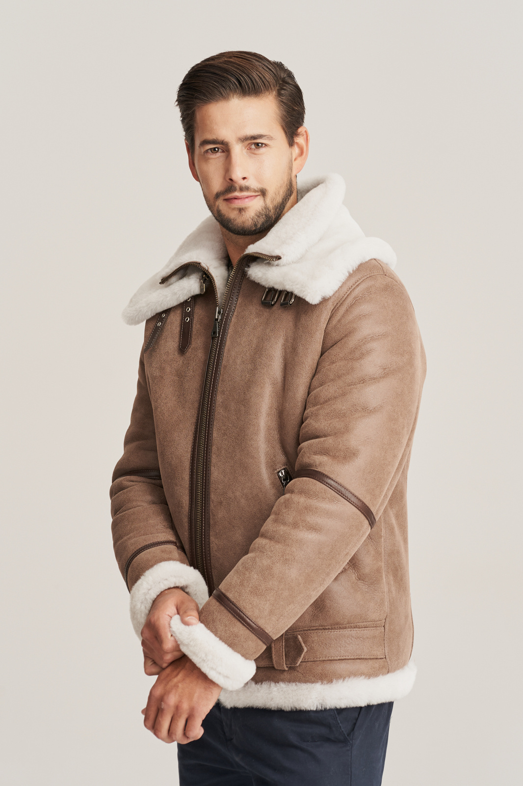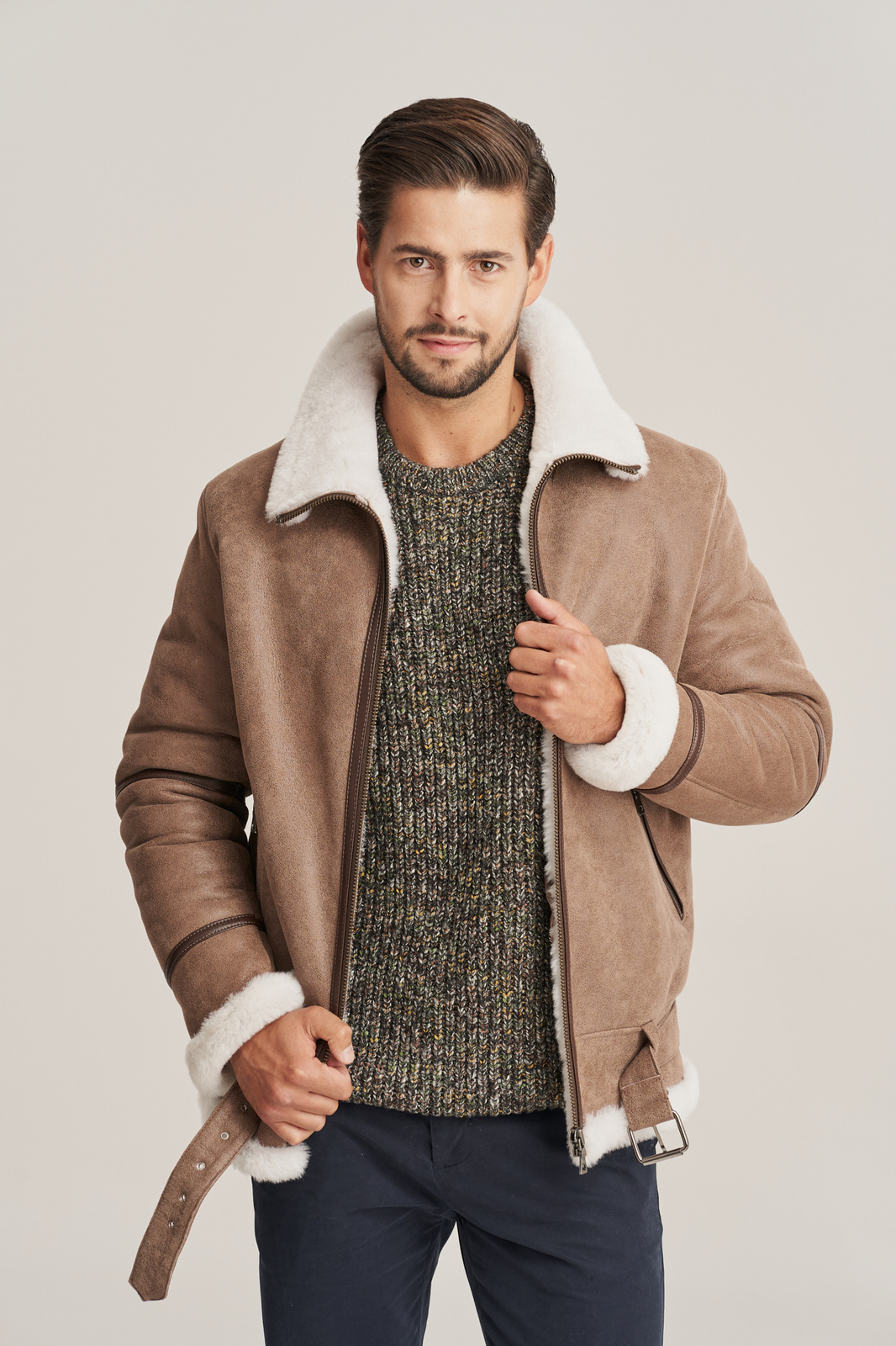 Aviatoriaus stiliaus vyriška striukė žiemai – natūralaus avikailio, bežinės spalvos, su dvigubu apykakle. Ši aviatoriaus stiliaus vyriška striukė žiemai, siekianti klubus, pagaminta iš aukščiausios kokybės natūralios ėriuko odos, bežinės spalvos, su balto avių kailio vidaus sluoksniu. Odos minkštumas, lengvumas ir šiluma garantuoja neprilygstamą komfortą net šalčiausiu metu. Striukė užsegama užtrauktuku, turi reguliuojamą diržą ties klubais, leidžiantį subtiliai pritaikyti modelį pagal figūrą. Tai – ne tik vyriška odinė striukė su kailiu, bet ir tikras stiliaus akcentas miesto vyrui. Modelis išsiskiria dviguba, nuimama apykakle, kurią galima dėvėti įvairiais būdais – tai suteikia funkcionalumo bei stiliaus įvairovės. Tamsesnės rudos spalvos licuotos odos intarpai ir odinės lamelės palei užtrauktuką suteikia kontrasto bei pabrėžia striukės aviatorišką charakterį. Tai – puikus pasirinkimas vyrui, vertinančiam autentišką dizainą, funkcionalumą ir kokybę. Ši aviatoriaus tipo avikailio striukė idealiai tinka kasdieniam dėvėjimui mieste ar savaitgalio išvykoms. Avikailio paltas vyrams – tai išliekanti vertybė kiekvieno šiuolaikinio vyro garderobe.