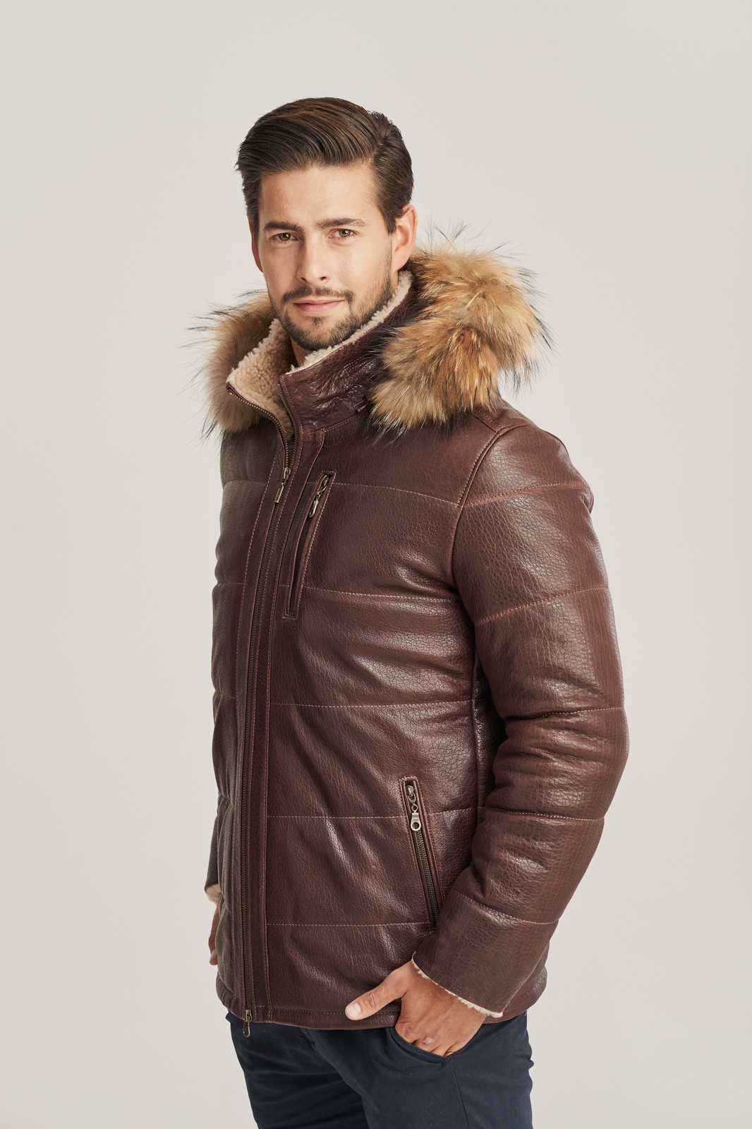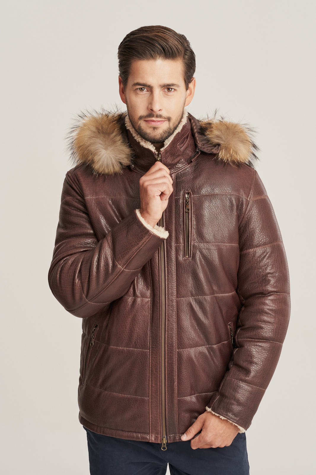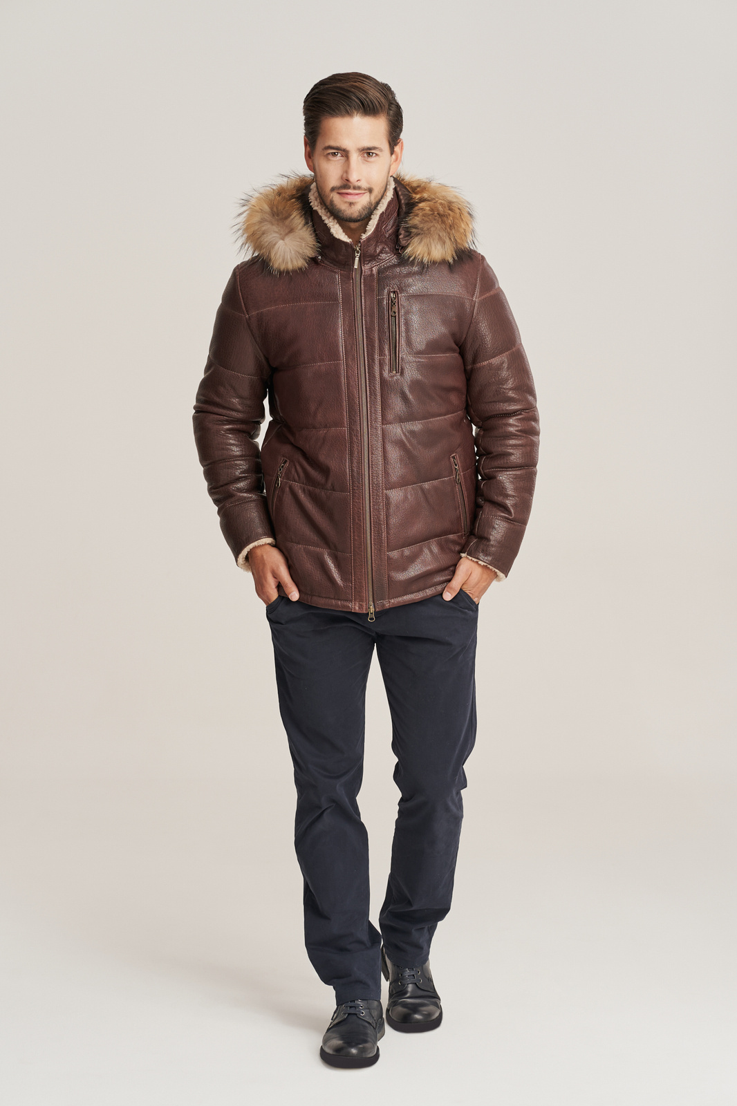 Vyriška ruda odinė žieminė striukė su kailiu ir gobtuvu – šiluma ir stilius viename