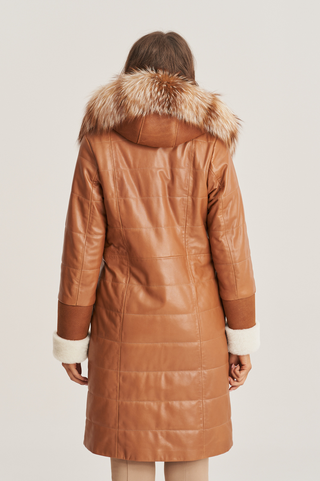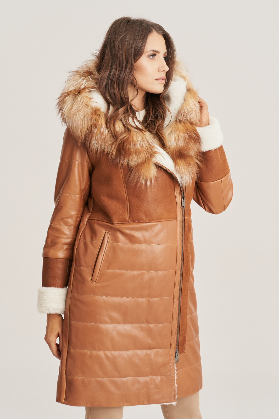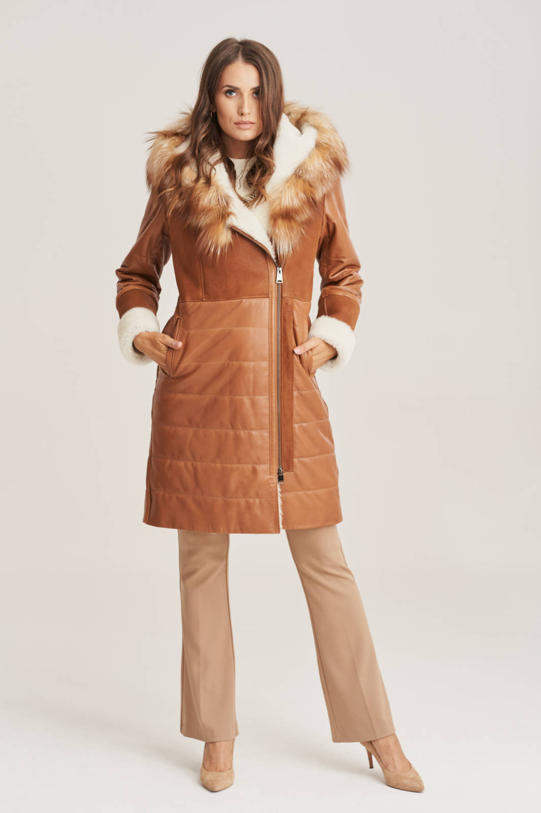 Moteriška natūralios odos žieminė striukė su kapišonu, dekoruota natūraliu lapės kailiu. Prabangi, šilta ir stilinga moteriška striukė iš natūralios avikailės odos – puikus pasirinkimas žiemos sezonui. Ši ilga striukė, siekianti virš kelių, pagaminta iš aukštos kokybės lygios ir kailinės avikailės, todėl puikiai sulaiko šilumą net ir šalčiausiomis dienomis. Striukė turi madingą, šiek tiek į šoną pasislinkusį užtrauktuką, kuris suteikia išskirtinumo. Patogios rankovės su reguliuojamu ilgiu leidžia pritaikyti striukę pagal poreikį. Švelniai priglundantis siluetas pabrėžia moteriškas formas. Natūralios odos striukė moterims su kailiu – tai elegancija, komfortas ir išskirtinis dizainas viename. Puikiai tinka tiek kasdieniam dėvėjimui, tiek ypatingoms progoms.