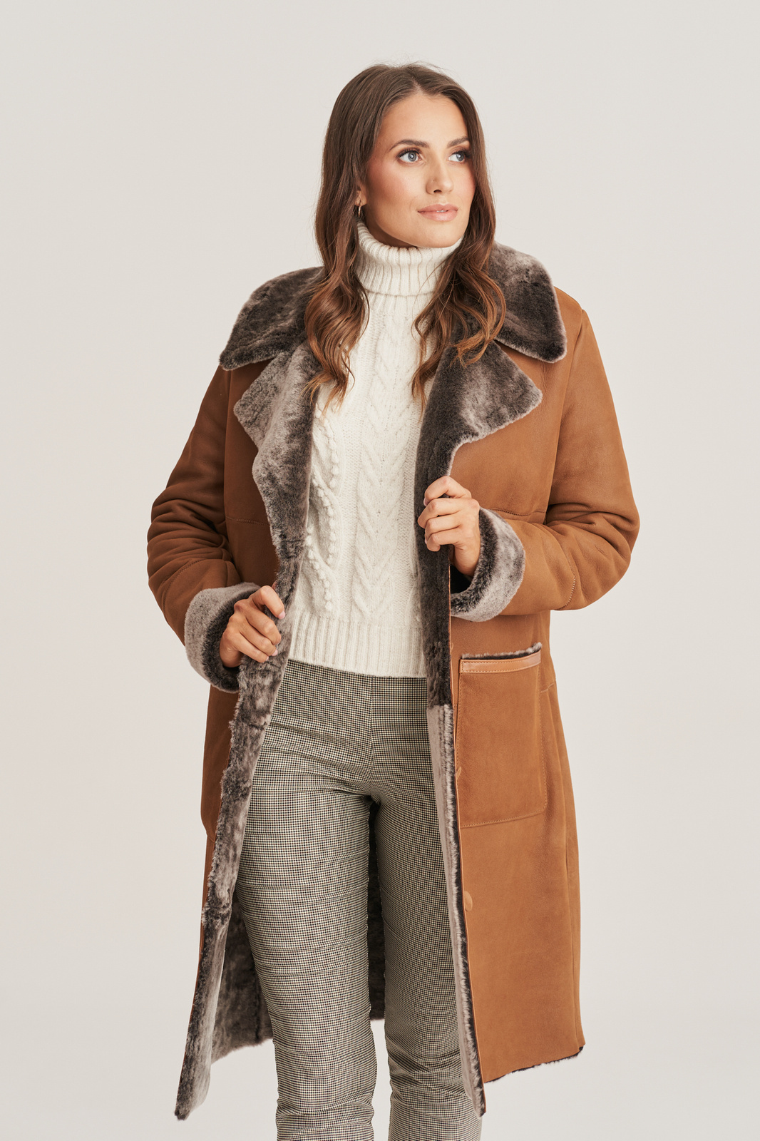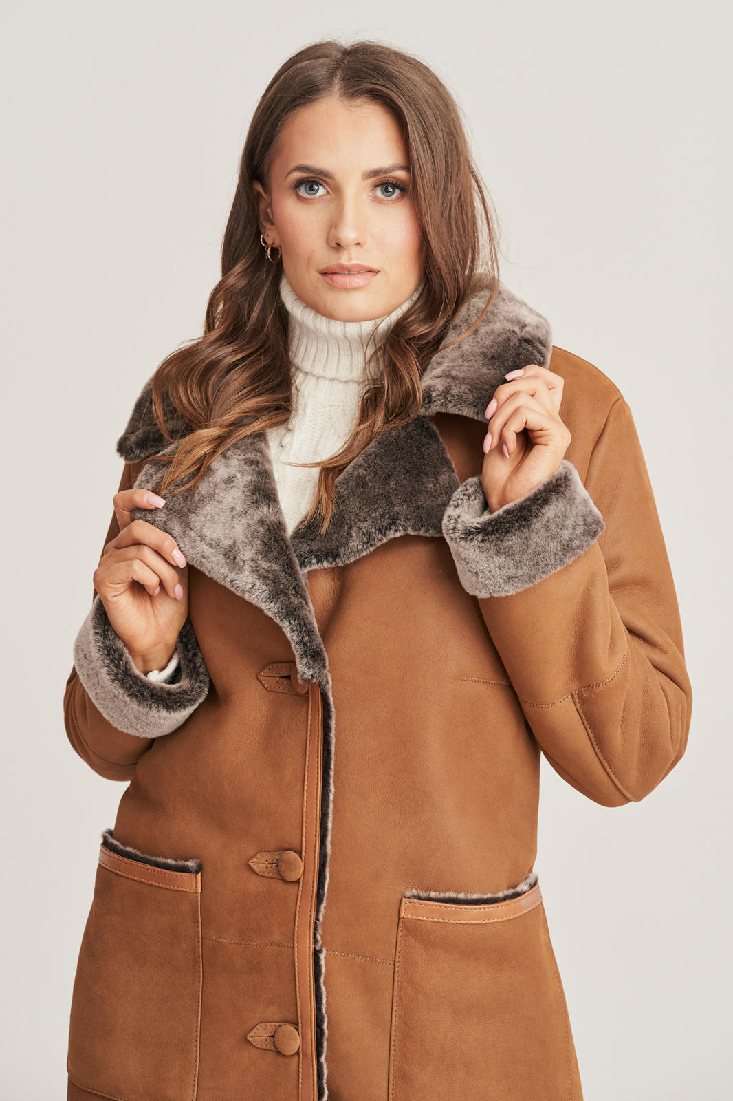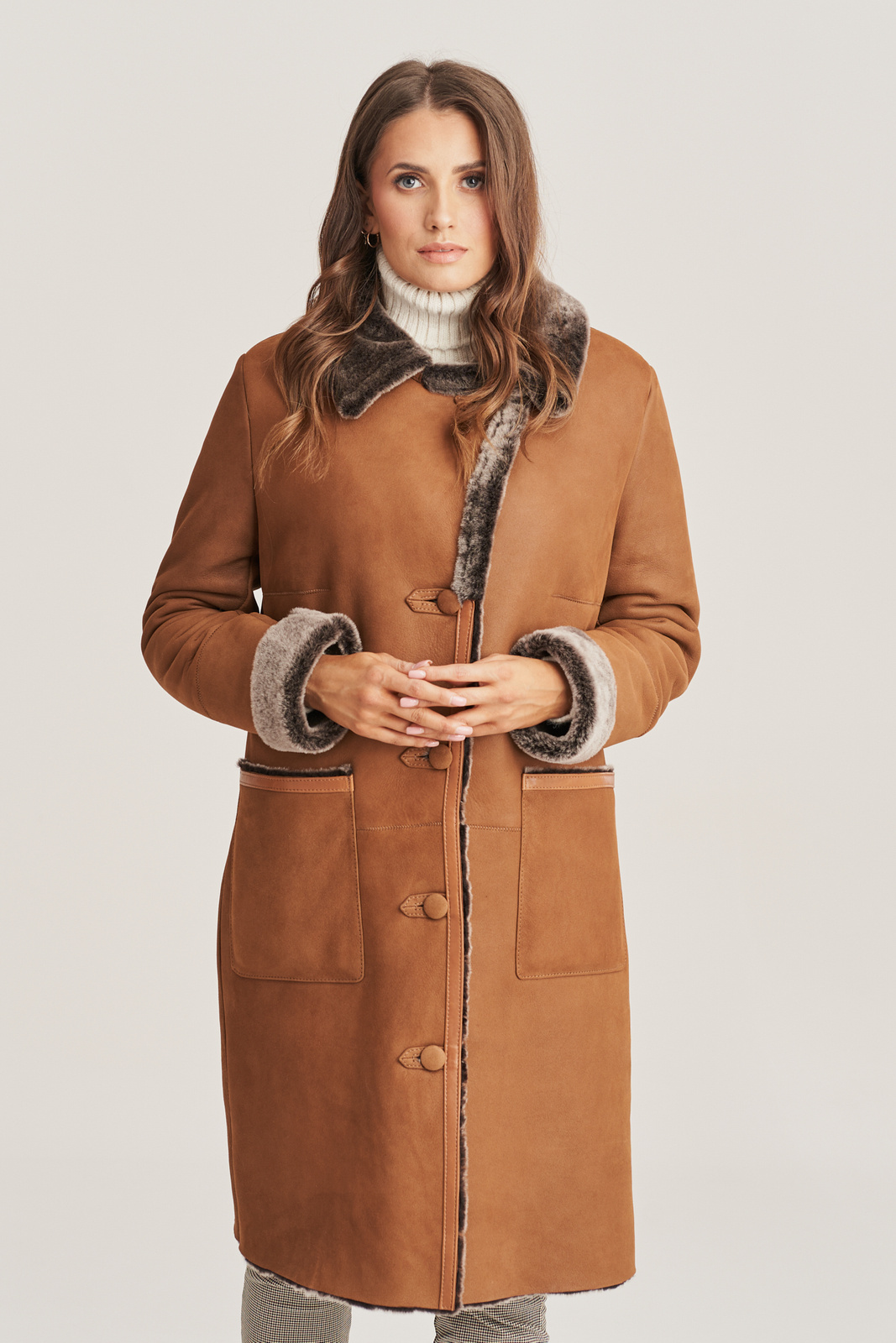 Avikailio kailin moterims rudos spalvos – natūralios odos ilgas žieminis kailinukas iki kelių. Šiltas ir stilingas avikailio kailin moterims rudos spalvos, pasiūtas iš aukštos kokybės, impregnuotos natūralios ėriuko odos. Kailinukas lengvas, minkštas ir puikiai sulaiko šilumą net šalčiausiomis žiemos dienomis. Šviesesnė vilna vidinėje pusėje suteikia kontrasto ir elegancijos. Kailinukas užsegamas sagomis, turi dvi įleistines kišenes ir klasikinį apykaklės sprendimą su galimybe užsegti iki pat kaklo. Galima šiek tiek reguliuoti rankovių ilgį – patogu individualiam pritaikymui. Tai ilgas, tiesaus kirpimo moteriškas avikailio paltas, kuris puikiai dera tiek prie kasdienės, tiek prie elegantiškesnės žiemos aprangos. Rudos spalvos kailinukas yra universalus pasirinkimas kiekvienos moters žiemos garderobe.