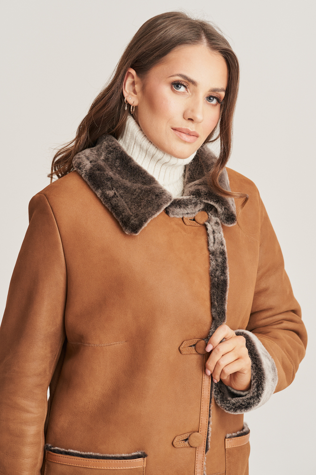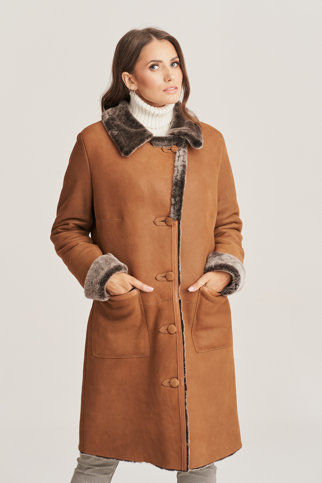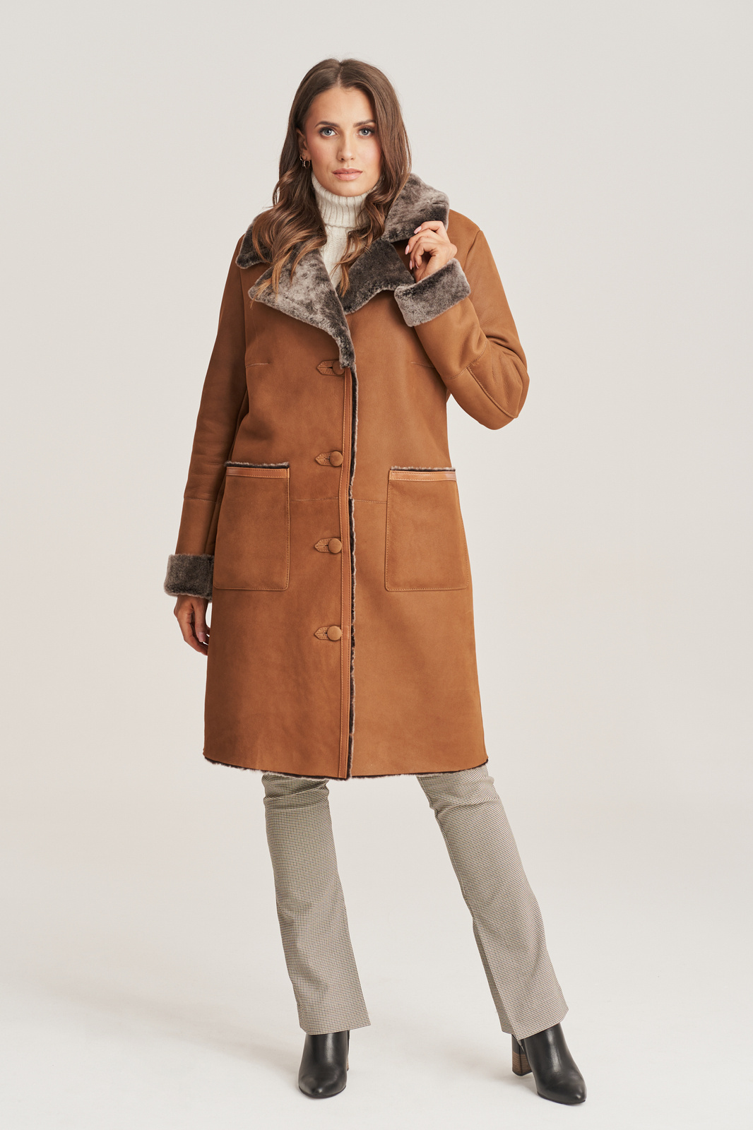 Avikailio kailin moterims rudos spalvos – natūralios odos ilgas žieminis kailinukas iki kelių. Šiltas ir stilingas avikailio kailin moterims rudos spalvos, pasiūtas iš aukštos kokybės, impregnuotos natūralios ėriuko odos. Kailinukas lengvas, minkštas ir puikiai sulaiko šilumą net šalčiausiomis žiemos dienomis. Šviesesnė vilna vidinėje pusėje suteikia kontrasto ir elegancijos. Kailinukas užsegamas sagomis, turi dvi įleistines kišenes ir klasikinį apykaklės sprendimą su galimybe užsegti iki pat kaklo. Galima šiek tiek reguliuoti rankovių ilgį – patogu individualiam pritaikymui. Tai ilgas, tiesaus kirpimo moteriškas avikailio paltas, kuris puikiai dera tiek prie kasdienės, tiek prie elegantiškesnės žiemos aprangos. Rudos spalvos kailinukas yra universalus pasirinkimas kiekvienos moters žiemos garderobe.