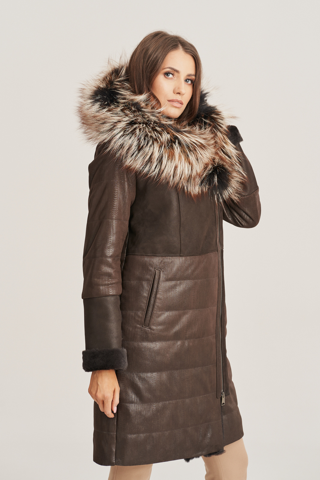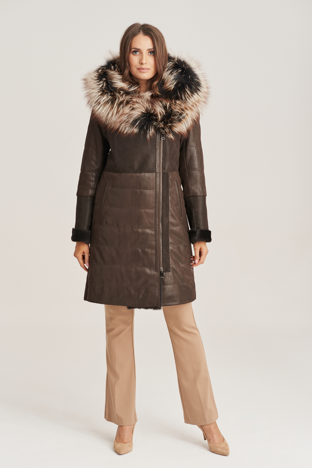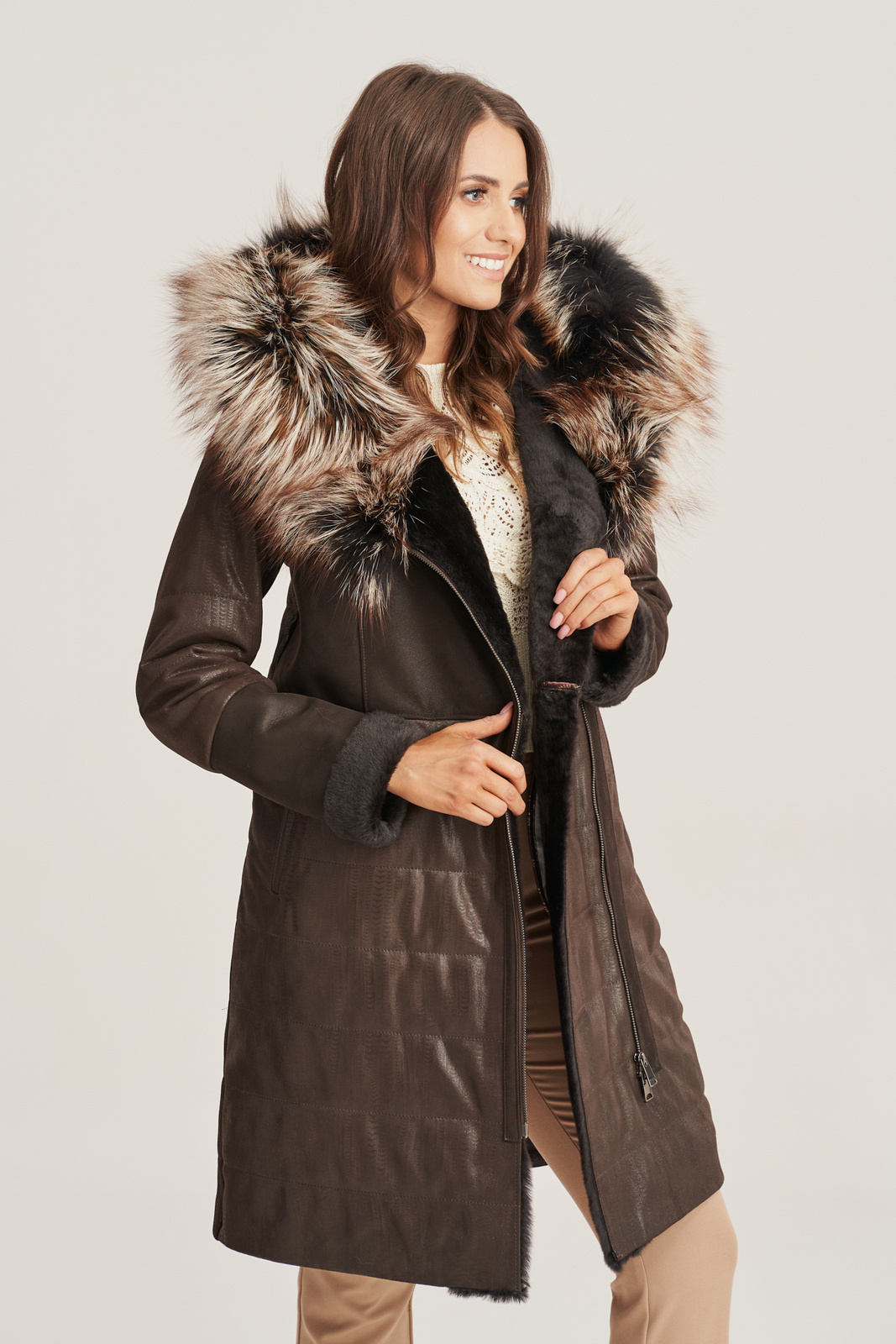 Moteriška odinė žieminė striukė iki kelių tamsiai rudos spalvos. Ši moteriška odinė žieminė striukė iki kelių pagaminta iš minkštos, natūralios avikailio odos tamsiai rudos spalvos. Žieminė odinė striukė moterims turi dvi įleidžiamas kišenes, kurios suteikia patogumo kasdienėms reikmėms. Gražus, plačiai išskleistas gobtuvas su tikru lapių kailiu – tai puikus pasirinkimas, jei ieškote žieminės odinės striukės su kailiu, kuri užtikrintų šilumą ir stilių. Šilta odinė striukė pasižymi šiek tiek liemenuotu siluetu ir užsegama užtrauktuku, šiek tiek pasuktame į šoną, suteikiančiu originalumo. Moteriškas kailinis paltas, pagamintas iš odos su storu pamušalu, garantuoja apsaugą nuo šalčio ir žvarbių žiemos dienų. Jei norite patogios ir šiltos striukės su gobtuvu, ši žieminė striukė iki kelių – puikus pasirinkimas jūsų garderobui.
