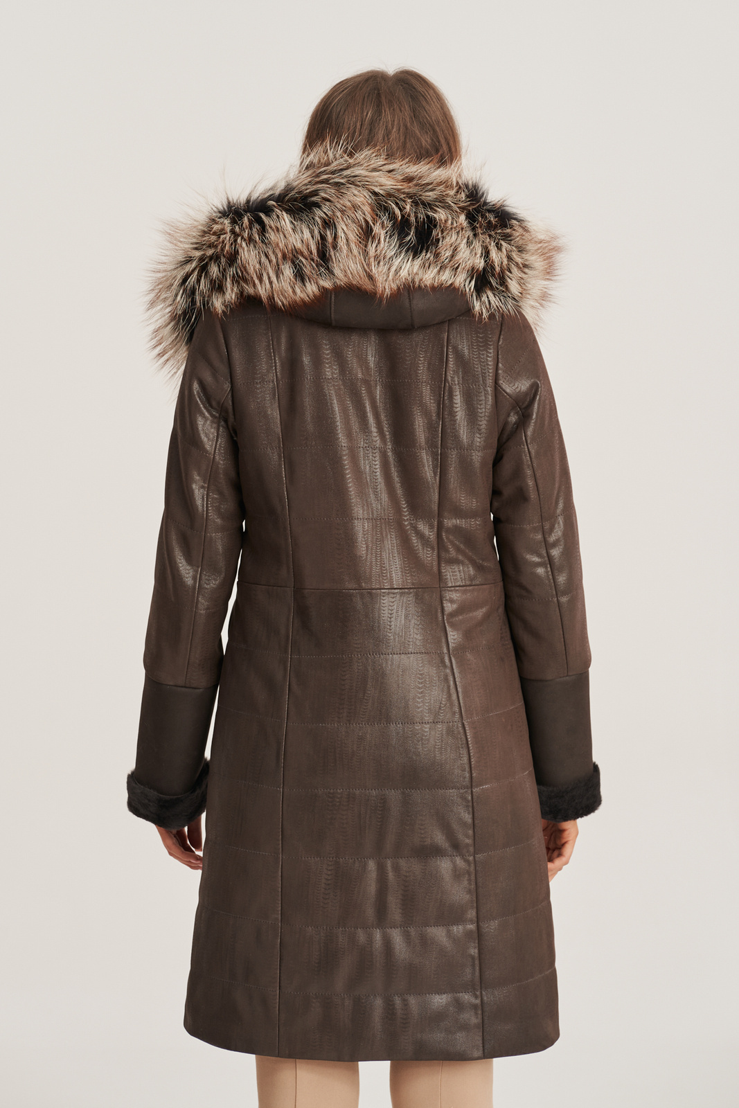 Moteriška odinė žieminė striukė iki kelių tamsiai rudos spalvos
