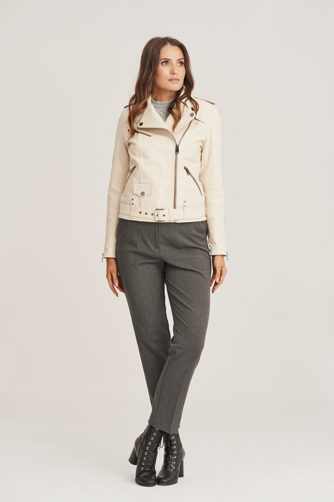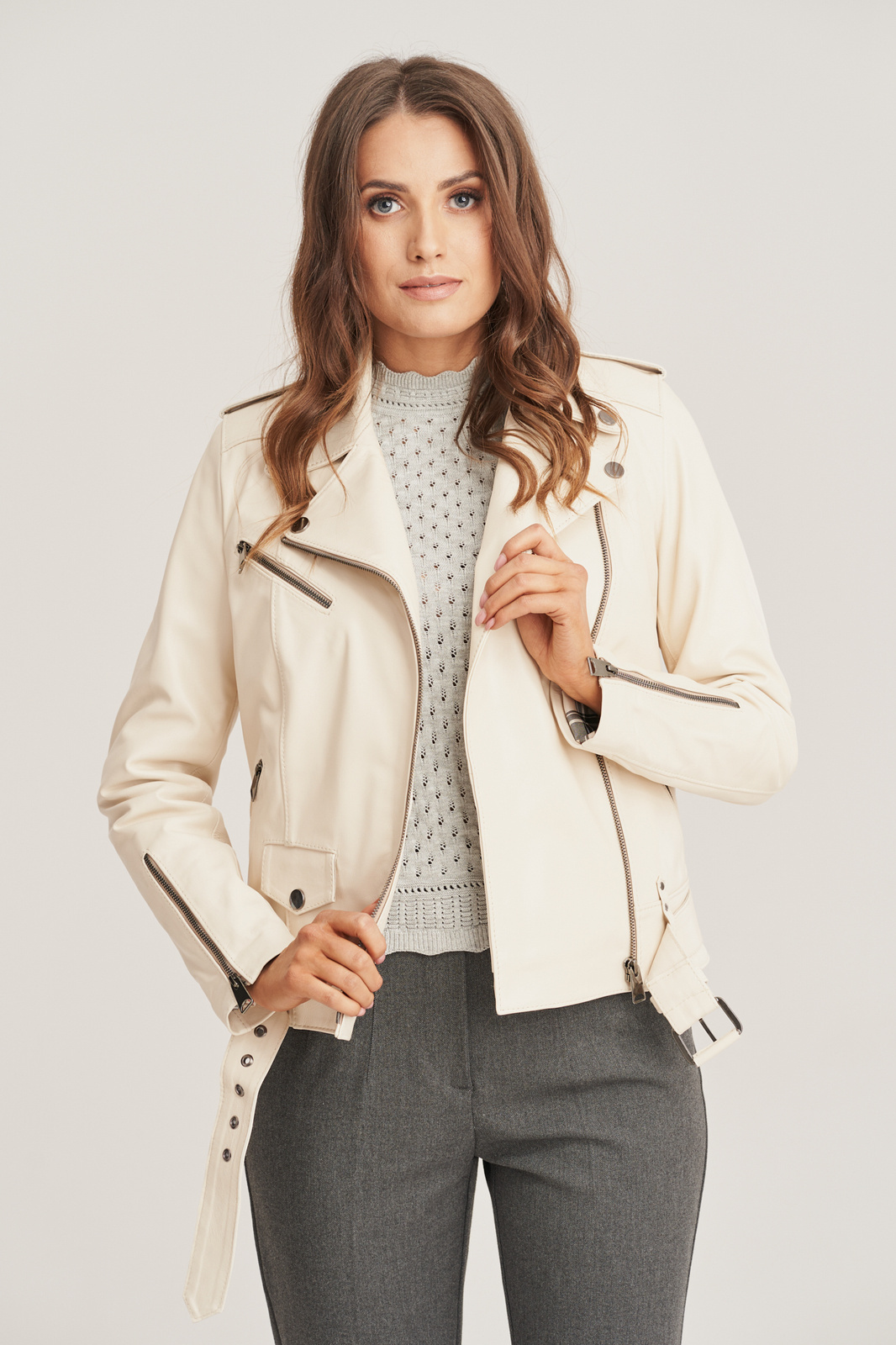 Moteriška šviesi odinė striukė iš natūralios avikailio odos – smėlio spalvos. Ši moteriška odinė striukė, pasiūta iš aukštos kokybės natūralios avikailio odos, išsiskiria šviesia smėlio spalva ir subtiliu blizgesiu. Avikailio oda yra lengva, švelni ir pralaidi orui, todėl tai idealus pasirinkimas pavasariui ir rudeniui. Aviatoriaus tipo modelis, pasižymintis užtrauktuku, šiek tiek paslinktu į šoną, sukuria modernų siluetą, kuris dera su tiek kasdieniu, tiek elegantišku įvaizdžiu. Striukė turi tris praktiškas kišenes su užtrauktukais, dekoratyvinius pečių pagonus ir diržą ties klubais, kuris pabrėžia liemens liniją ir leidžia reguliuoti modelio prigludimą. Metalinės spaudės senovinio sidabro spalvos suteikia papildomo charakterio ir šiek tiek rokeriško stiliaus. Klasikinis kirpimas ir kruopščiai apgalvotos detalės leidžia lengvai derinti šią natūralios odos striukę su džinsais, kelnėmis ar suknelėmis. Dėl savo universalaus dizaino ir aukštos kokybės medžiagų ši šviesi moteriška odinė striukė tampa ne tik stilingu, bet ir ilgaamžiu garderobo akcentu, kuris nepraras aktualumo keičiantis sezonams.
