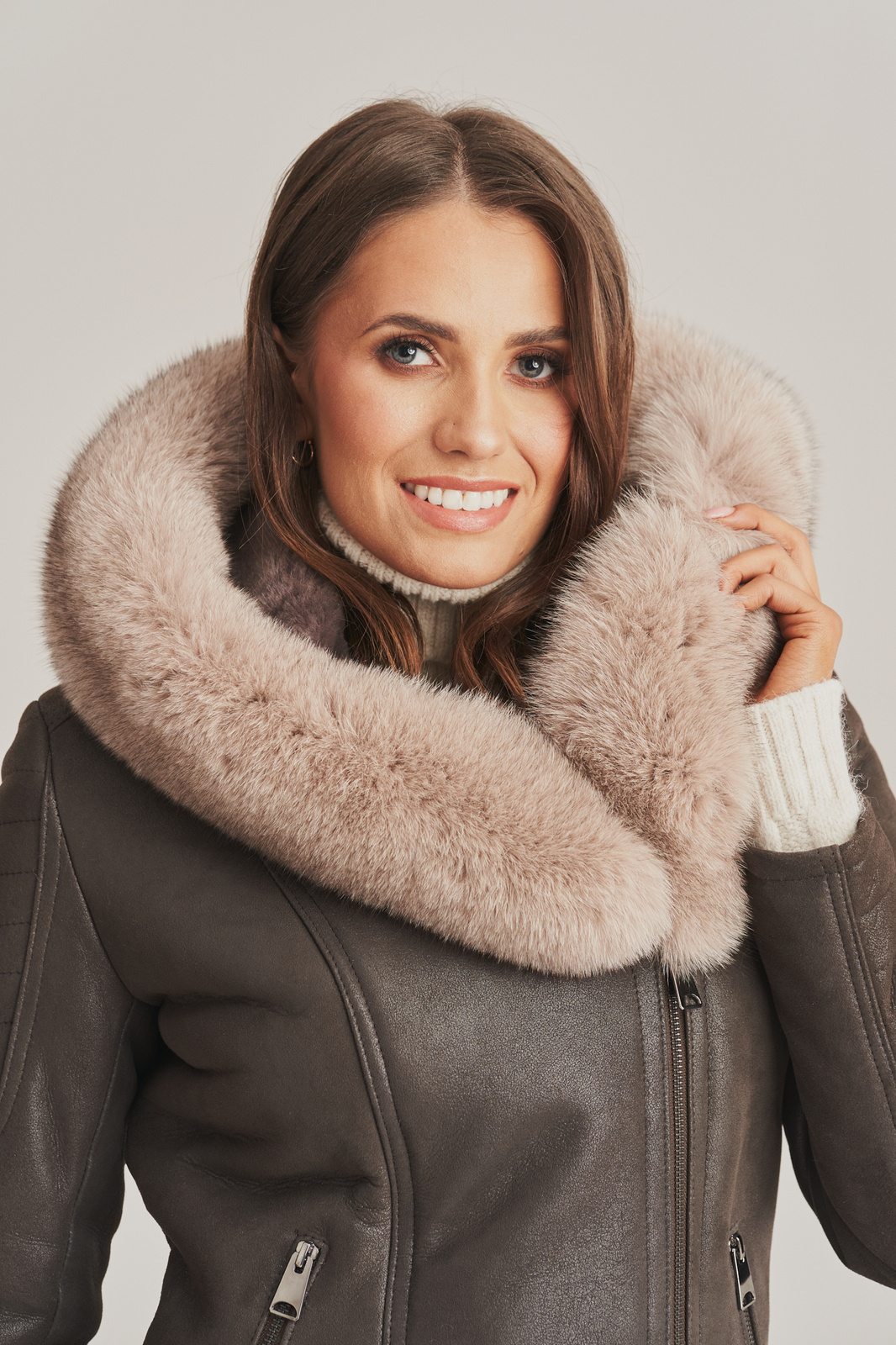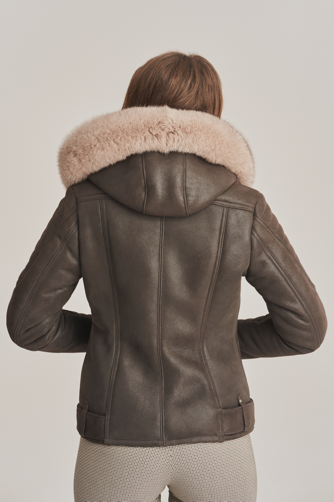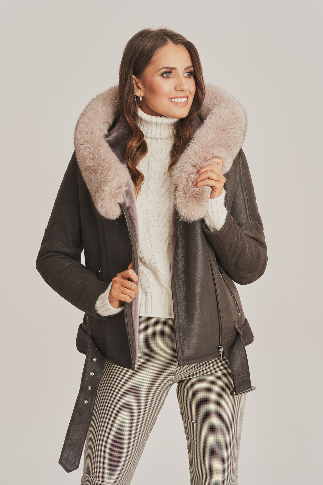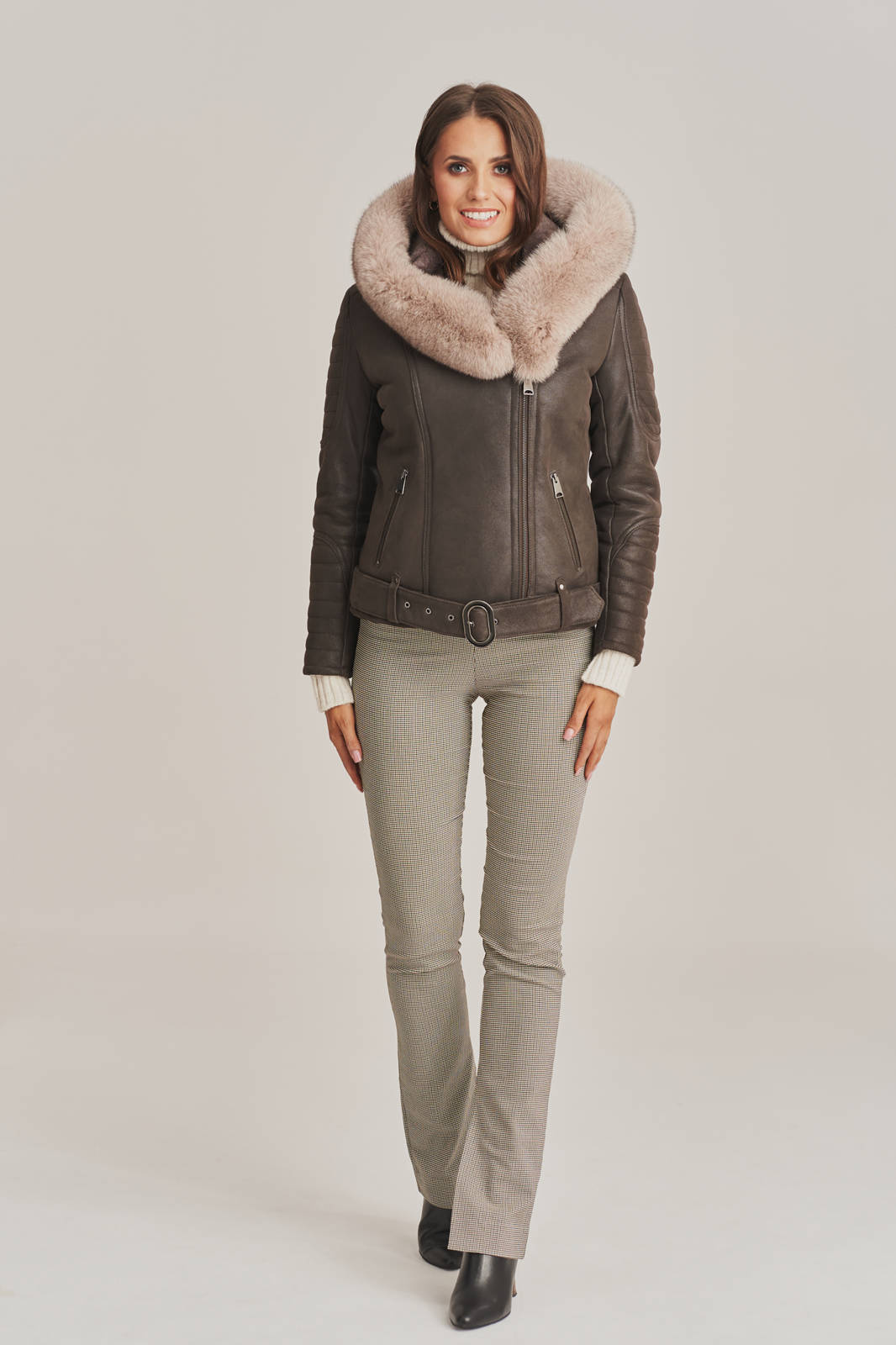 Moteriškas trumpas avikailio paltas su kailiu – natūralios odos, šiltas, rudos spalvos, su lapės kailio kapišonu. Natūralus avikailio paltas, pasiūtas iš aukštos kokybės, lengvos, impregnuotos natūralios avies odos avikailio. Šis trumpas kailinis paltas moterims – praktiškas ir stilingas pasirinkimas rudens bei žiemos sezonui. Modelis – šiltas avikailis, trumpintas iki klubų, su įleistinėmis kišenėmis šonuose. Dirželis su sagtimi ties klubais leidžia reguliuoti platumą pagal siluetą. Užsegimas užtrauktuku ir dekoratyviniai siuvinėjimai ties rankovėmis suteikia modeliui originalumo bei šiuolaikinio charakterio. Kapišonas puoštas natūraliu šviesesnio atspalvio lapės kailiu, kuris išryškina kontrastą ir suteikia prabangos įvaizdį. Pilnas avikailis paltas, be dirbtinių medžiagų – šilumą užtikrina natūrali avikailio struktūra. Toks rankų darbo avikailis paltas tinka net šalčiausioms žiemos dienoms. Avikailis žiemai, kuris ne tik šildo, bet ir išlieka madingas daugelį sezonų. Dėl natūralių medžiagų paltas pasižymi ilgaamžiškumu, kvėpuojančiomis savybėmis bei komfortu.
