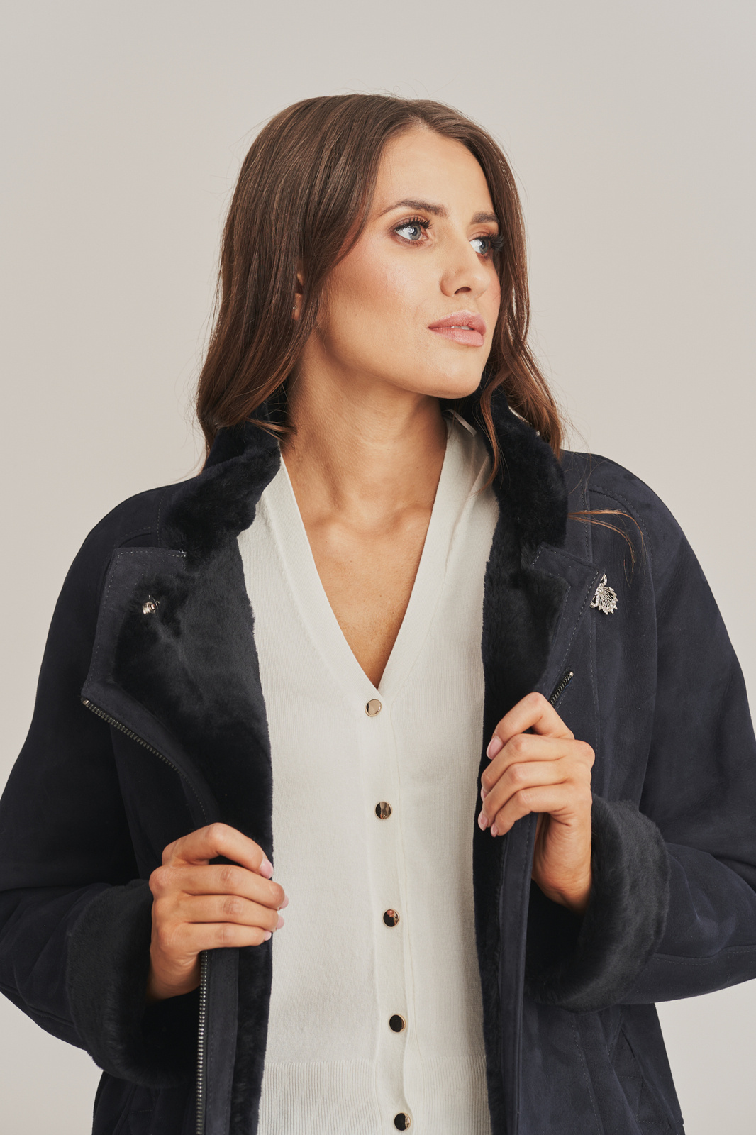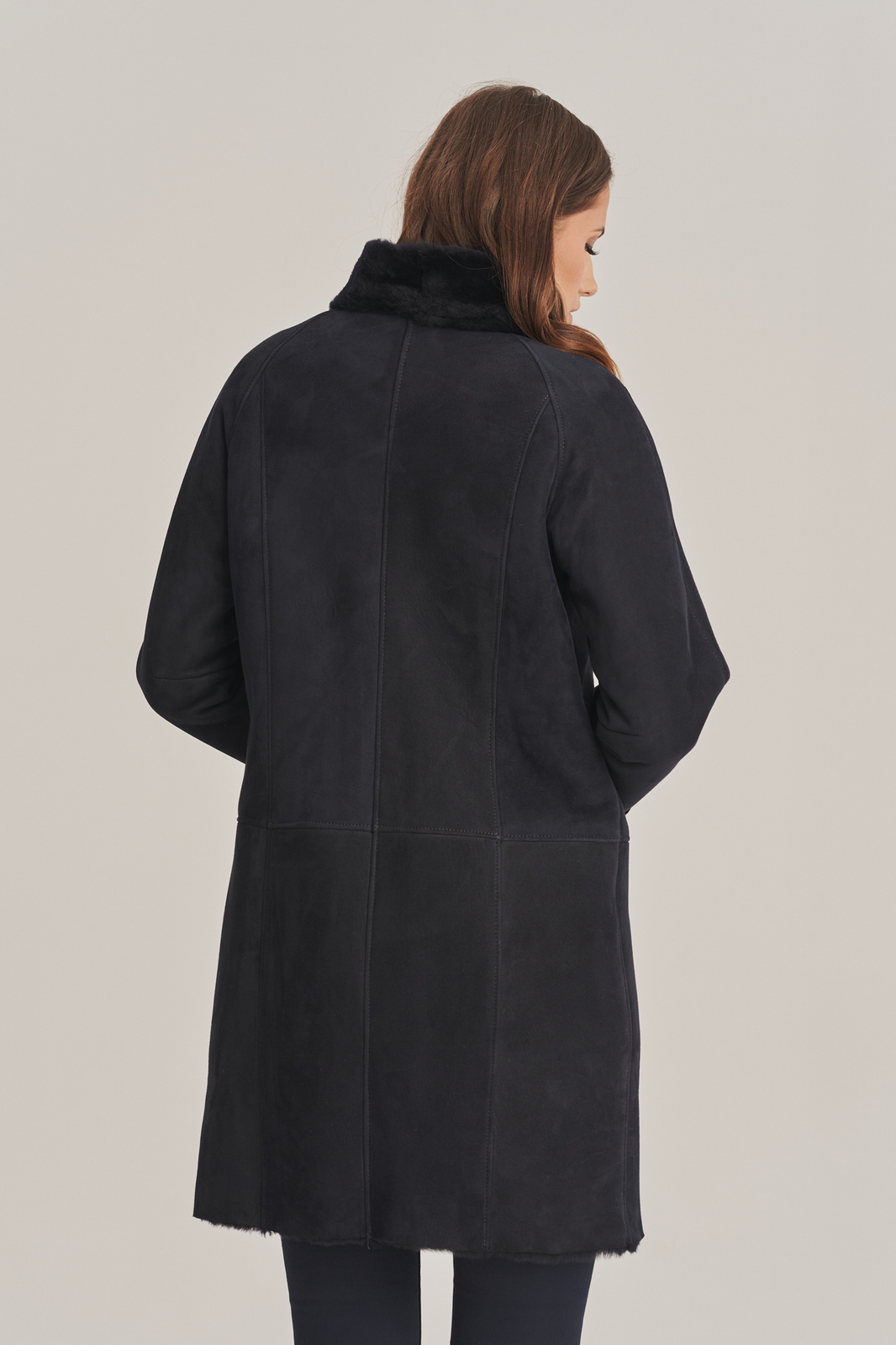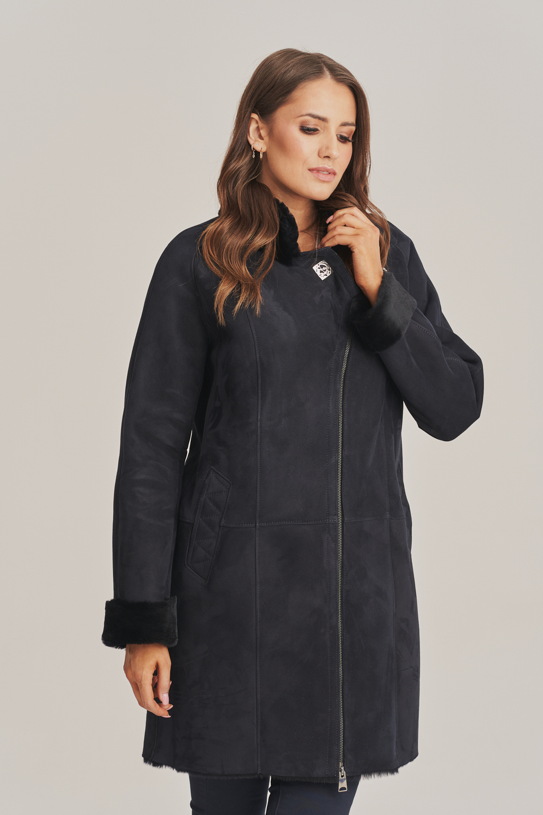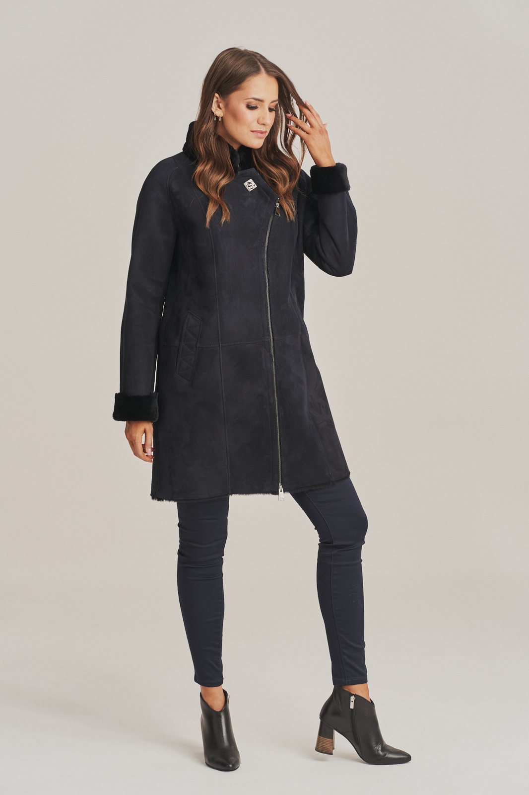 Moteriškas tamsiai mėlynas avių kailio paltas