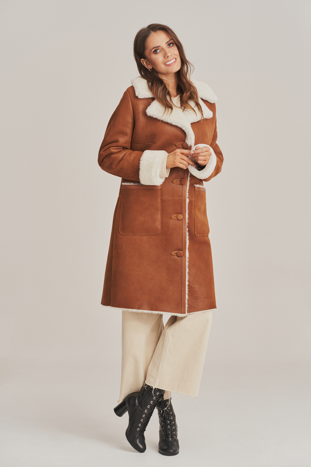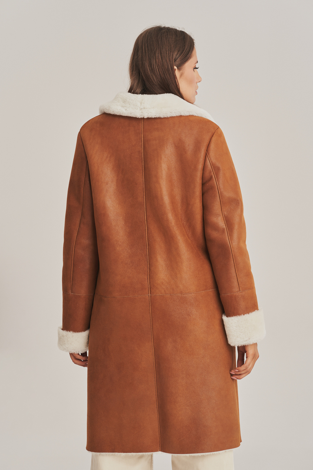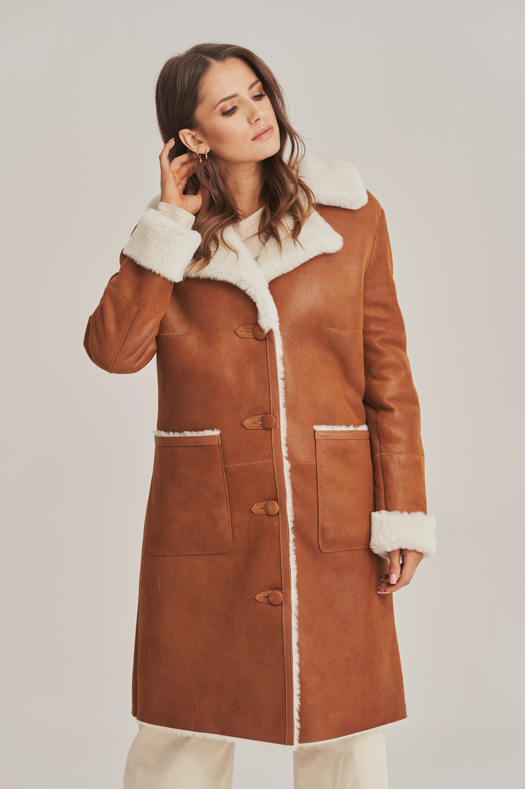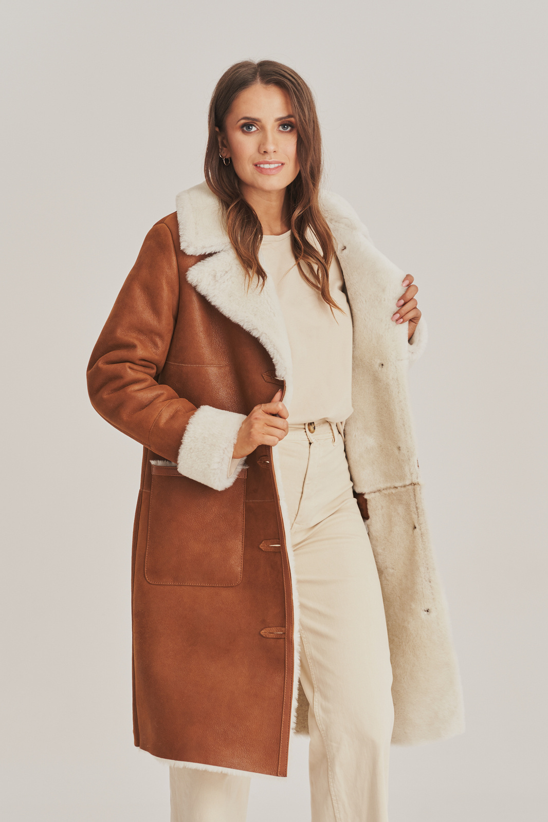 Elegantiškas moteriškas kailinis paltas iki kelių, iš natūralios rudos avikailės su balta vilna. Klasikinio dizaino, elegantiškas moteriškas kailinis paltas, puikiai tinkantis šaltajam metų sezonui. Siūtas iš aukštos kokybės, impregnuotos natūralios avikailės – rudos spalvos oda su kontrastine balta vilna viduje užtikrina išskirtinį stilių ir šilumą. Tiesaus kirpimo modelis iki kelių, užsegamas patogiais mygtukais. Paltas turi dvi išorines, prisiūtas kišenes. Apykaklė gali būti užsegama prie pat kaklo – tai apsaugo nuo vėjo ir šalčio. Rankovių ilgis gali būti šiek tiek reguliuojamas pagal poreikį. Kailinis paltas yra lengvas, patogus ir malonus dėvėti – puikus pasirinkimas kasdienai žiemą. Tai nesenstantis, universalus moteriškas kailinis paltas, kuris tarnaus ilgus metus – puikus derinys tarp funkcionalumo, komforto ir elegancijos.
