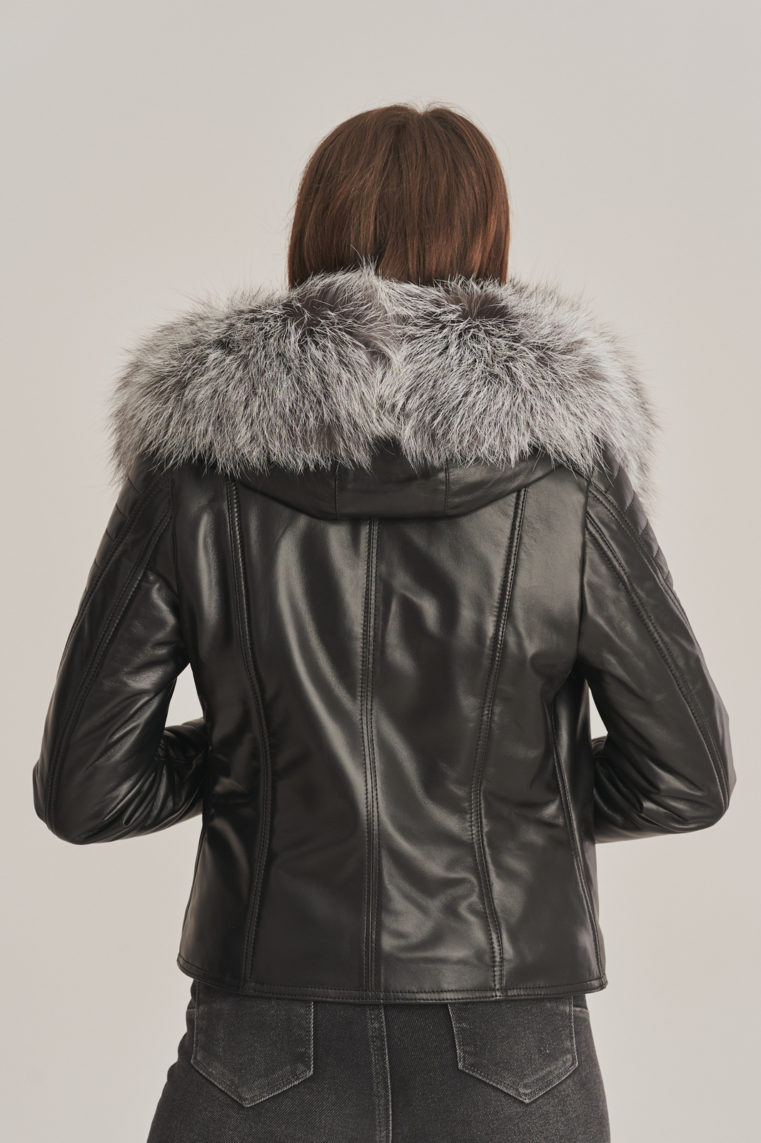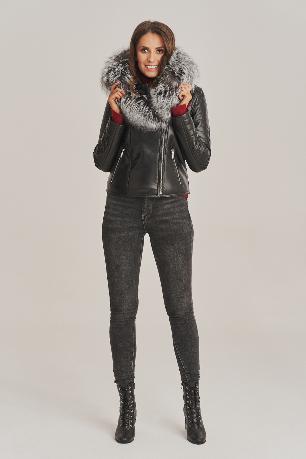 Moteriška natūralios avies odos ramoneskos stiliaus striukė – juoda, lengvai pamušta, su kapišonu ir nuimama natūralia lapės kailio apdaila. Ši moteriška natūralios avies odos ramoneskos stiliaus striukė juodos spalvos pasižymi itin minkšta ir aukštos kokybės avies oda, užtikrinančia komfortą ir stilingą išvaizdą. Striukė yra lengvai pamušta kokybiška pamušalu, kuris suteikia papildomą šilumą vėsesnėmis dienomis, išlaikant lengvumą ir eleganciją. Modelyje yra dvi kišenės su užtrauktukais, kurios suteikia praktiškumo ir švarų dizainą. Didelis kapišonas dekoruotas nuimama natūralia sidabrinės lapės kailio apdaila, kuri ne tik papildo išvaizdą, bet ir suteikia universalumo bei papildomo šilumos pojūčio. Detalės, tokios kaip siuvinėjimai ant rankovių, suteikia striukei unikalumo ir modernumo. Ši natūralios odos ramoneskos stiliaus striukė, lengvai pamušta moterims, puikiai tinka tiek elegantiškiems, tiek rock stiliaus deriniams. Tai puikus pasirinkimas moterims, siekiančioms suderinti funkcionalumą ir madingą išvaizdą, ypač šaltuoju metų laiku.