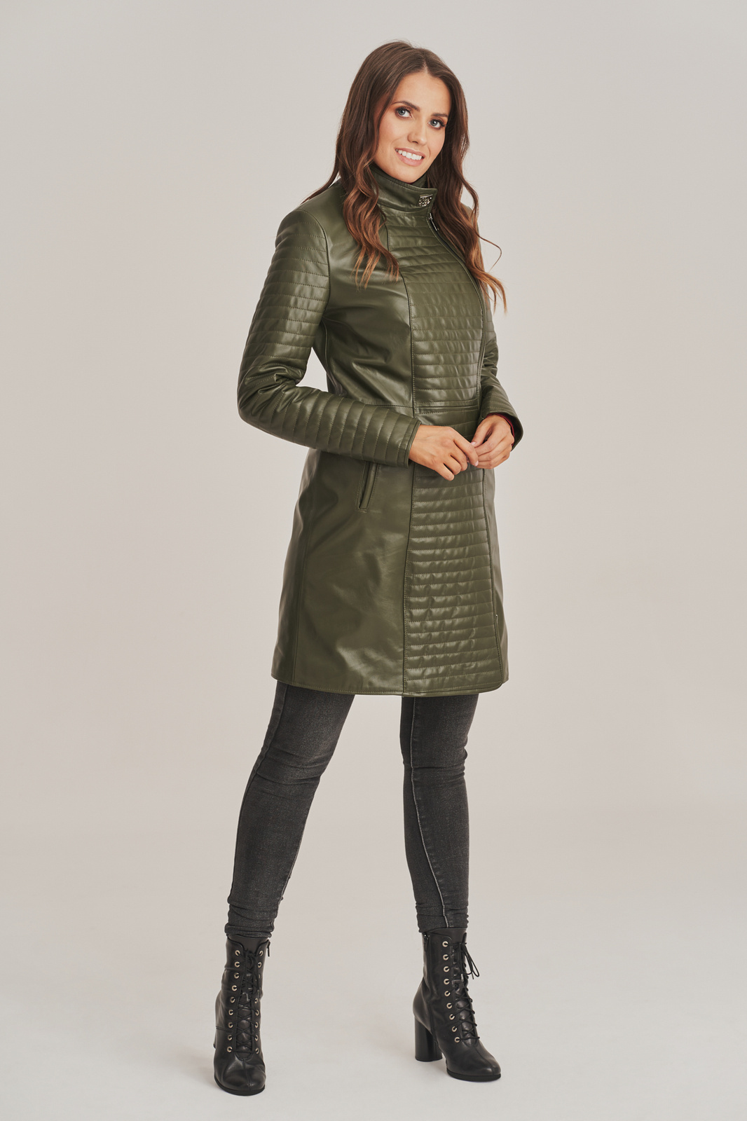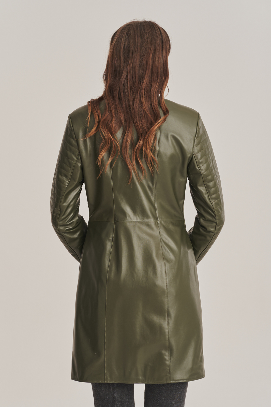 Moters natūralios odos paltas alyvuogių žalios spalvos