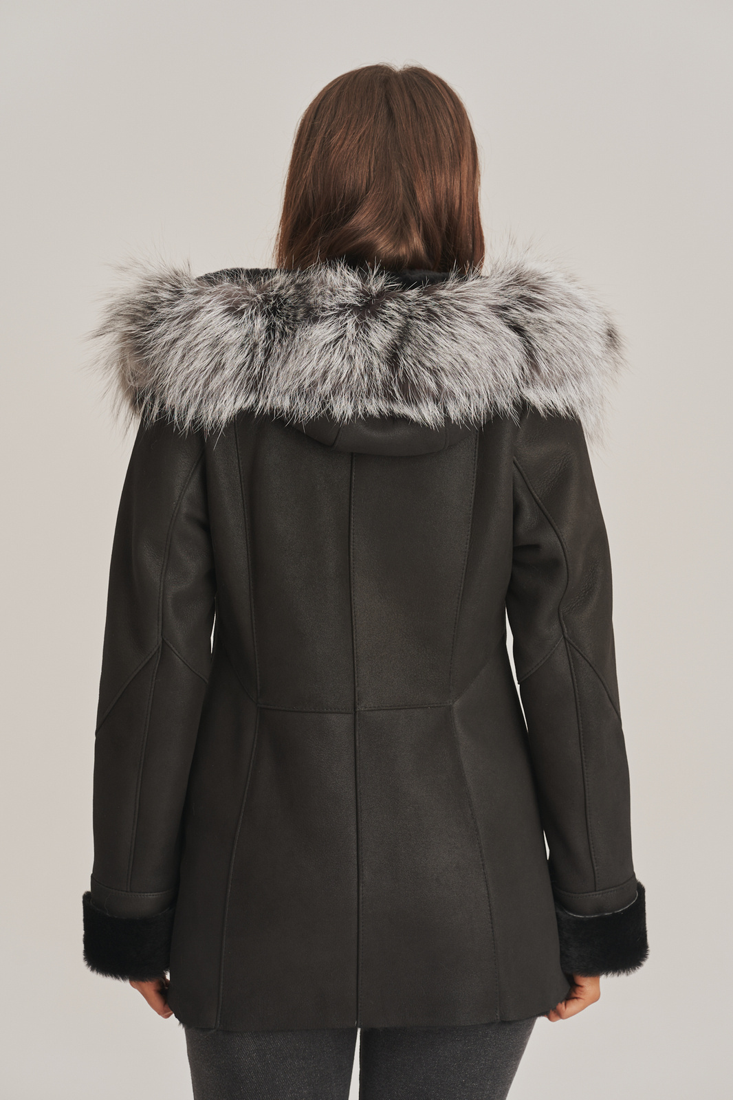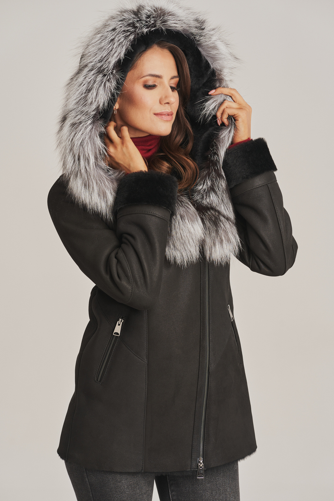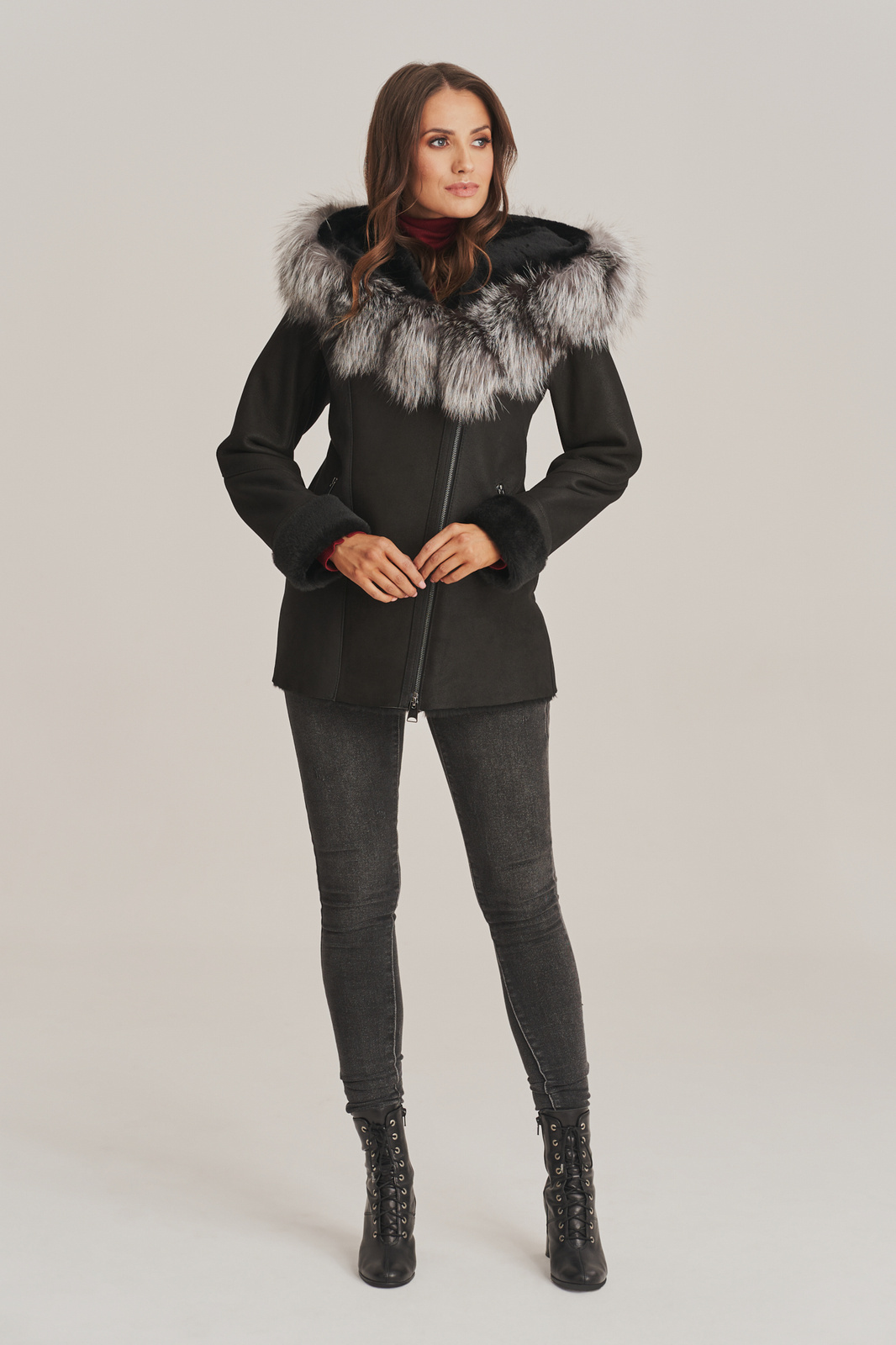 Moteriškas avikailis su lapės kailiu, juodos spalvos