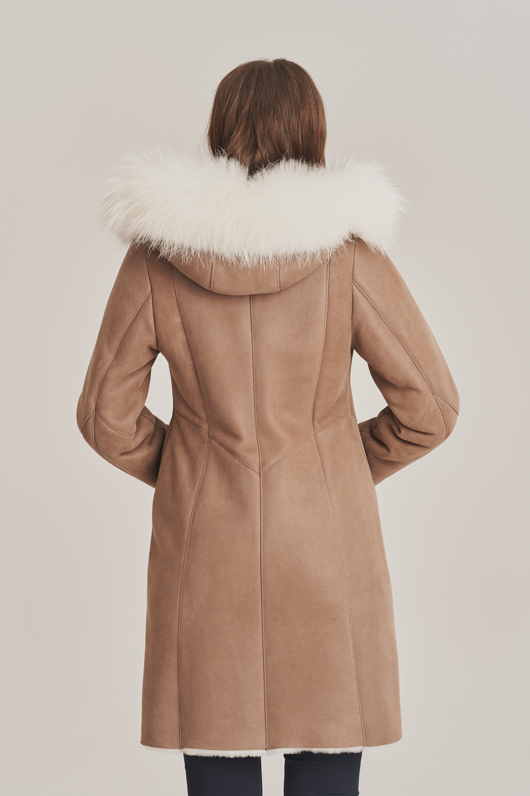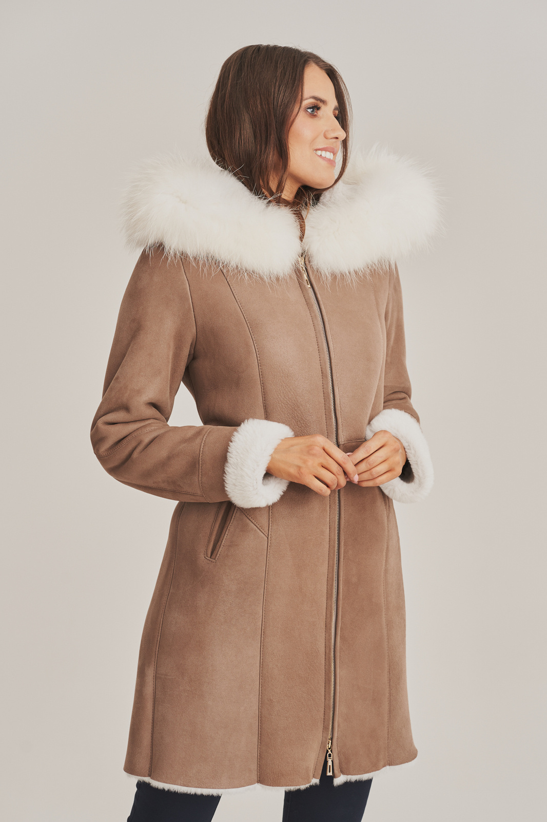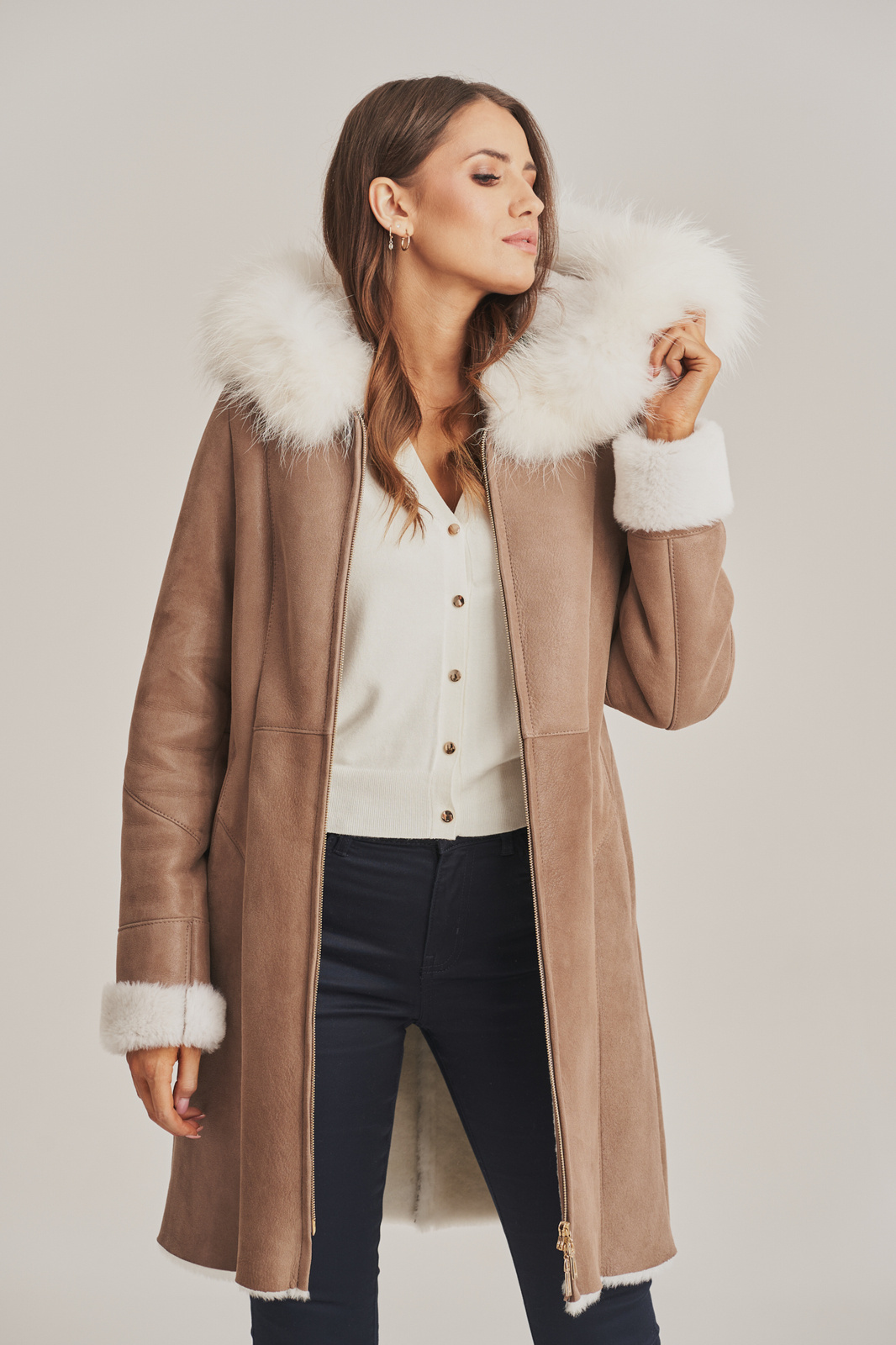 Moteriškas avikailio paltas su gobtuvu ir balta lapės kailio apdaila – šiltas pasirinkimas žiemai. Stilingas, iki kelių siekiantis moteriškas žieminis paltas cappuccino atspalvio. Siūtas iš natūralios, impregnuotos ėriuko odos, kuri pasižymi lengvumu, minkštumu ir šiluma. Moteriškas avikailio paltas su užtrauktuku turi dvi įleistines kišenes ir gobtuvą, puoštą natūraliu balto lapės kailiu, kuris suteikia elegancijos ir papildomos apsaugos nuo šalčio. Rankovių ilgį galima šiek tiek reguliuoti pagal poreikį. Tiesaus silueto, šiek tiek įliemenuotas modelis puikiai pabrėžia figūrą ir tinka tiek kasdieniam, tiek pusiau elegantiškam įvaizdžiui. Labai šiltas, idealus pasirinkimas šaltoms žiemos dienoms.