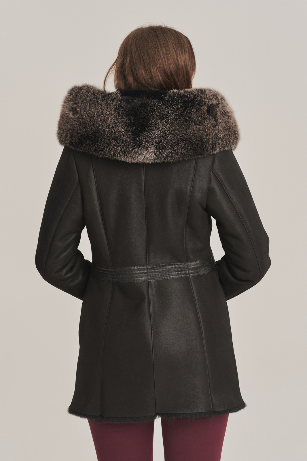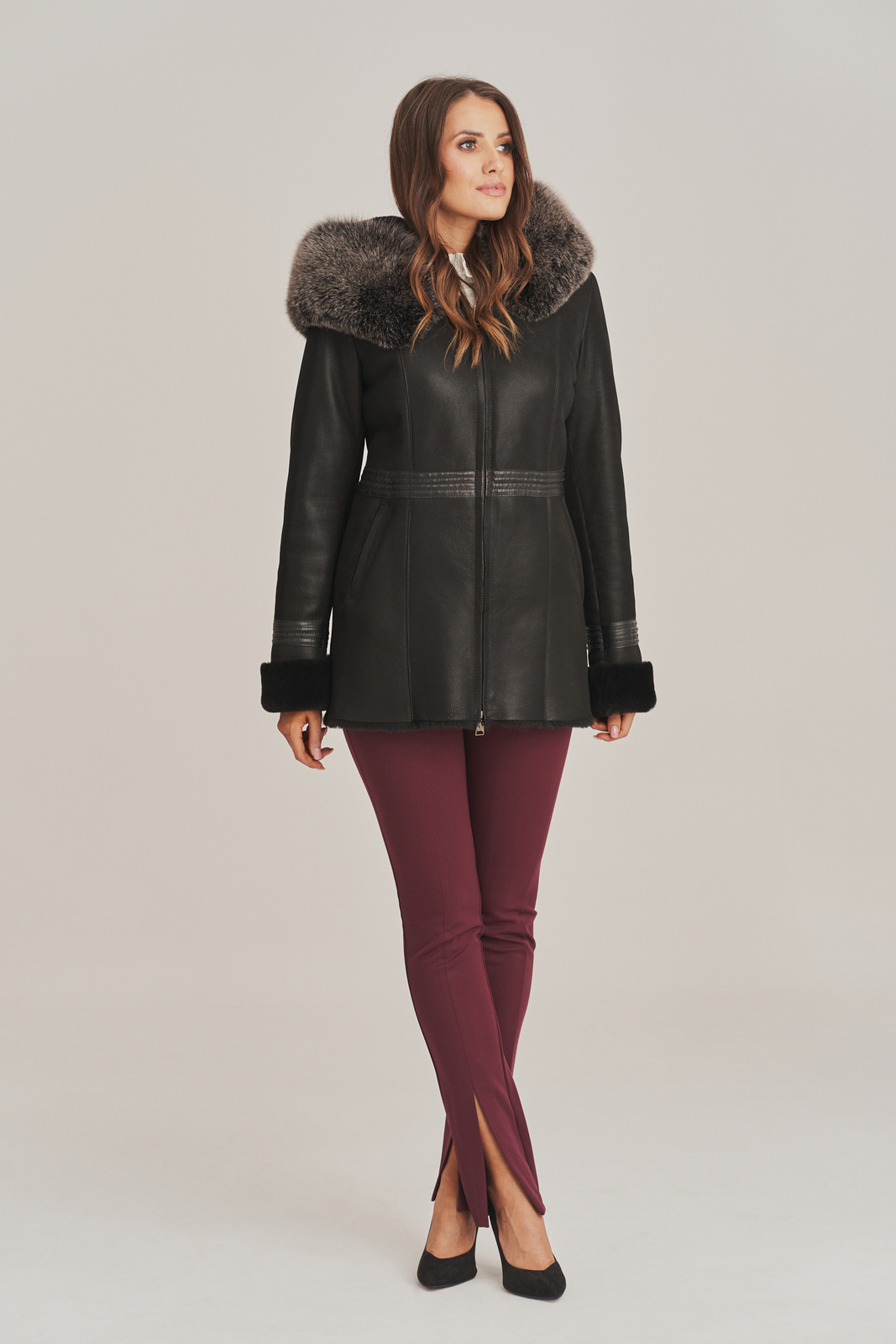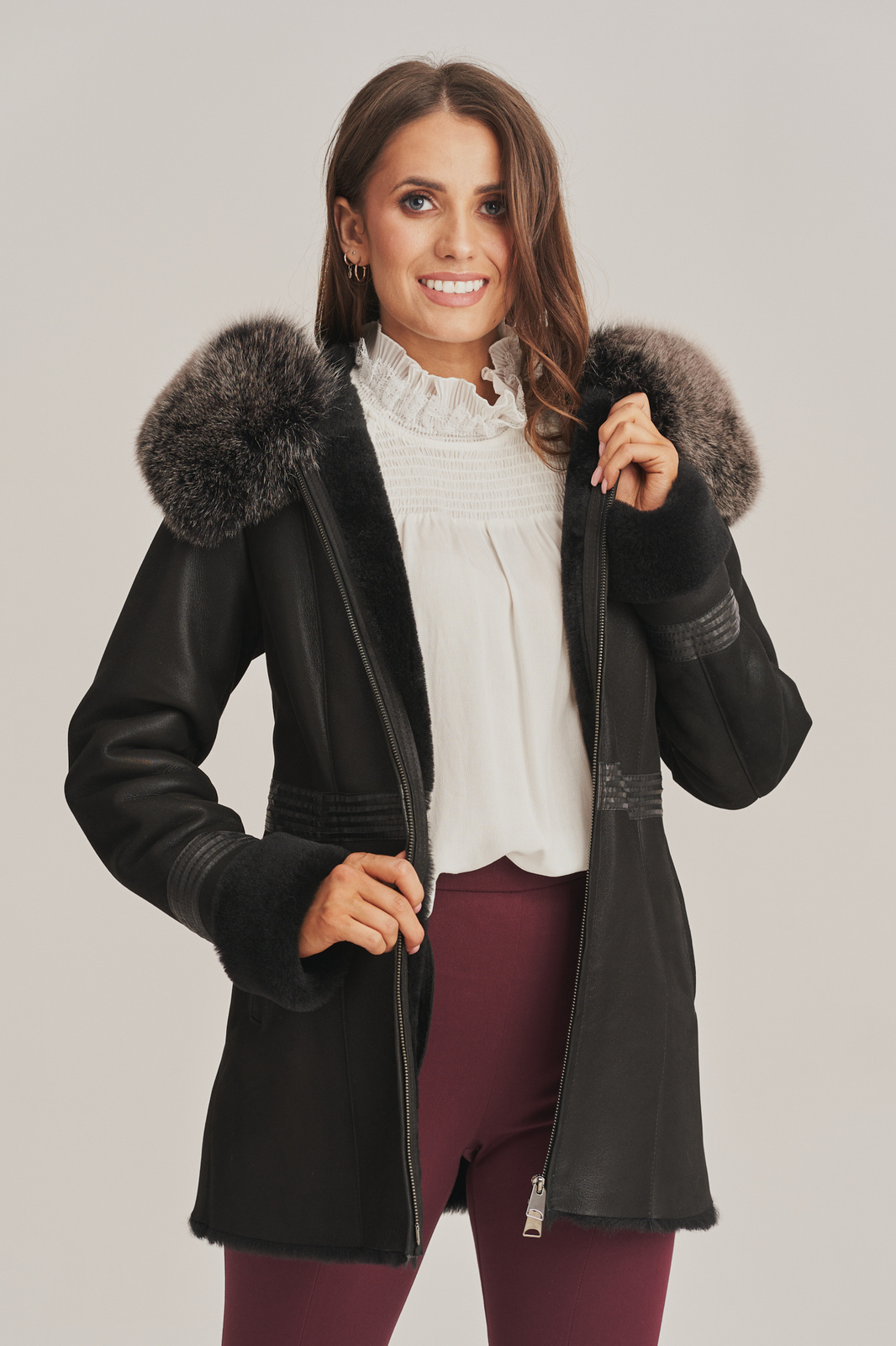Moteriškas žieminis avikailio paltas – juodos spalvos su tikru lapės kailiu. Elegantiškas moteriškas žieminis avikailio paltas gilaus juodumo spalvos. Siūtas iš impregnuotos, labai šiltos, lengvos ir švelnios natūralios ėriuko odos. Šis modelis turi dvi patogias įleistines kišenes ir dekoratyvinius lygios odos apvadus, kurie pabrėžia moterišką siluetą. Moteriškas avikailio paltas šiek tiek įliemenuotas, todėl puikiai tinka tiek lieknesnėms, tiek vidutinio sudėjimo moterims. Užsegamas patogiu užtrauktuku. Kapišonas puoštas aukštos kokybės tikru sidabrinės lapės kailiu šviesesnių pilkų atspalvių. Paprasta, klasikinė šio juodo avikailio palto moterims forma puikiai dera prie kasdienio ir „casual“ stiliaus drabužių, todėl tai idealus pasirinkimas šaltoms rudens ir žiemos dienoms.