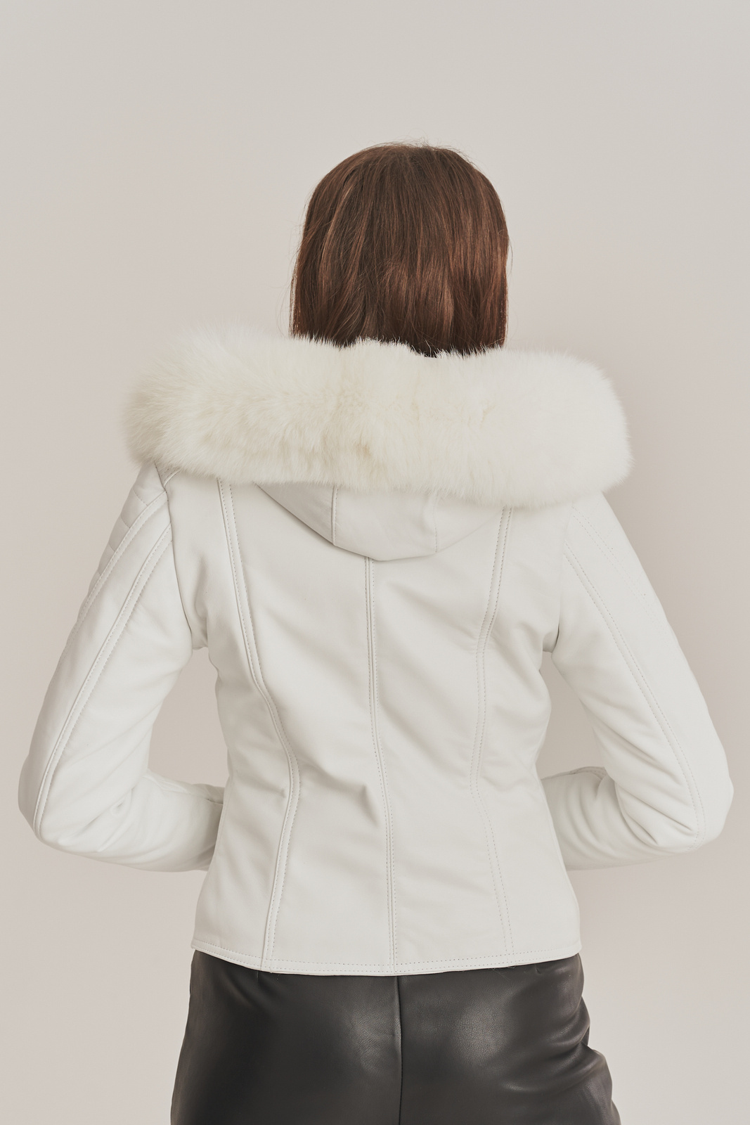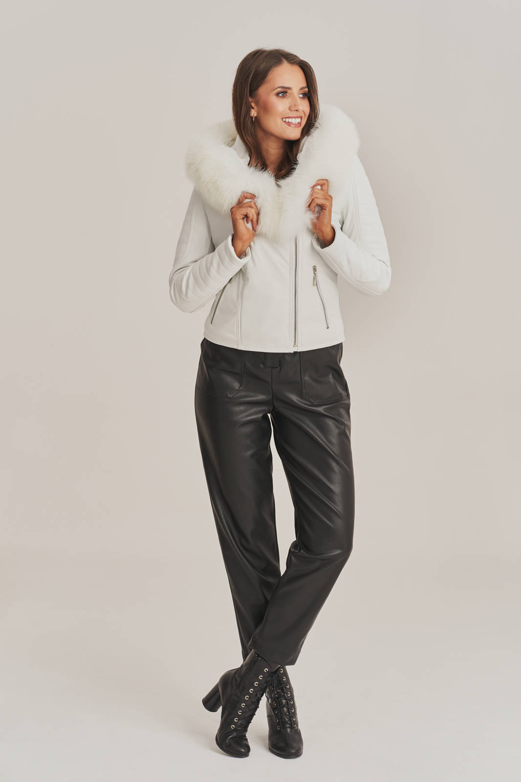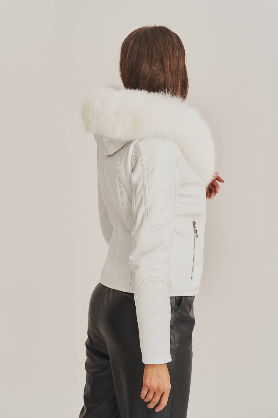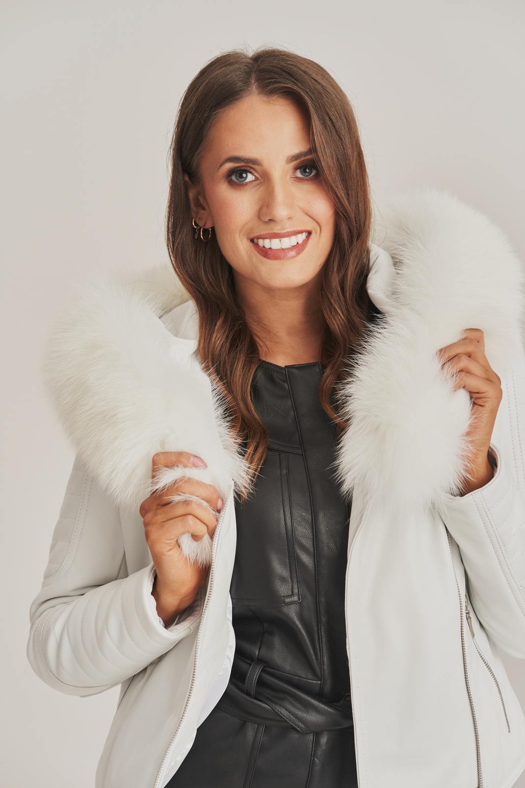 Moteriška odinė striukė tipo „ramones“ – sniego baltumo spalva, natūrali oda ir stilingas funkcionalumas. Ši moteriška odinė striukė iš natūralios avikailio odos, pasiūta klasikiniu „ramones“ tipo kirpimu, yra puikus pasirinkimas šiuolaikiškai moteriai, vertinančiai kokybę ir universalų dizainą. Sniego baltumo odos atspalvis išsiskiria elegancija ir puikiai dera tiek su sportiniu, tiek su elegantišku stiliumi. Striukė turi asimetrinį užtrauktuką, kuris suteikia modernumo ir originalumo. Dvi kišenės su užtrauktukais – ne tik patogios, bet ir pabrėžia minimalistinį siluetą. Viduje – aukštos kokybės pamušalas, užtikrinantis komfortą ir patogumą nešiojant. Ypatingas šio modelio akcentas – kapišonas su natūraliu lapės kailiu, kurį galima lengvai nusegti pagal poreikį ar oro sąlygas. Kailis suteikia prabangos įspūdį ir efektyviai apsaugo nuo vėjo ar šalčio. Tai lengvai pašiltinta moteriška odinė striukė rudeniui ir pavasariui, kuri taip pat puikiai tinka važiuojant automobiliu – nevaržo judesių, išlaiko figūros linijas ir atrodo stilingai bet kokioje situacijoje.