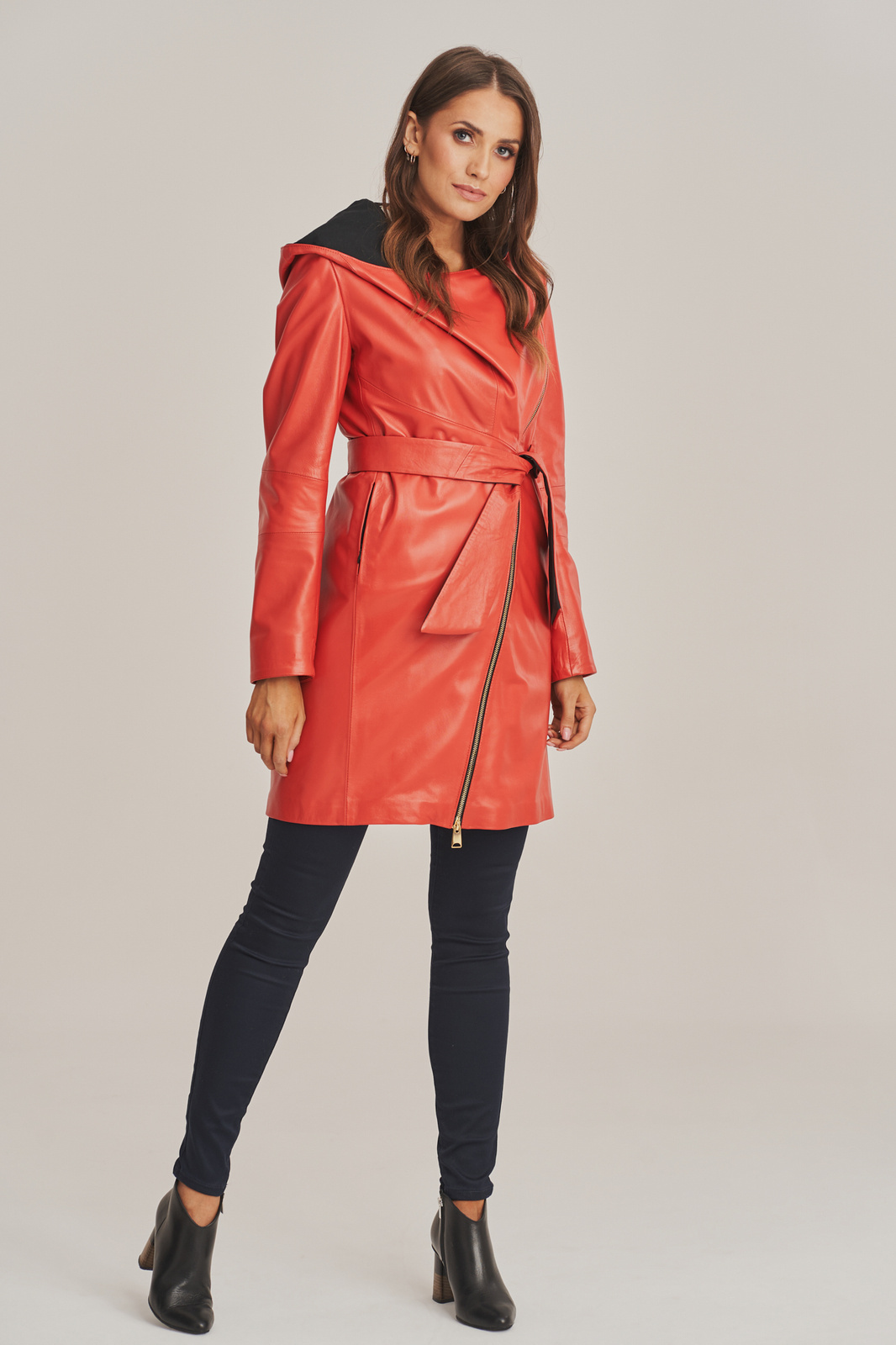 Ilgas moteriškas odinis paltas su gobtuvu – elegantiškas koralų