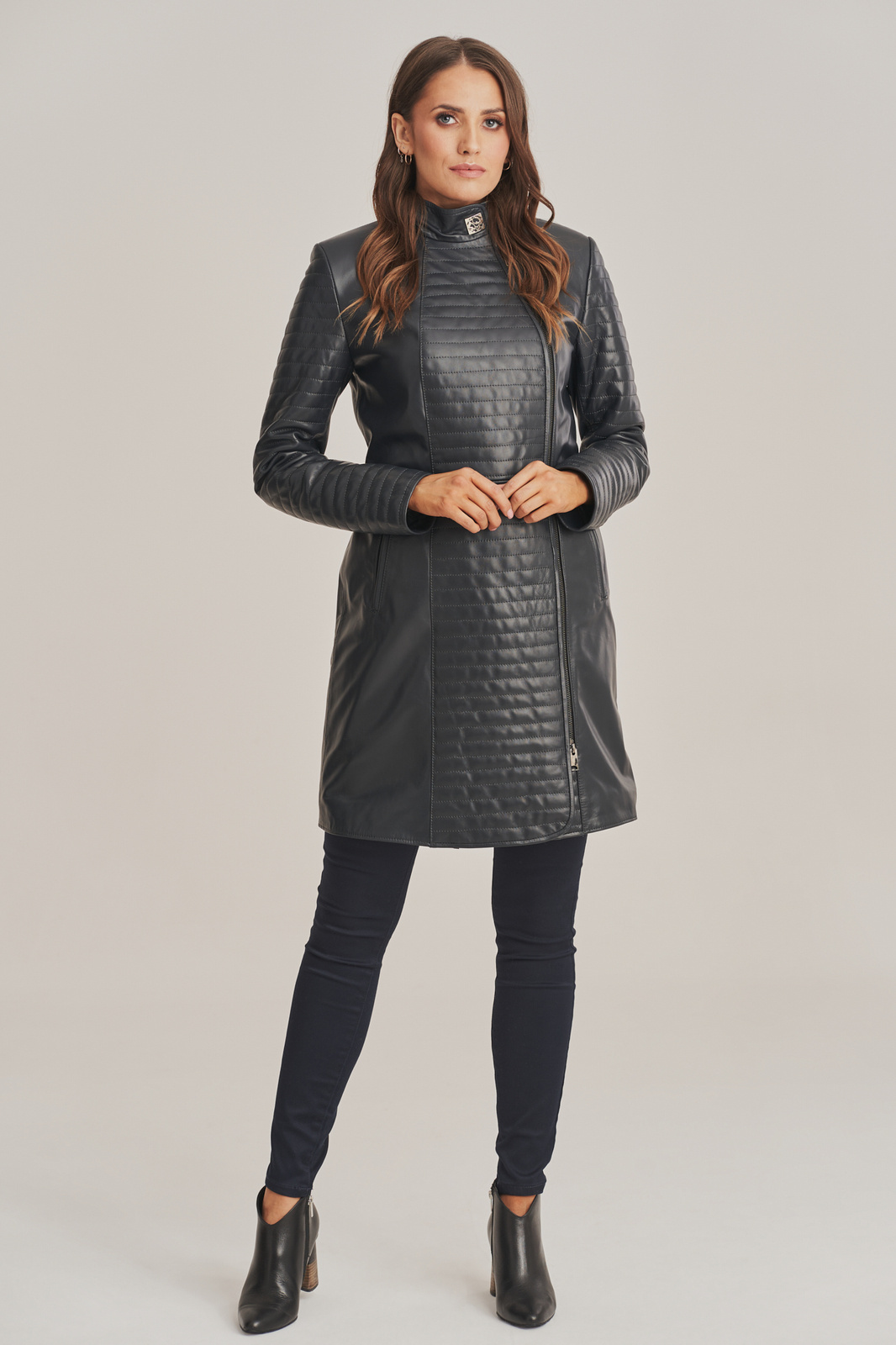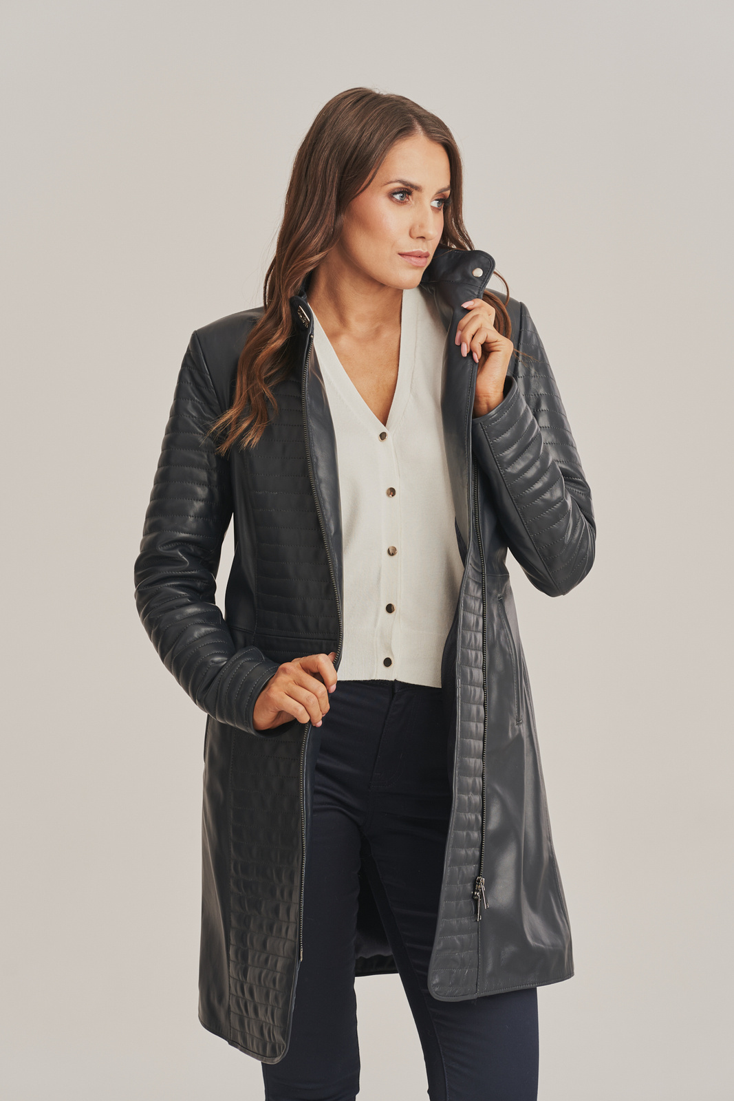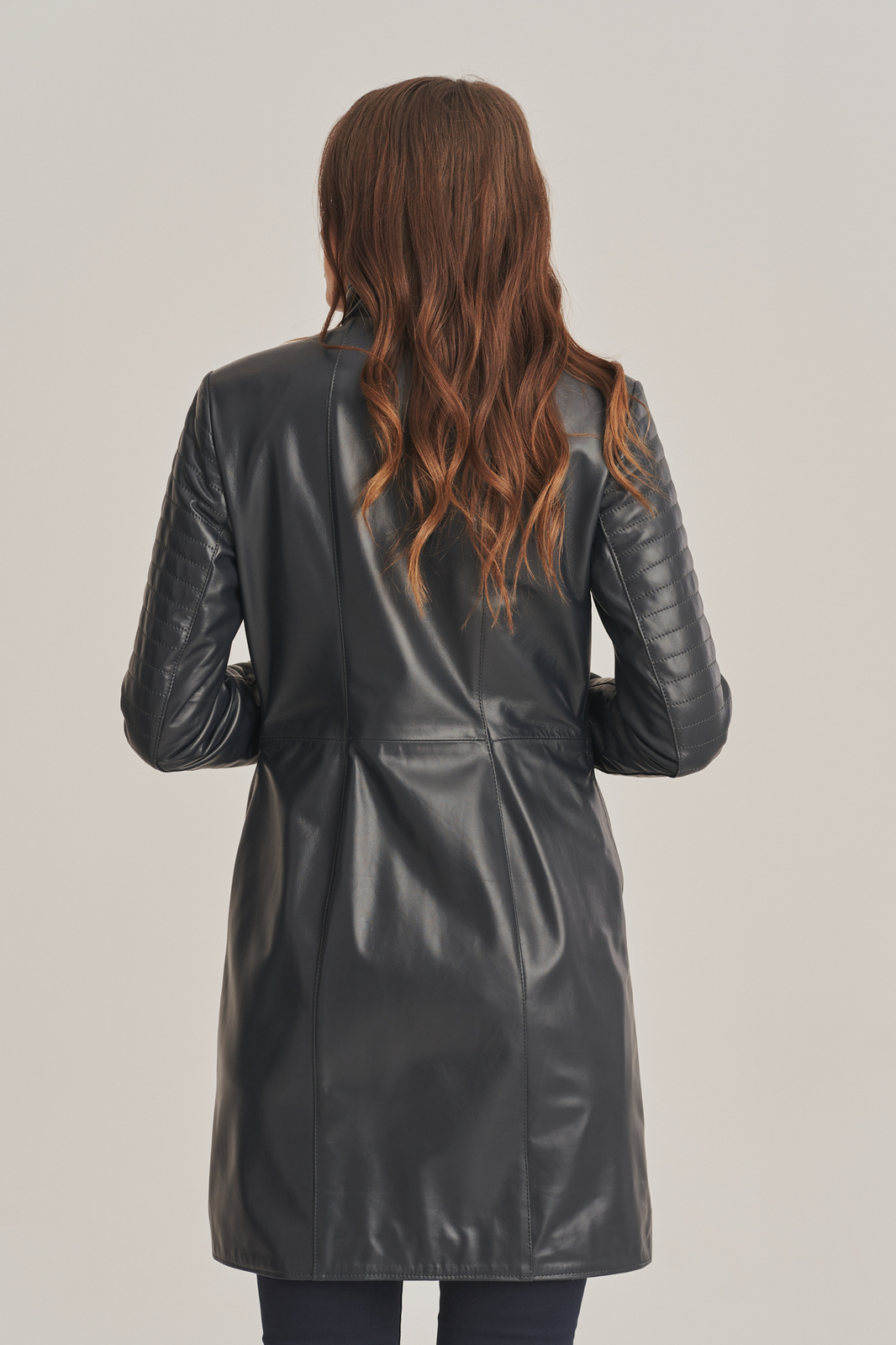 Tamsiai mėlynas moteriškas odinis paltas – elegancija, komfortas ir praktiškumas pereinamajam sezonui. Tamsiai mėlynas moteriškas odinis paltas, pasiūtas iš aukštos kokybės natūralios avikailio odos, išsiskiria švelnumu, elastingumu ir patogumu dėvint. Tai puikus pasirinkimas ieškančioms stilingo, funkcionalaus ir ilgaamžio viršutinio drabužio rudeniui ar pavasariui. Modelis užsegamas šiek tiek į šoną paslinktu užtrauktuku, kuris suteikia modernumo bei išskirtinumo. Lengvai įliemenuota silueto forma pabrėžia figūrą, o įdomūs dygsniuoti raštai suteikia modeliui struktūros ir vizualinio gylio. Striukė turi dvi patogias įleistines kišenes, kurios praktiškos ir nepastebimos. Aukšta apykaklė–stovė, užsegama spaude (knopke), užtikrina papildomą apsaugą nuo vėjo ir suteikia elegantišką išvaizdą. Vidinė pusė išbaigta aukštos kokybės pamušalu, kuris pagerina ne tik išvaizdą, bet ir dėvėjimo komfortą. Tai moteriškas odinis paltas rudeniui ir pavasariui, puikiai tinkantis tiek kasdienai, tiek derinant prie elegantiškesnės aprangos. Spalva – gili tamsiai mėlyna (navy) – universali, bet išskirtinė, leidžianti kurti subtilius ir šiuolaikiškus derinius.