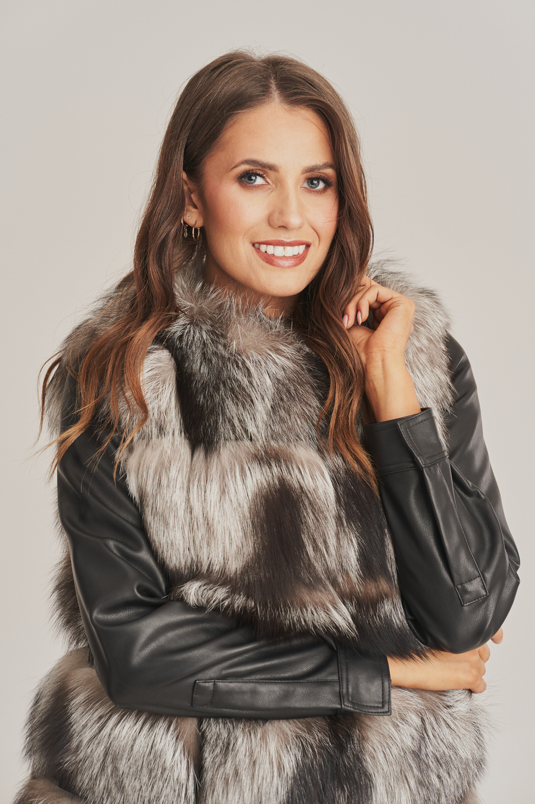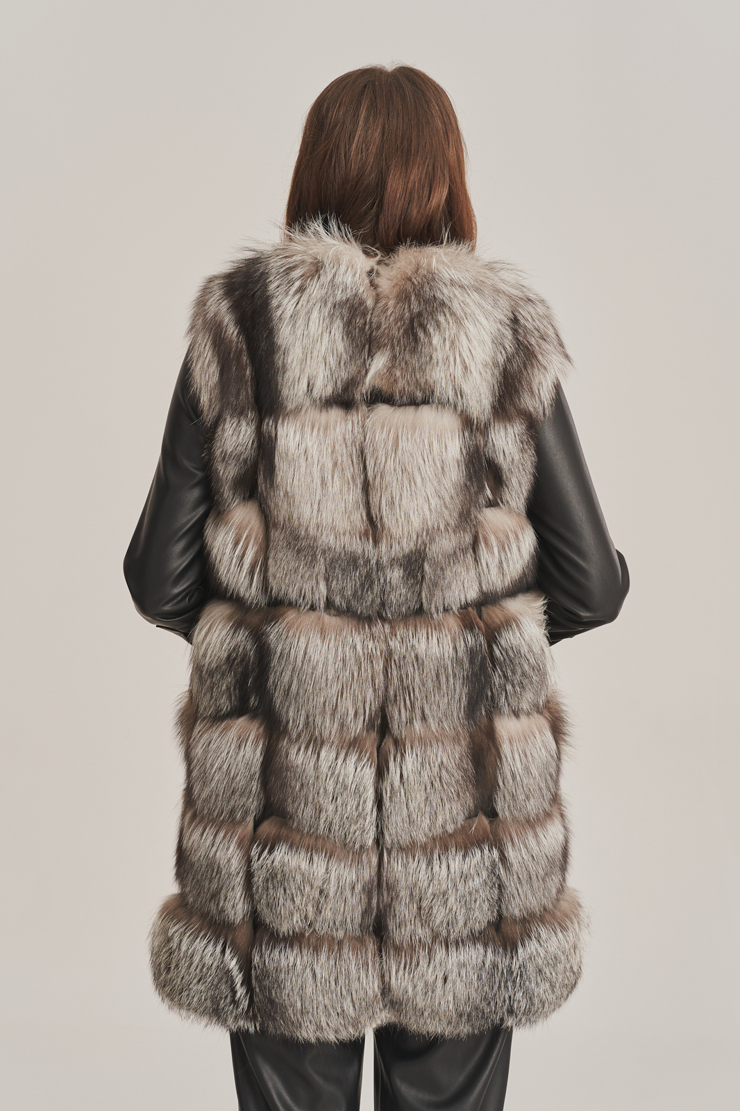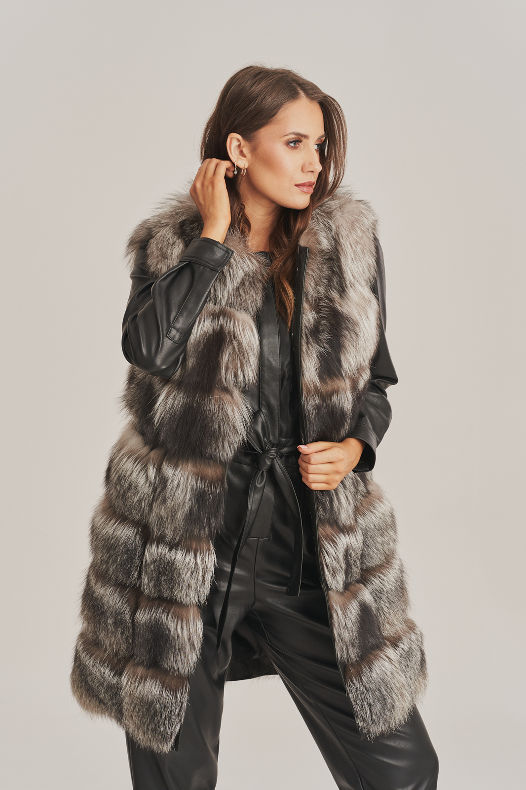 Prabangi moteriška kailinė liemenė iš sidabrinių lapės kailių su juoda avikailio oda