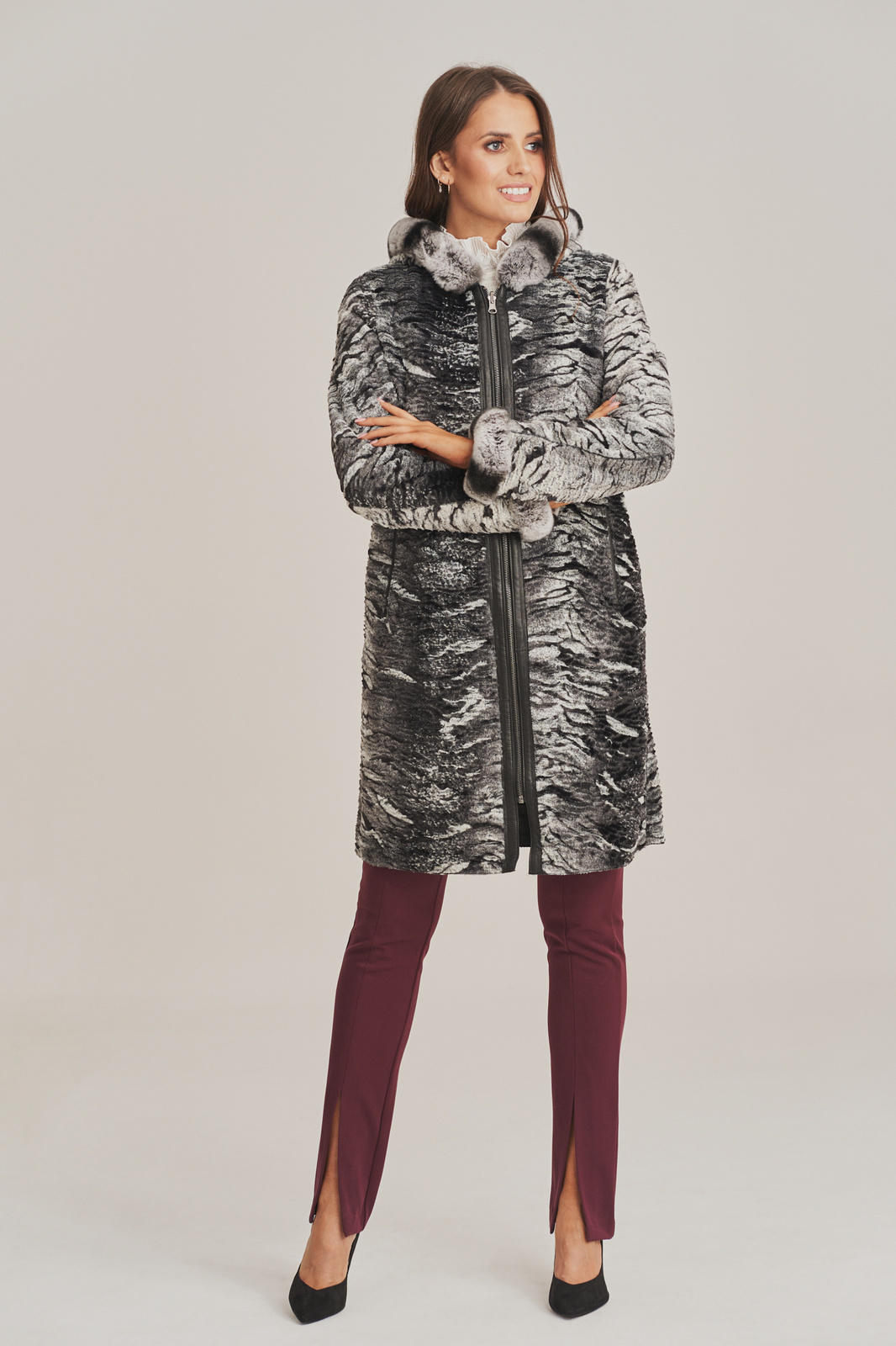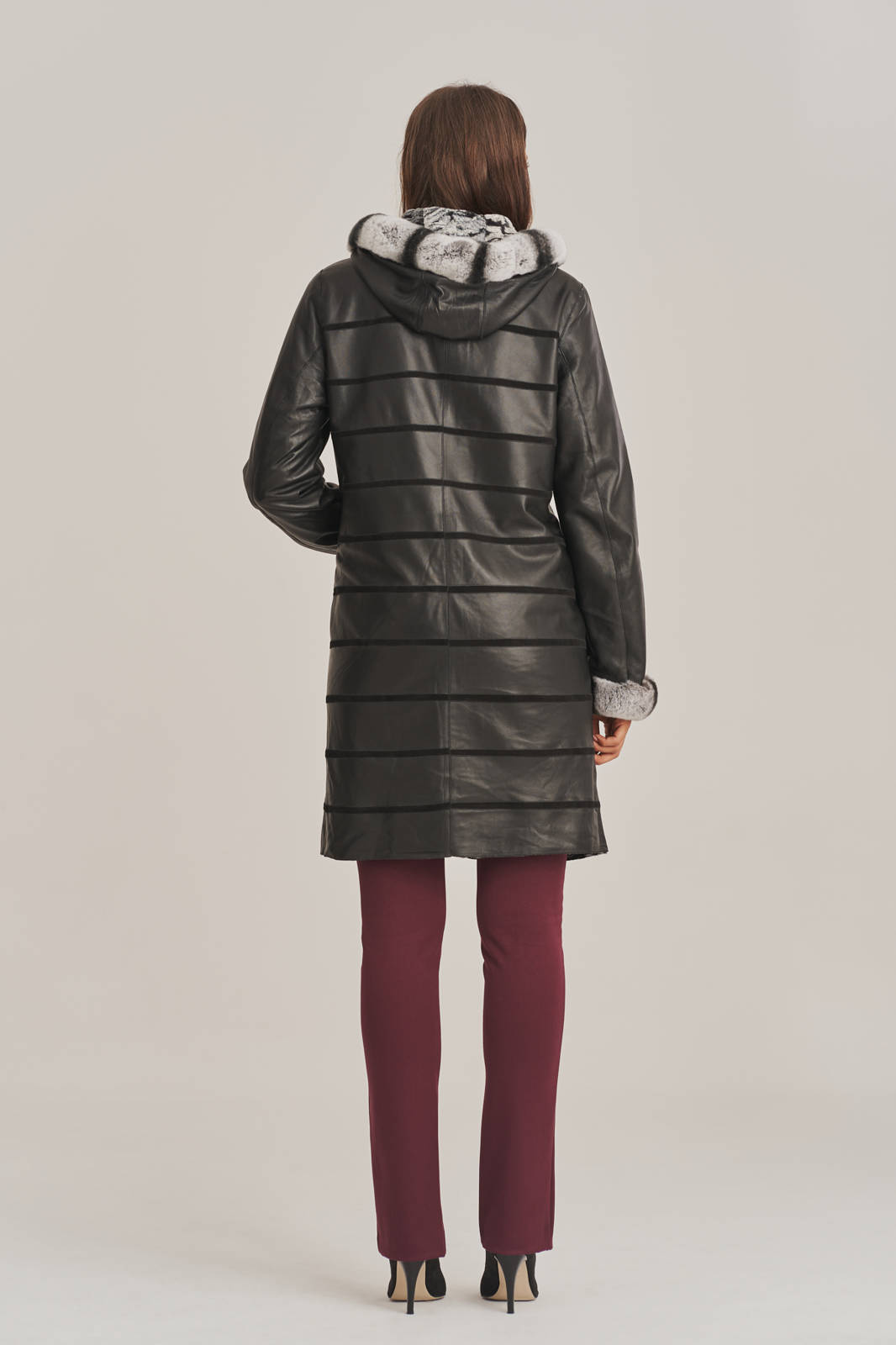 Dvipusis moteriškas odinis paltas iki virš kelių – elegancija, funkcionalumas ir natūralios medžiagos. Moteriškas dvipusis odinis paltas, pasiūtas iš natūralios avikailio odos, išsiskiria švelnumu, lengvumu ir aukštu dėvėjimo komfortu. Modelis siekia virš kelių, turi lengvai įliemenuotą siluetą, kuris puikiai išryškina moteriškas formas ir vizualiai lieknina figūrą dėl horizontalių siūlių, kurios optiškai formuoja kūno linijas. Šis plonas odinis paltas rudeniui ir žiemai yra dvipusis – viena pusė pagaminta iš natūralios, švelnios avikailio odos, kita – iš aukštos kokybės pilkai juodo audinio, todėl leidžia keisti įvaizdį pagal nuotaiką ar orą. Užsegamas patogiu užtrauktuku, paltas turi net keturias kišenes – po dvi kiekvienoje pusėje, kas suteikia dar daugiau praktiškumo. Modelį papildo didelis gobtuvas, kuris ne tik puošia, bet ir efektyviai saugo nuo vėjo bei šalčio. Gobtuvas ir rankovių galai dekoruoti natūraliu castorex kailiu, kuris suteikia prabangos pojūtį ir išskirtinumo. Šis moteriškas odinis paltas su kailiu ir gobtuvu, kurį galima dėvėti iš abiejų pusių, yra idealus pasirinkimas toms, kurios vertina kokybę, ilgaamžiškumą ir funkcionalumą viename gaminyje.