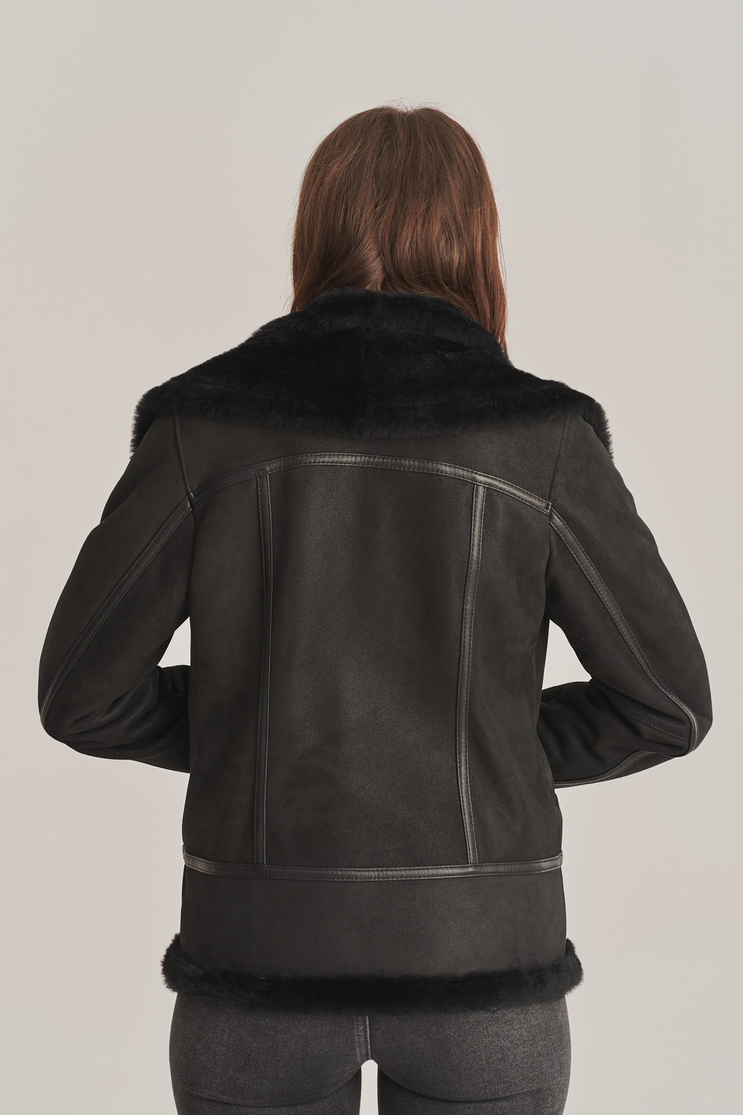 Moteriškas žieminis avikailio paltas, baikerio stiliaus