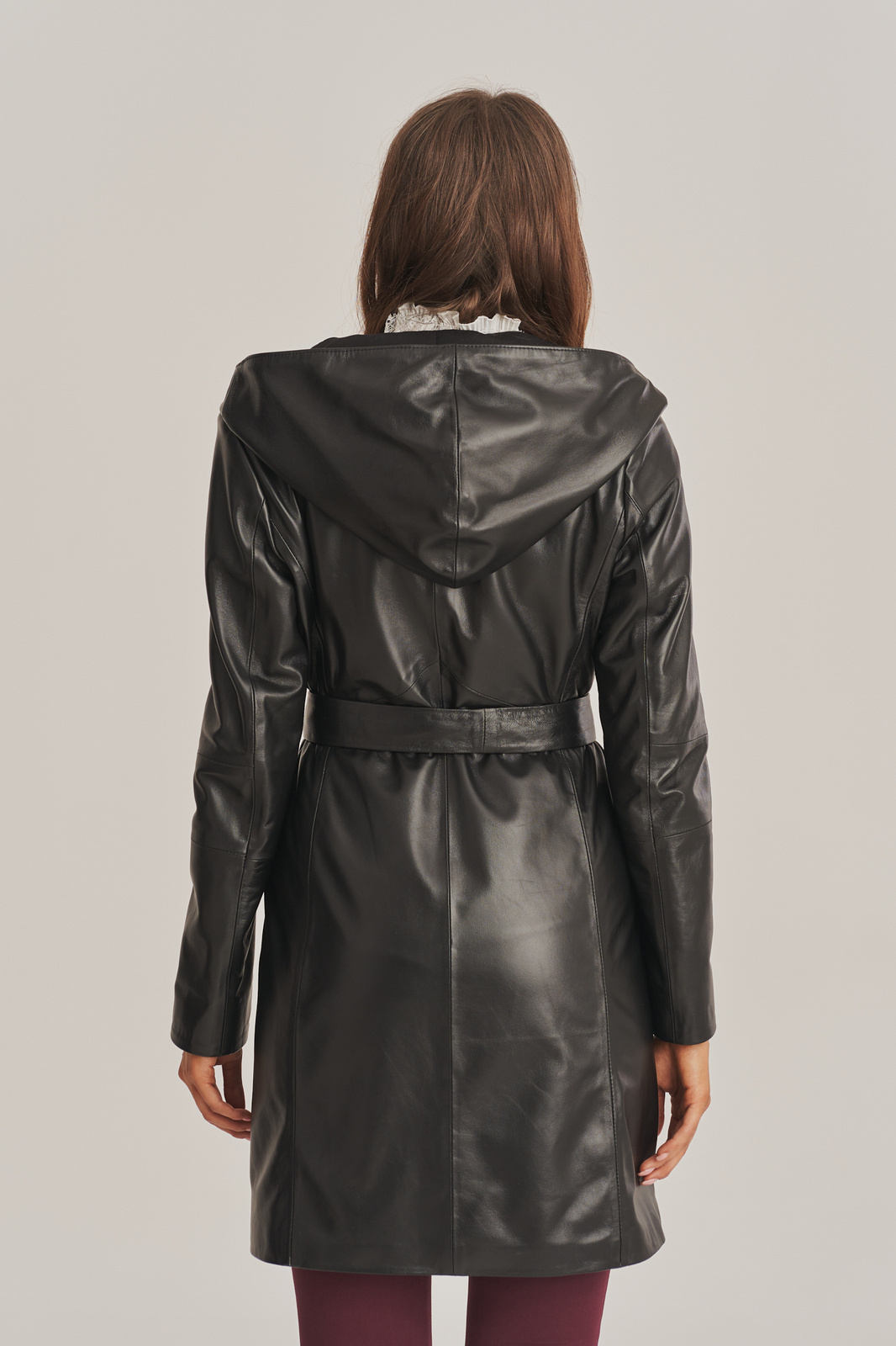 Juodas moteriškas odinis paltas – subtilus stilius ir patogumas pereinamajam sezonui. Juodas moteriškas odinis paltas, pasiūtas iš švelnios, aukščiausios kokybės natūralios avikailio odos, išsiskiria minimalistiniu dizainu ir universaliu charakteriu. Tai plonas odinis paltas rudeniui ir pavasariui, puikiai tinkantis tiek miesto ritmui, tiek ramesniam savaitgalio stiliui. Modelis nėra pašiltintas, tačiau iš vidaus išbaigtas kokybišku pamušalu, kuris suteikia komfortą dėvint. Paltas užsegamas užtrauktuku, o praktiškumą papildo dvi užsegamos kišenės ir diržas juosmens srityje, leidžiantis reguliuoti siluetą ir išryškinti figūrą. Šiek tiek įliemenuota forma prisitaiko prie kūno linijų, išlaikant patogumą kasdieniam naudojimui. Ypatingas šio modelio akcentas – didelis, platus gobtuvas, kuris ne tik suteikia galimybę kurti skirtingus įvaizdžius, bet ir apsaugo nuo vėjo bei vėsos. Tai puikus sprendimas šaltoms, vėjuotoms dienoms, kai reikalingas papildomas komfortas. Šis moteriškas avikailio paltas su gobtuvu ir užtrauktuku yra stilingas pasirinkimas moterims, vertinančioms kokybę, funkcionalumą ir išskirtinį dizainą. Odinis paltas su diržu lengvai derinamas tiek su klasikiniais drabužiais, tiek su laisvalaikio apranga. Tai puikus moteriškas odinis paltas kasdienai, sukurtas ilgam dėvėjimui be kompromisų dėl stiliaus.