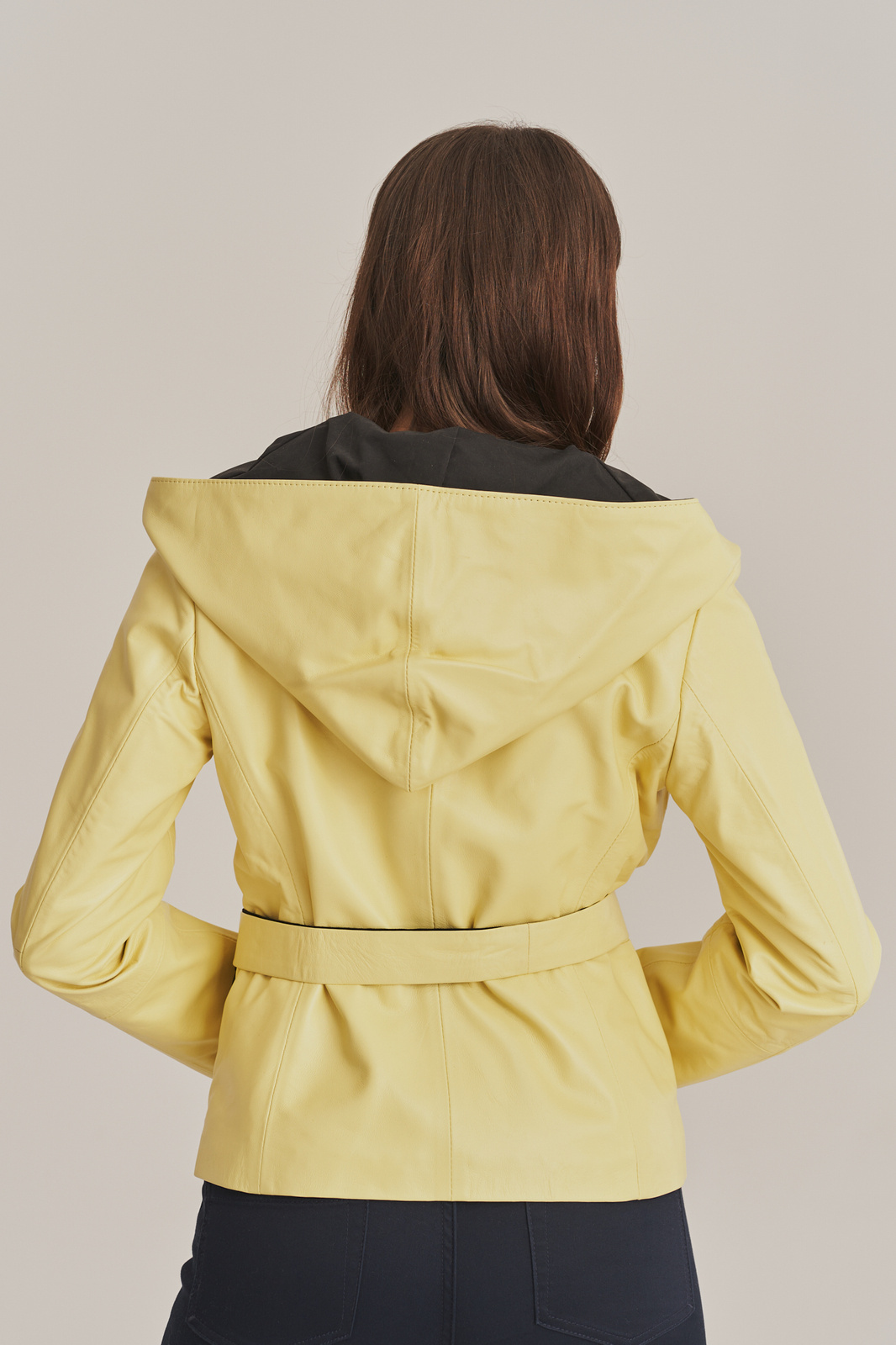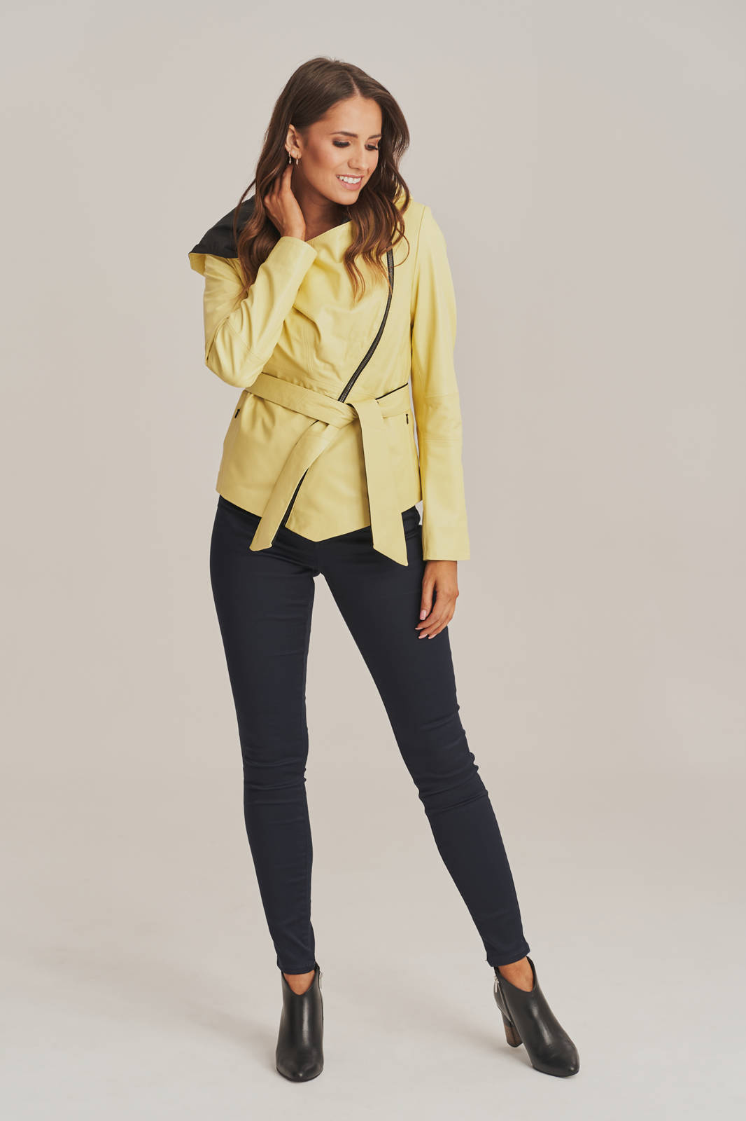 Geltona moteriška odinė striukė – išskirtinis stiliaus ir kokybės derinys. Geltona moteriška odinė striukė, pasiūta iš minkštos, aukštos kokybės avikailio odos, išsiskiria subtilia elegancija ir šiuolaikišku dizainu. Citrinos spalva suteikia gaivumo ir išskirtinumo bet kuriai aprangai, o švelni ir plona oda užtikrina komfortą dėvint įvairiais metų laikais. Tai plona odinė striukė pavasariui, vasarai ir rudeniui, be pašiltinimo, tačiau su kokybišku juodos spalvos pamušalu viduje. Modelis užsegamas asimetriniu užtrauktuku, kuris suteikia modernumo, o gobtuvas apsaugo nuo netikėtų oro pokyčių. Dvi užsegamos kišenės integruotos taip, kad išlaikytų minimalistinį, tvarkingą vaizdą. Ties juosmeniu esantis diržas leidžia reguliuoti siluetą ir pabrėžti figūrą. Šiek tiek įliemenuotas siluetas dera tiek prie kasdienių, tiek prie elegantiškesnių derinių. Ši moteriška avikailio striukė su gobtuvu sukurta moterims, vertinančioms kokybę, patogumą ir originalumą. Moteriška odinė striukė su diržu ir asimetriniu užtrauktuku puikiai tinka sezoninio garderobo atnaujinimui. Tai ne tik praktiškas drabužis, bet ir išraiškingas stiliaus akcentas, kuris išsiskiria tiek spalva, tiek kruopščiai apgalvotu kirpimu.