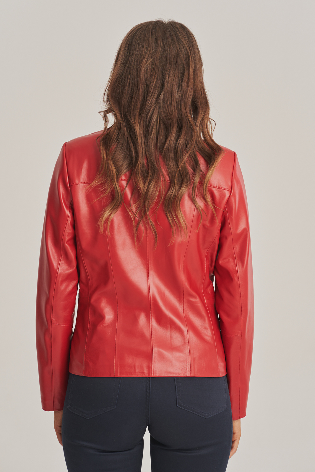 Klasikinė moteriška odinė striukė raudonos spalvos – elegancijos ir patvarumo derinys. Ši klasikinė moteriška odinė striukė raudonos spalvos pasiūta iš natūralios, lygios avies odos, garsėjančios ilgaamžiškumu ir minkštumu. Striukė užsegama užtrauktuku ir turi dvi įleistines kišenes, kurios suteikia praktiškumo ir patogumo. Chanel tipo apykaklė suteikia prabangos ir stiliaus akcentą. Vidus išklotas aukštos kokybės pamušalu, užtikrinančiu komfortą ir malonią nešiojimo patirtį. Lengvai liemenuotas kirpimas pabrėžia moterišką siluetą, o universalus dizainas leidžia striukę naudoti kaip puikią alternatyvą klasikiniam švarkui. Ši natūralios odos moteriška striukė puikiai derės tiek prie elegantiškų, tiek prie kasdienių derinių, tapdama nepakeičiama jūsų garderobo dalimi.