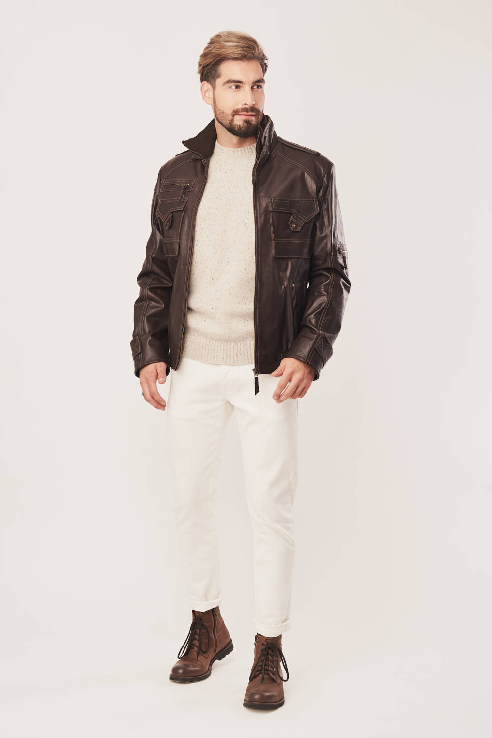 Vyriška ruda odinė pilotka – tvirta avies oda ir sportiškas, originalus stilius. Vyriška ruda odinė pilotka, pagaminta iš natūralios, šiek tiek sunkesnės ir masyvesnės avies odos, užtikrina ilgaamžiškumą ir komfortą. Ši vyriška odinė striukė rudeniui ir pavasariui išsiskiria stovinčia apykakle, aptrauktą malonia liesti medžiaga, suteikiančia papildomą patogumą ir stilingą išvaizdą. Modelį puošia masyvios kišenės bei petnešos ant pečių ir rankogalių, kurios suteikia striukei sportišką ir tuo pačiu originalų charakterį. Ši vyriška odinė pilotka rudos spalvos – puikus pasirinkimas vyrams, vertinantiems kokybę ir išskirtinį dizainą. Vyriška odinė striukė baseball stiliaus yra universali ir puikiai tinka kasdienėms rudens bei pavasario aprangoms, užtikrinanti stilių ir patvarumą.