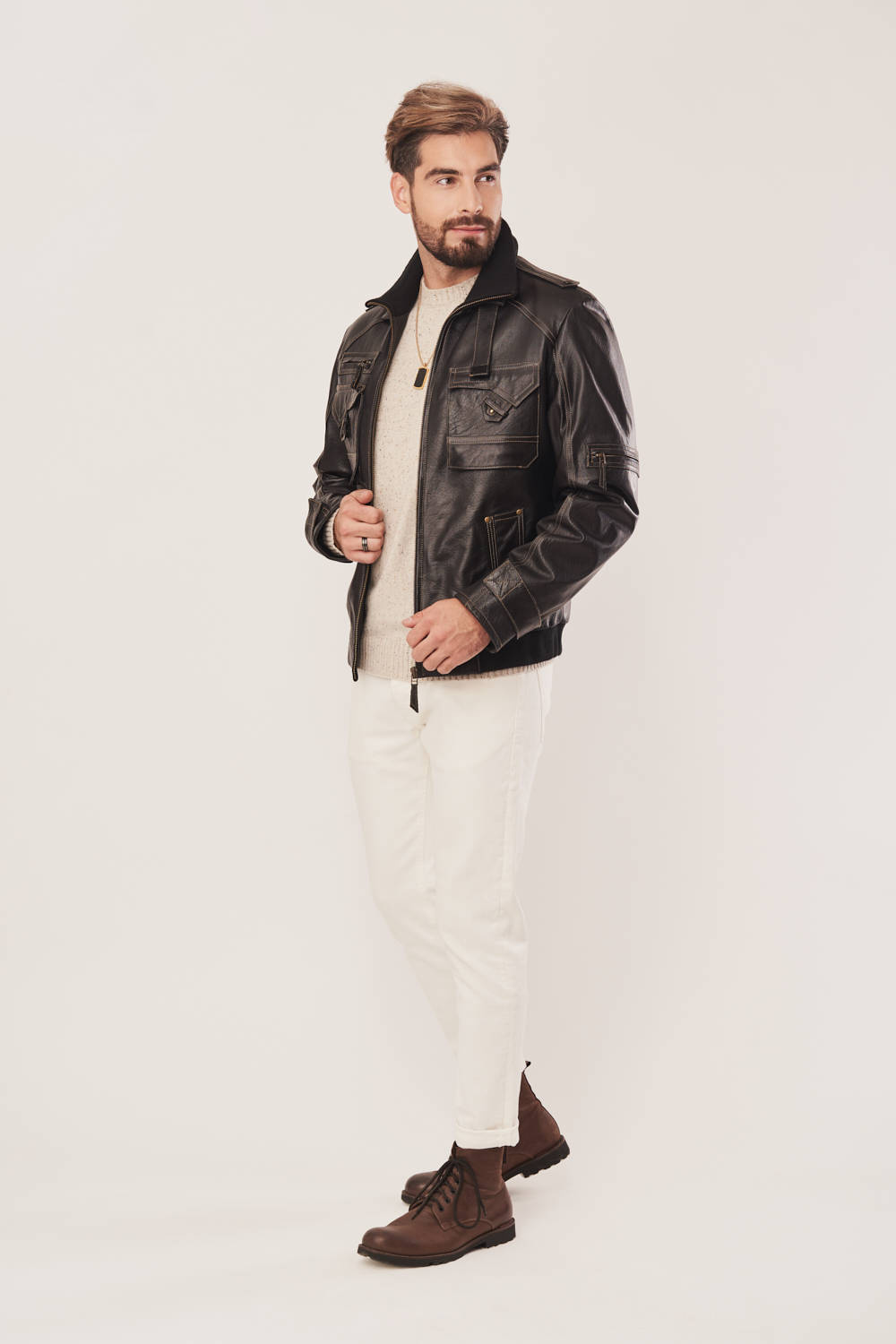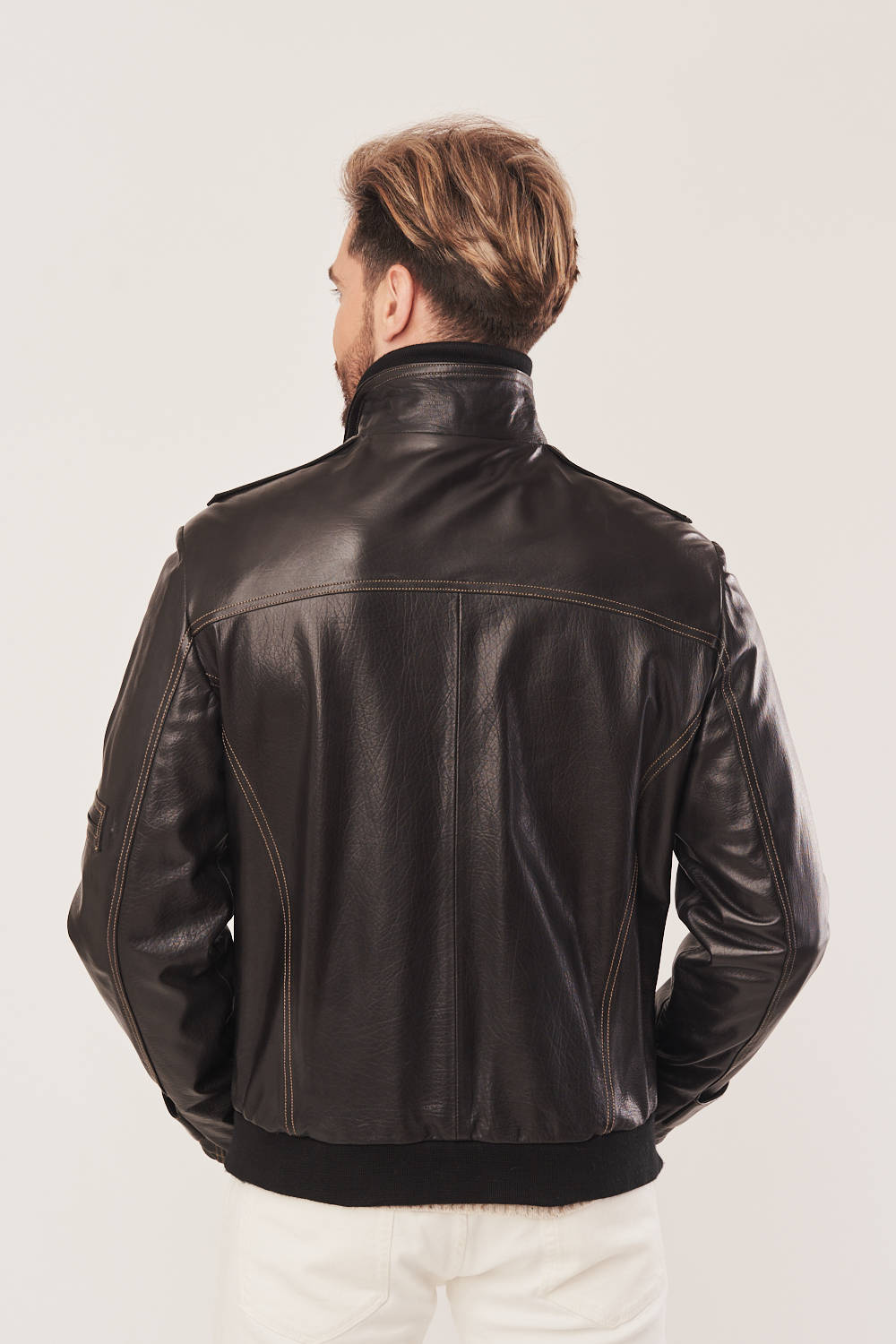 Vyriška juoda odinė pilotka – sportiška vyriška odinė striukė rudeniui ir pavasariui