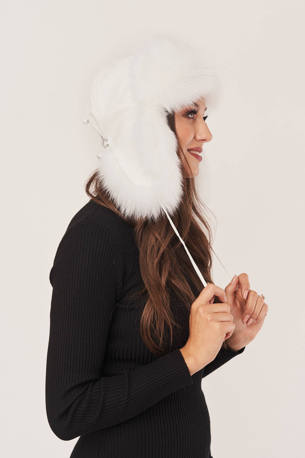 Balta žieminė ausinė kepurė moterims – tai išskirtinė žiemos stiliaus detalė, kuri sujungia prabangą, funkcionalumą ir natūralias medžiagas. Kepurės išorė pagaminta iš aukščiausios kokybės natūralios avikailės odos, puošta tikru, puriu natūraliu baltos lapės kailiu, kuris ne tik atrodo įspūdingai, bet ir puikiai saugo nuo šalčio bei vėjo. Ši moteriška kailinė kepurė su ausimis pasižymi praktišku dizainu – ilgos ausinės gali būti surištos oda aptrauktomis juostelėmis viršugalvyje arba pakaušyje, priklausomai nuo pasirinkto stiliaus. Vidinė dalis išklota šilta, aukštos kokybės pamušalu, užtikrinančiu komfortą net ir esant žemai temperatūrai. Be to, galima šiek tiek reguliuoti kepurės apimtį, todėl ji lengvai prisitaiko prie galvos formos. Natūralaus kailio balta žieminė kepurė puikiai dera tiek su elegantišku moterišku paltu, tiek su kasdiene sportine žiemine striuke – tai universalus aksesuaras, kuris suteikia įvaizdžiui išskirtinumo ir subtilios prabangos. Autentiška moteriška odinė kepurė su lapės kailiu yra ne tik stiliaus, bet ir kokybės pasirinkimas, atitinkantis aukščiausius žiemos sezono reikalavimus.