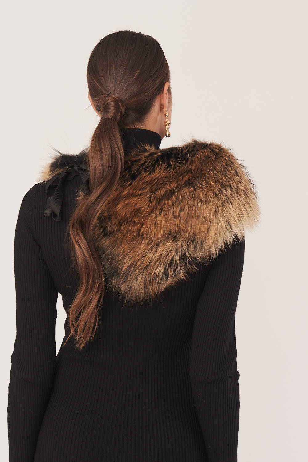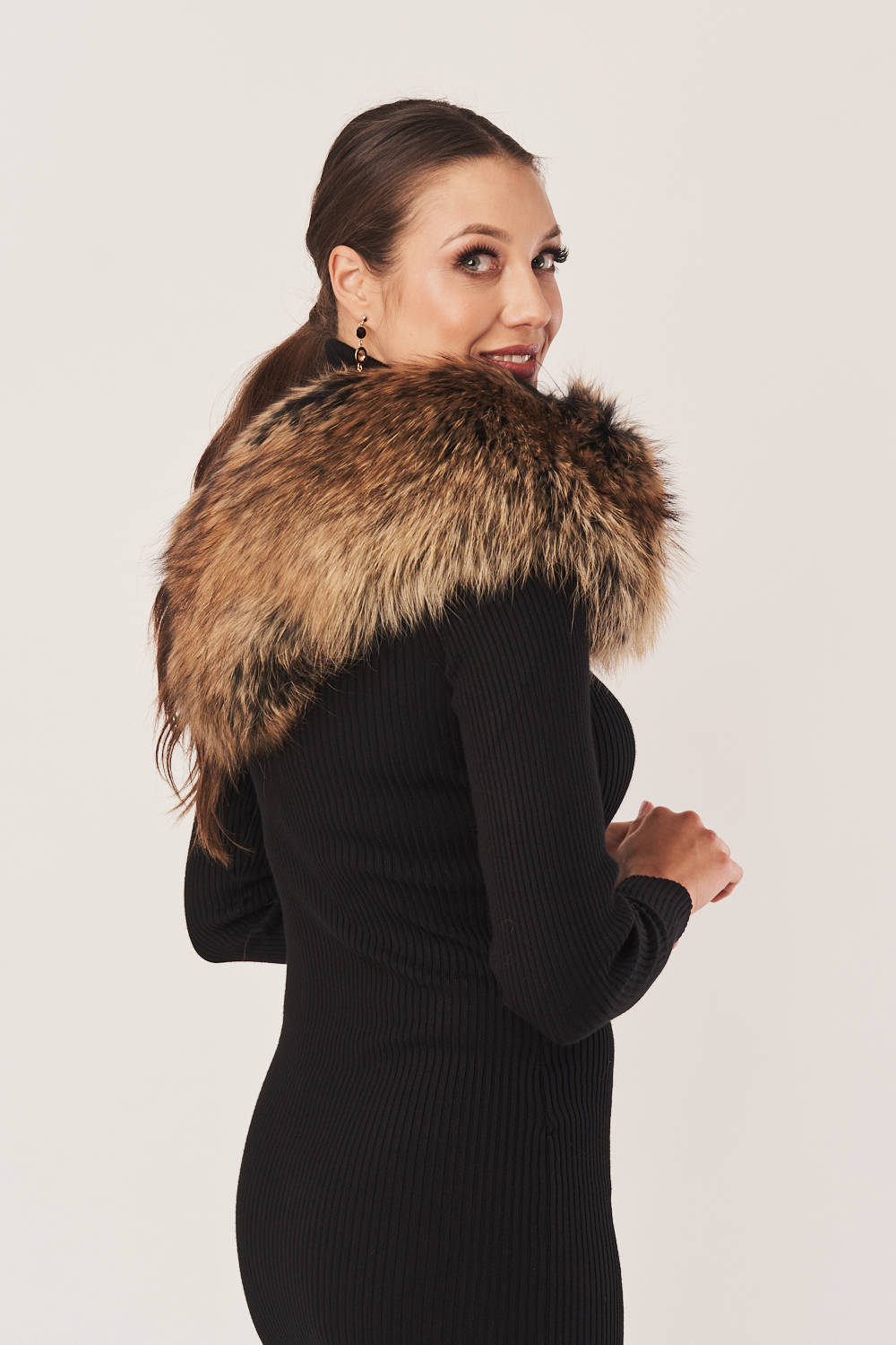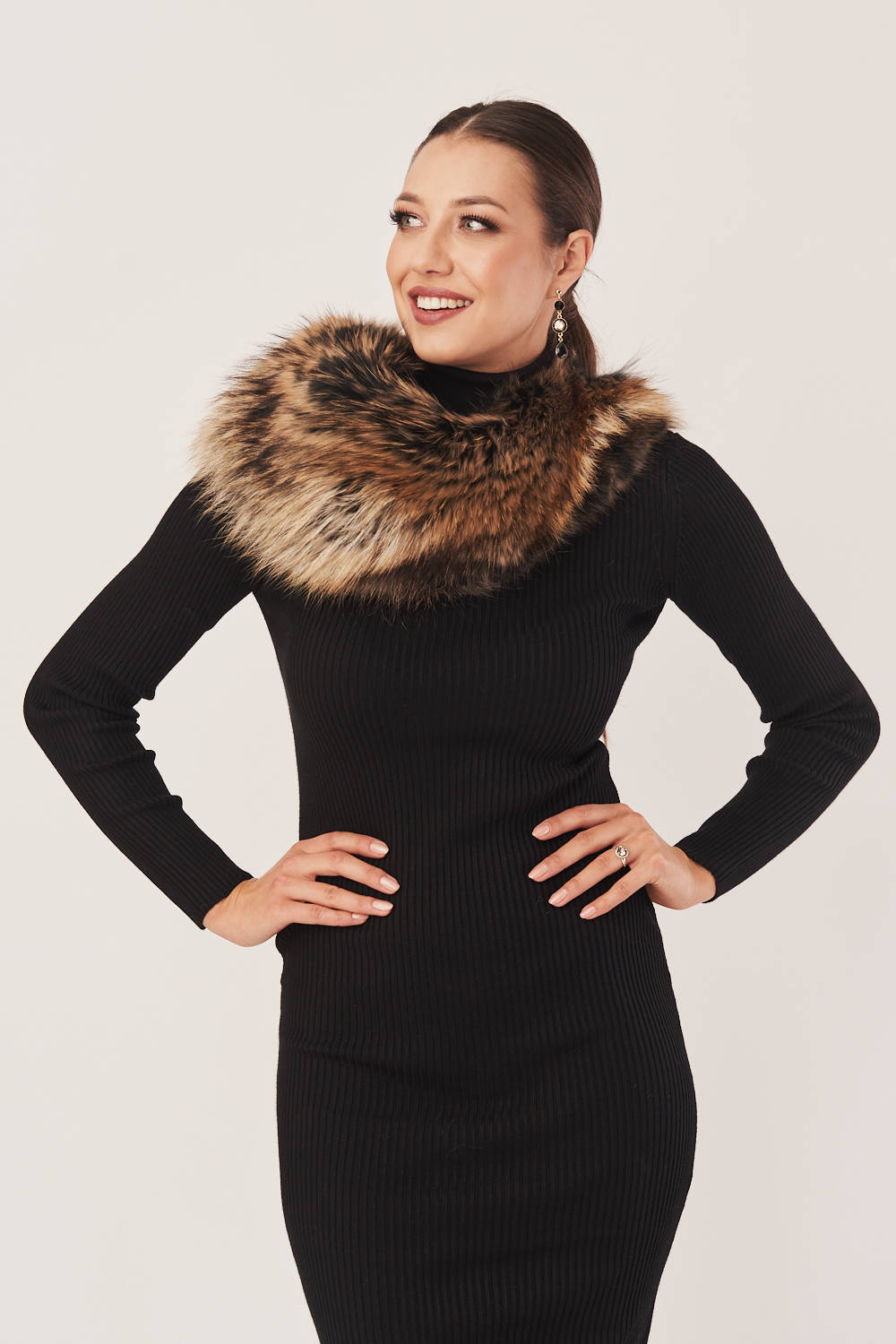 Natūralios jenoto kailio apykaklė rudų, smėlio ir juodų atspalvių – šiluma ir elegancija šaltuoju sezonu