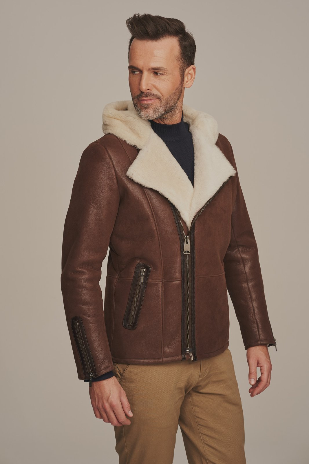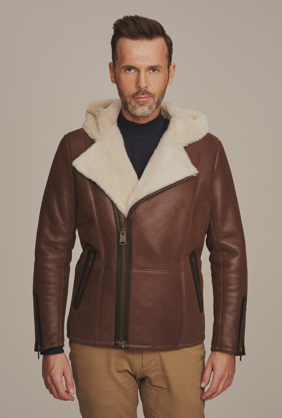 Vyriška žieminė striukė iš natūralios avikailio odos su gobtuvu