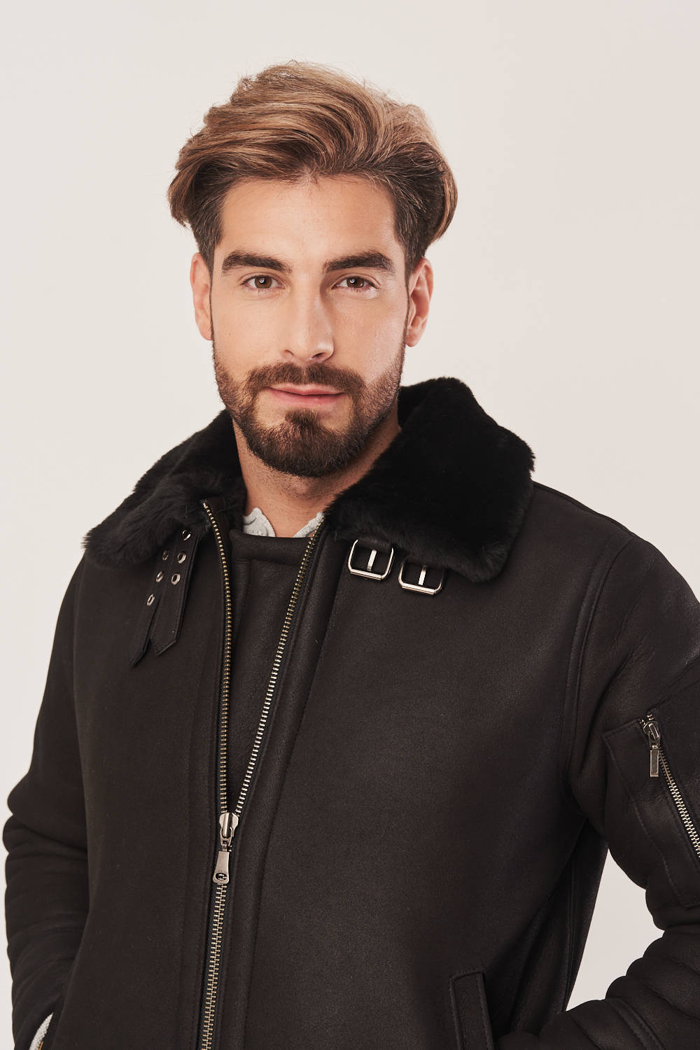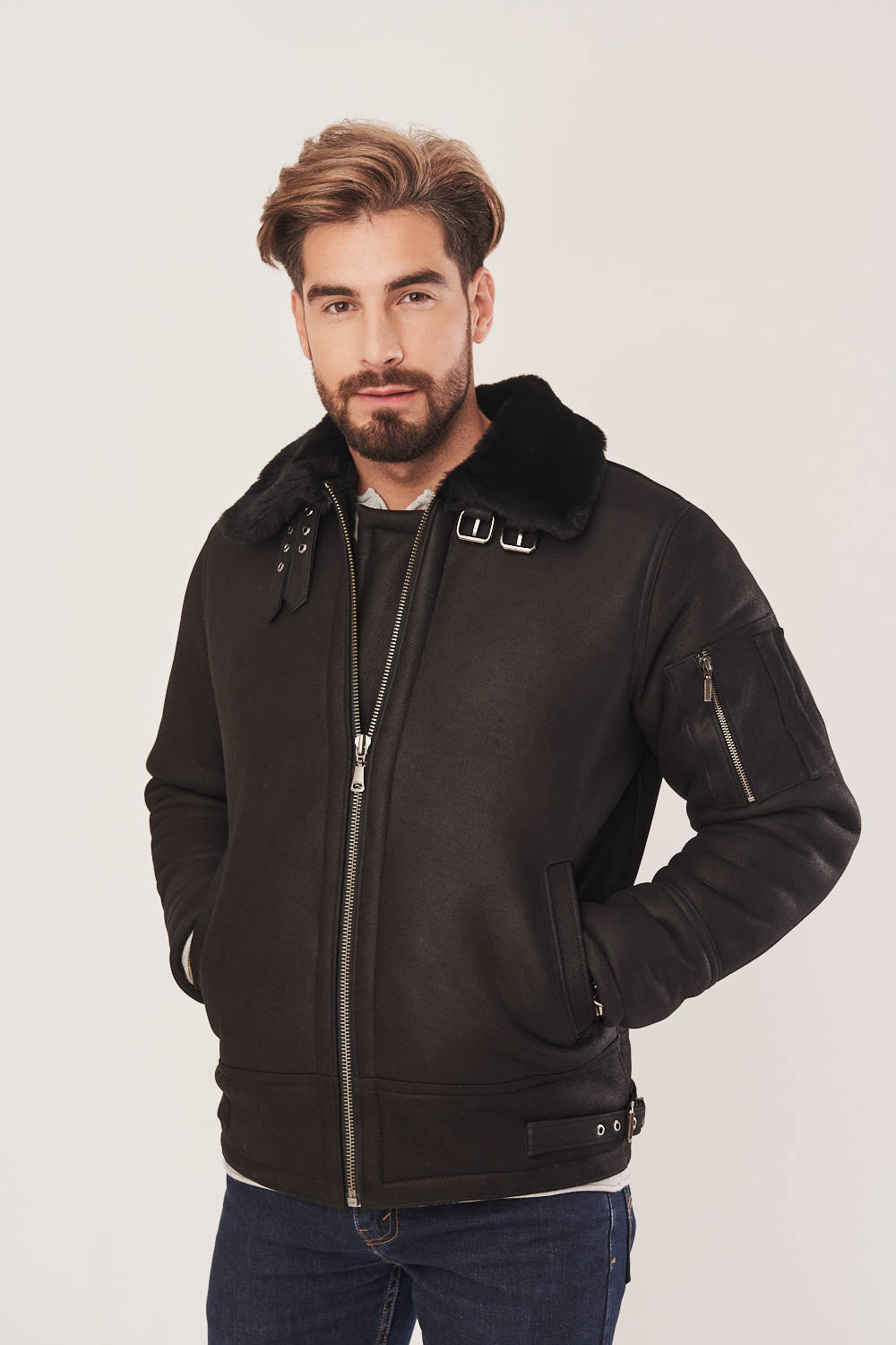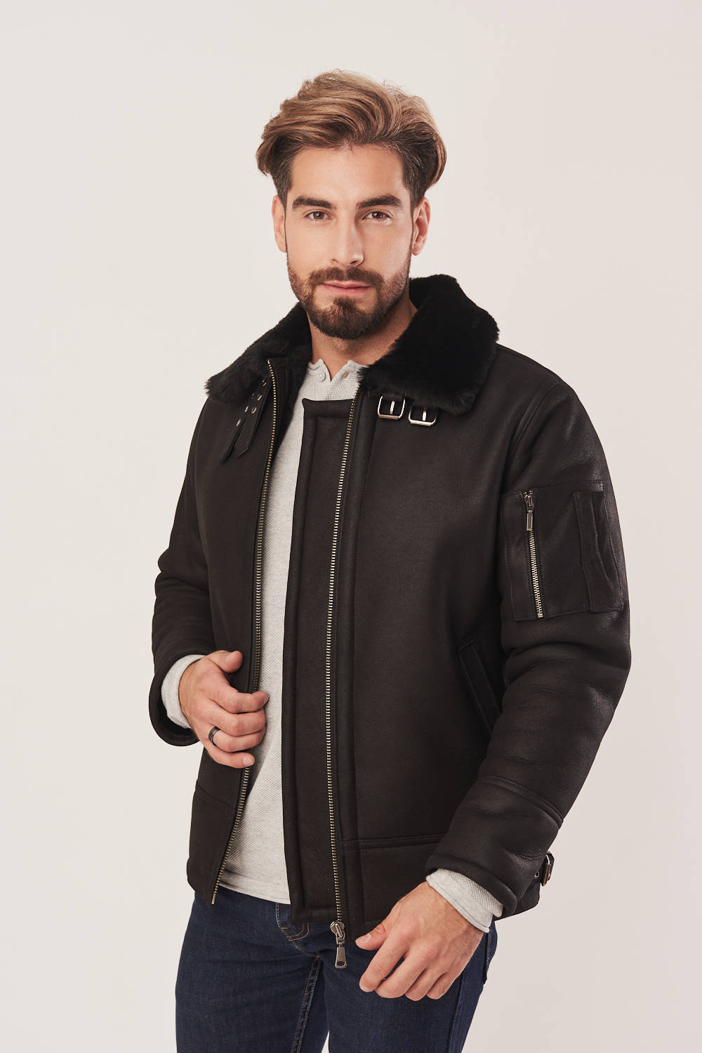 Vyriška žieminė pilotinė striukė iš natūralios avies odos – komfortas, šiluma ir klasikinis aviatoriaus stilius. Stilinga juoda vyriška pilotinė striukė žiemai, pagaminta iš aukštos kokybės natūralios avies odos su subtiliu matiniu paviršiumi. Šis aviatoriaus tipo kailis su vidine vilna – tai puikus pasirinkimas vyrams, ieškantiems patikimos ir šiltos aprangos šaltajam sezonui. Žieminė avies odos striukė ne tik atrodo elegantiškai, bet ir užtikrina aukščiausią komfortą dėvint – tai itin patogi ir šilta odinė vyriška pilotinė striukė, tinkanti tiek kasdienai mieste, tiek kelionėms. Šis modelis išsiskiria klasikiniu kirpimu, kuris išlieka madingas nepaisant laikmečio. Striukė turi užtrauktuką, dvi šonines kišenes ir papildomą kišenę ant rankovės. Gali būti užsegta iki kaklo – pakeltas apykaklė suteikia papildomą apsaugą nuo vėjo. Be to, apačioje yra galimybė reguliuoti plotį ties klubais – kad šiltas odinis kailis vyrams puikiai priglustų prie kūno ir saugotų nuo šalčio. Ši vyriška žieminė avies kailio striukė – tai idealus pasirinkimas ieškantiems funkcionalumo, šilumos ir išskirtinio stiliaus.