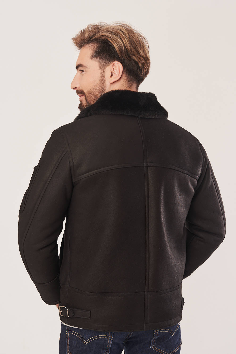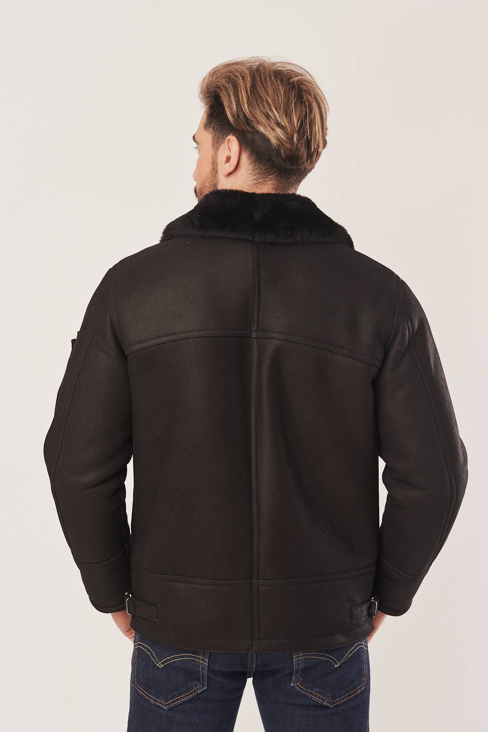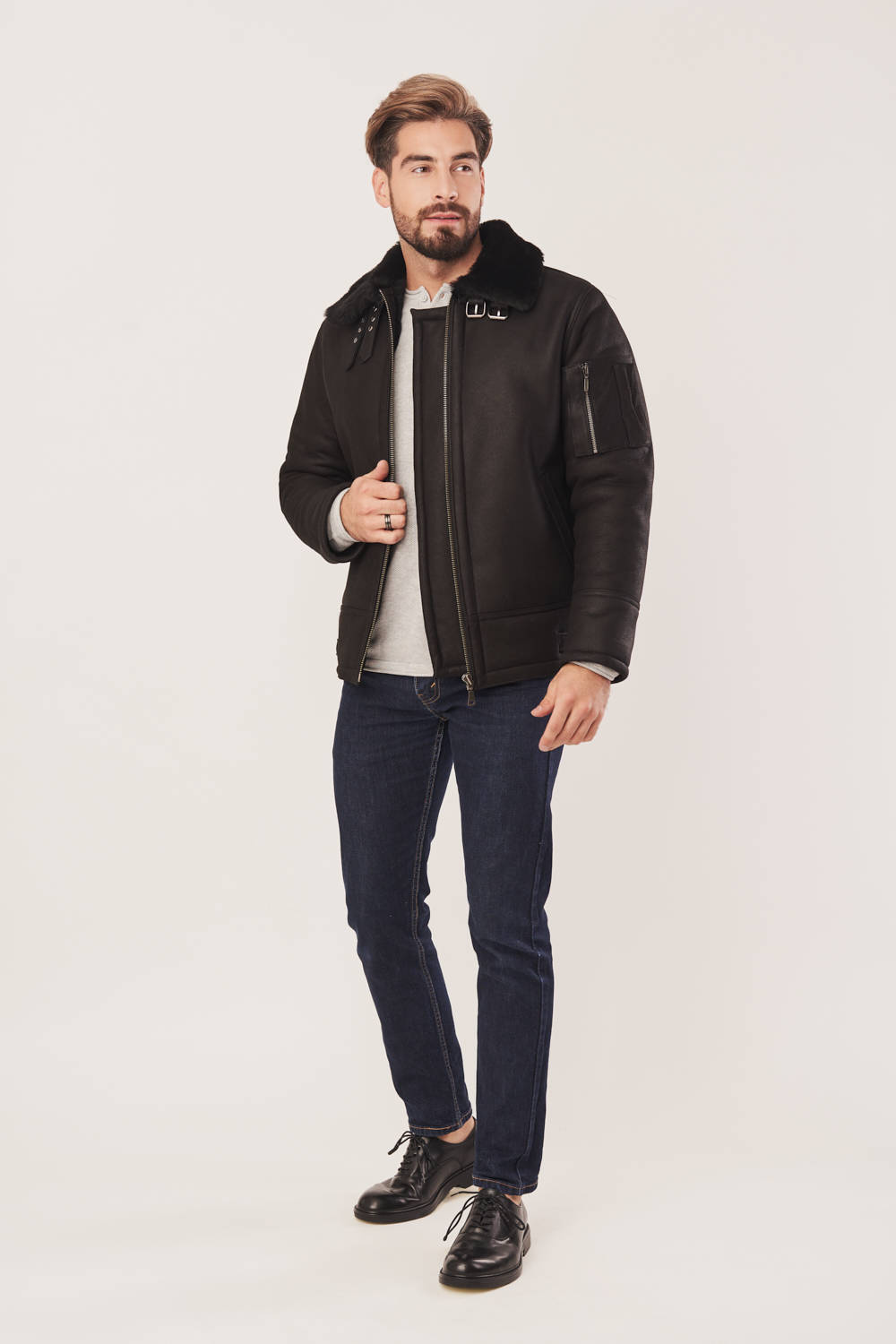 Vyriška žieminė pilotinė striukė juodos spalvos iš natūralios avies odos