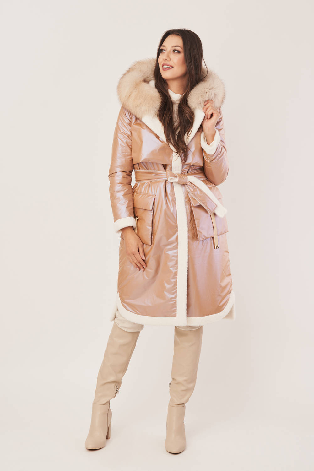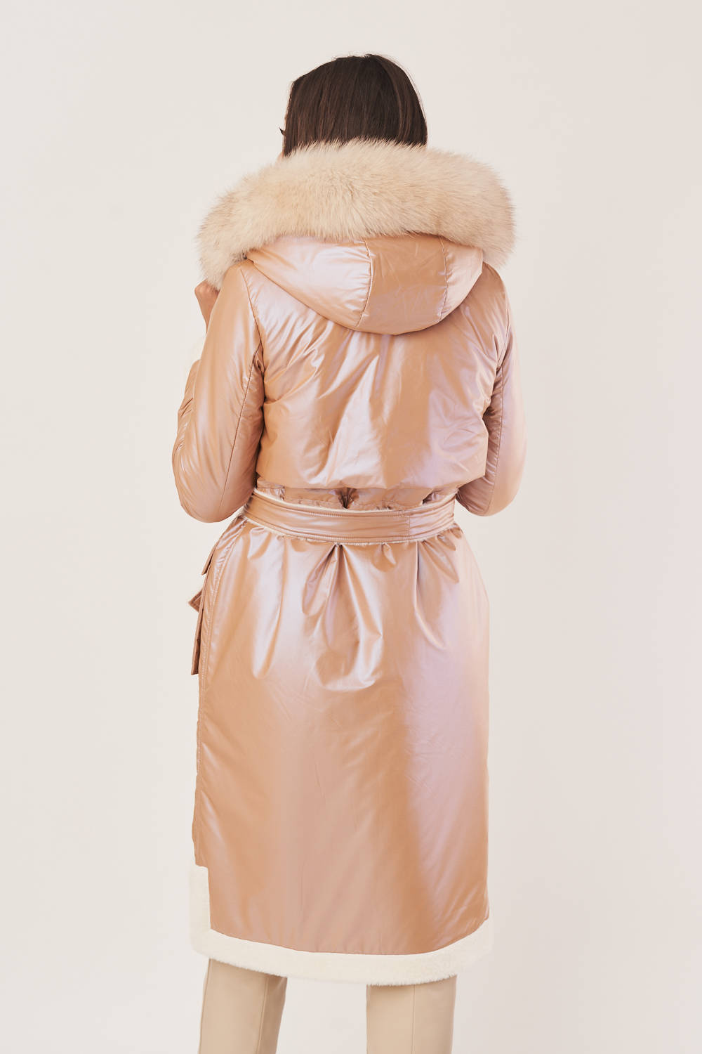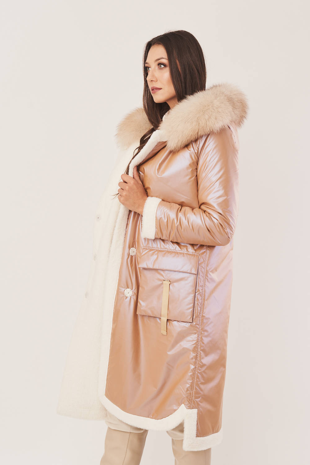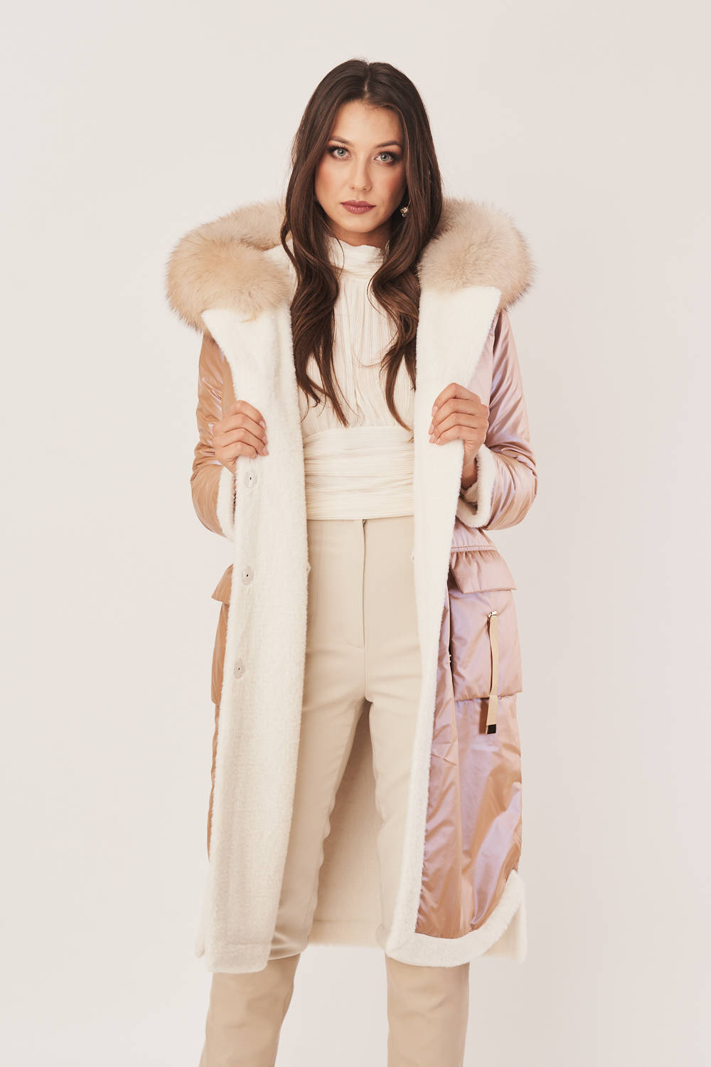 Dvipusis moteriškas pūkinis paltas su natūraliu alpakos kailiu perlinio rudumo atspalvyje. Šis dvipusis moteriškas pūkinis paltas išsiskiria ypatingu funkcionalumu ir prabanga. Pagamintas iš švelnios ir minkštos audinio su šilku, perlinio rudumo spalvos, šis paltas ne tik suteikia išskirtinį stilių, bet ir garantuoja šilumą net šalčiausiomis žiemos dienomis. Unikalus derinys – hipoalerginis ekopūkis kartu su natūralia alpakos vilna – leidžia dėvėti paltą abiem pusėmis, pritaikant jį prie įvairių drabužių ir nuotaikų. Paltas turi dvi išorines kišenes ir dvi vidines kišenes, kurios užtikrina praktiškumą. Reguliuojamas juosmuo su papildomu diržu suteikia galimybę formuoti siluetą pagal pageidavimą arba nešioti laisvai, oversize stiliumi. Natūralaus lapės kailio gobtuvas saugo nuo šalčio ir vėjo, todėl šis žieminis paltas tampa neatsiejama šaltųjų sezonų aprangos dalimi. Dvipusis žieminis pūkinis paltas su natūraliu kailiu – tai aukščiausios kokybės, komforto ir mados sintezė, kuri pranoksta lūkesčius net ir pačių reikliausių klientų.