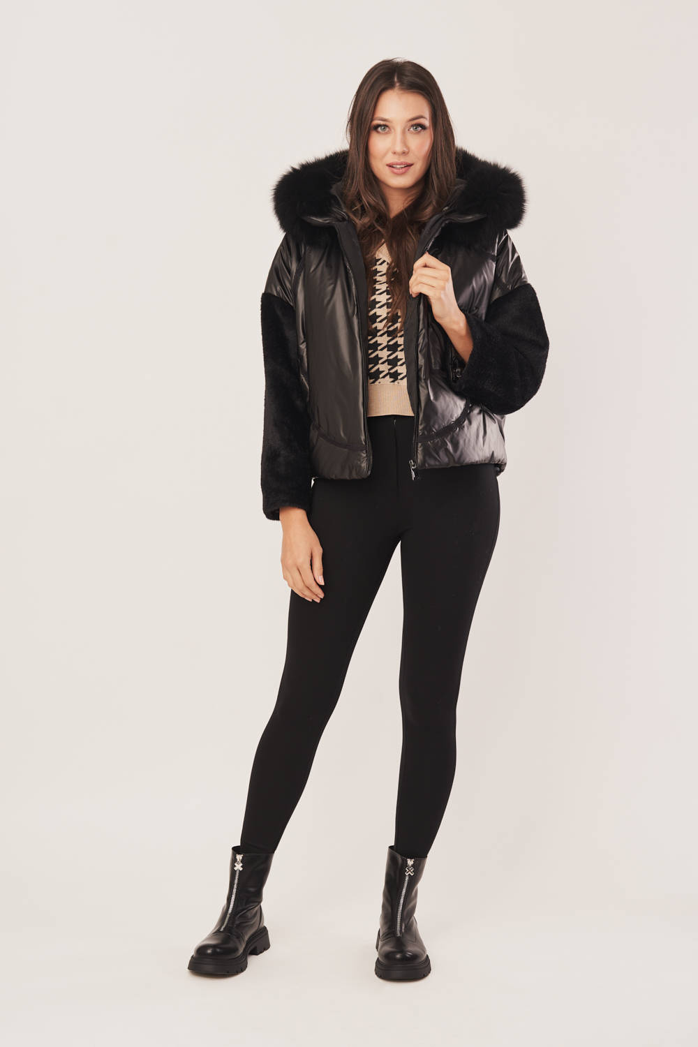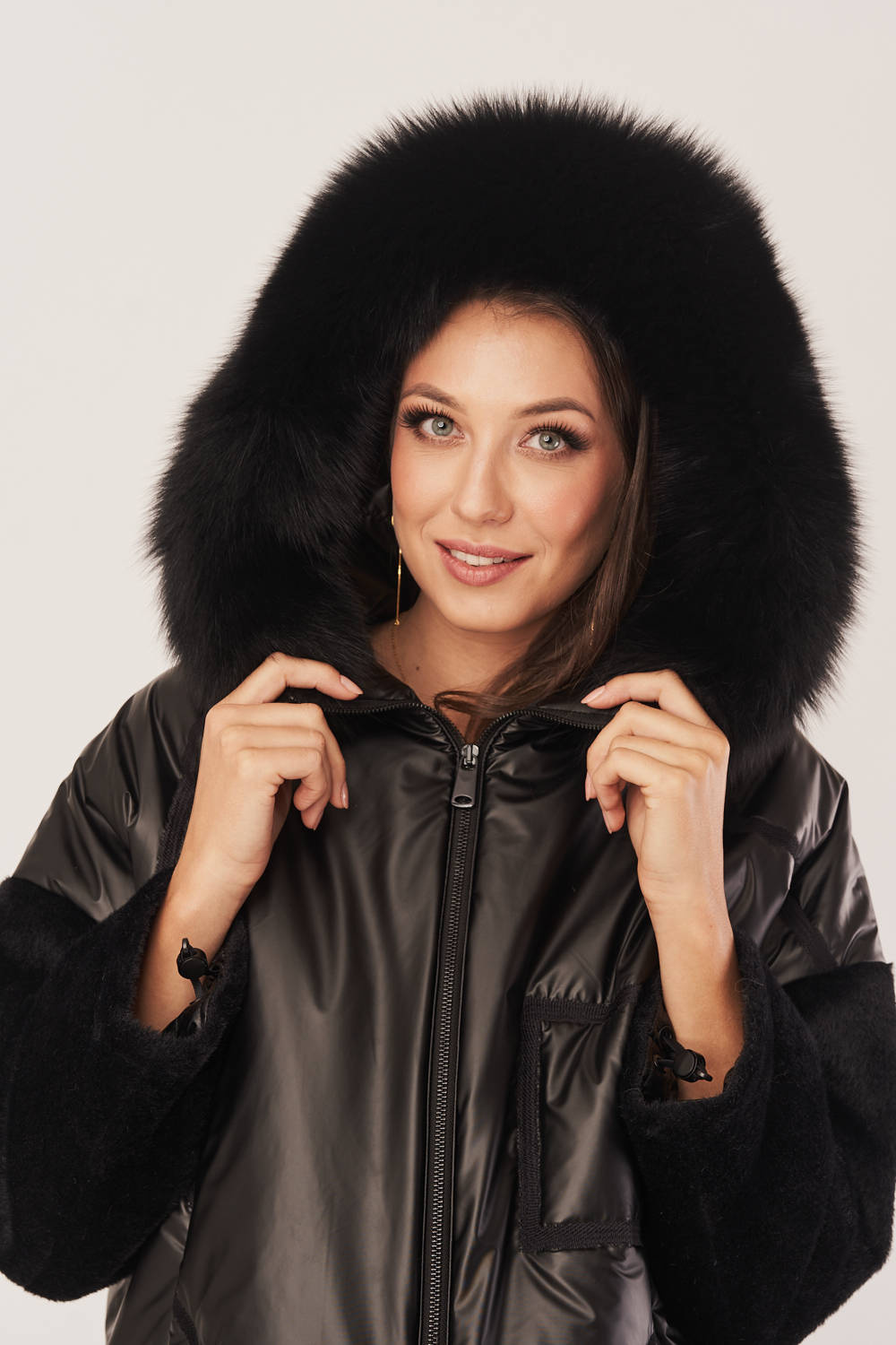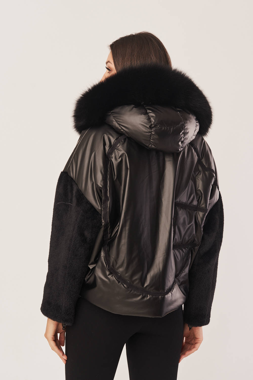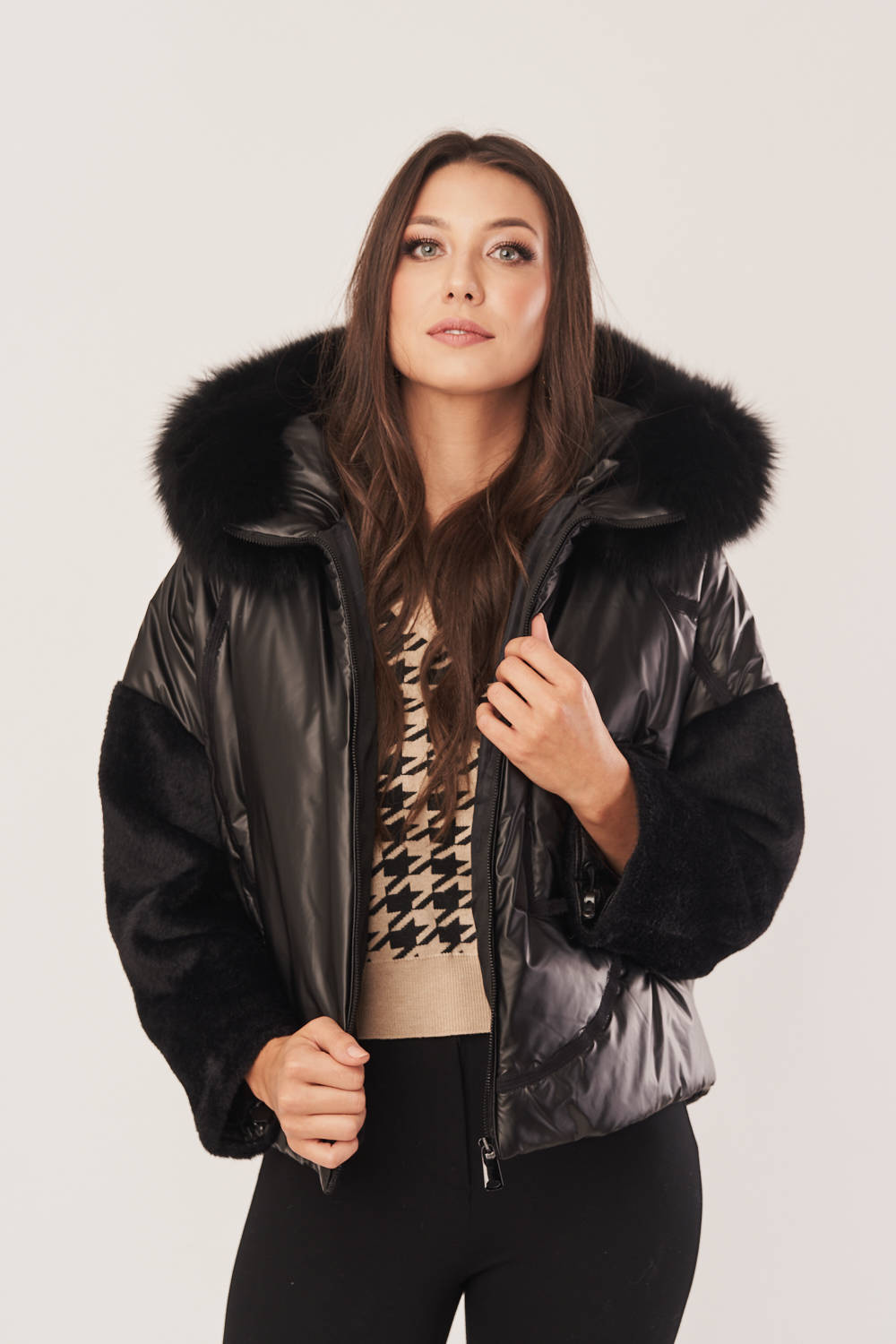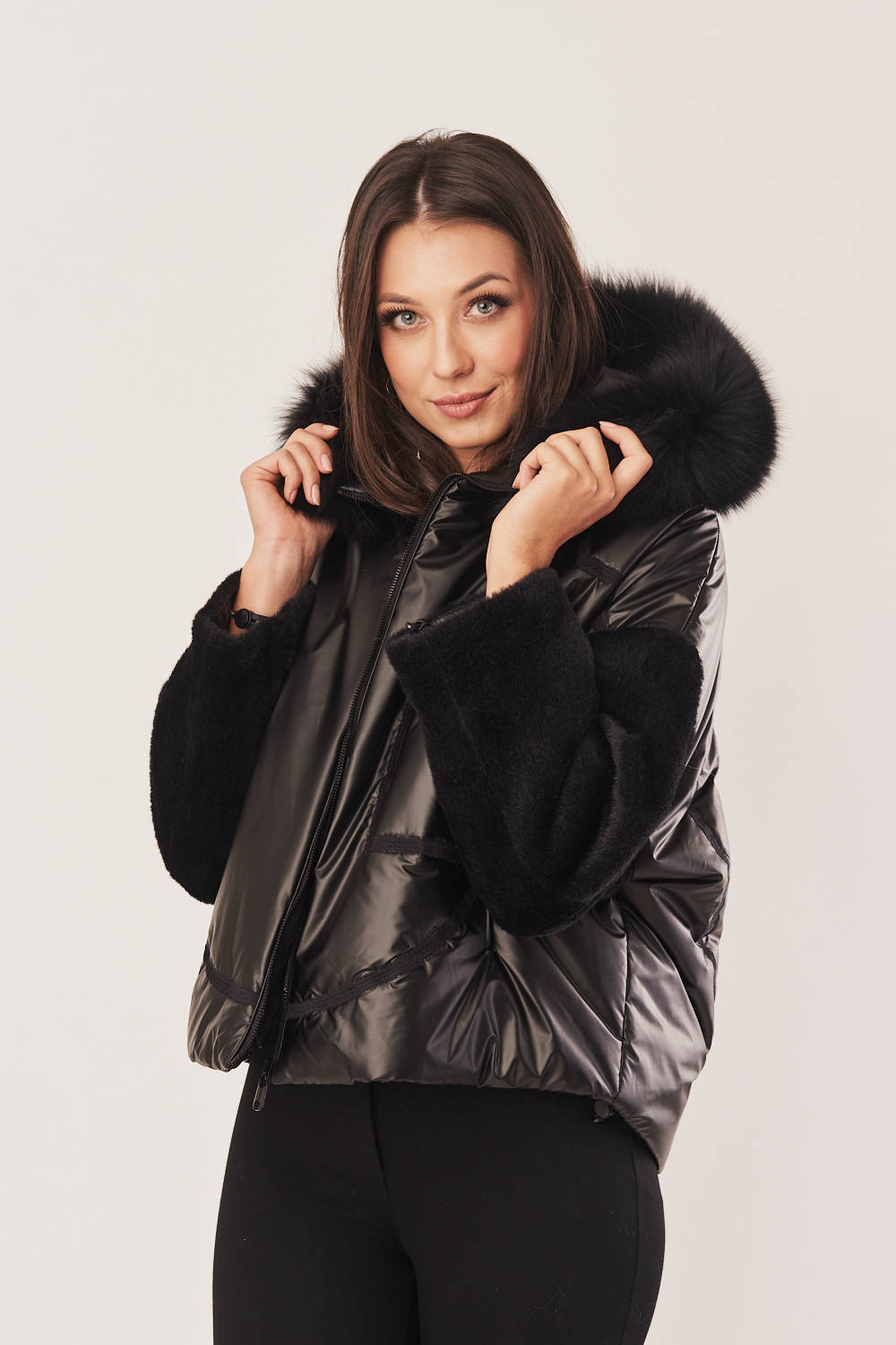 Juoda moteriška pūkinė striukė oversize su lapės kailiu