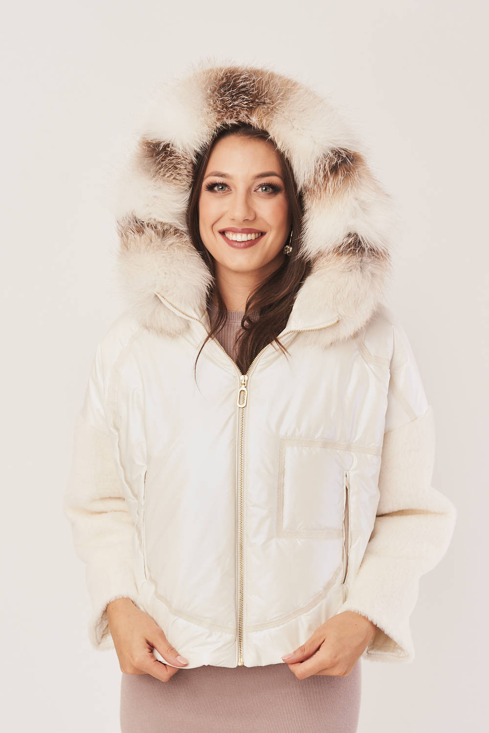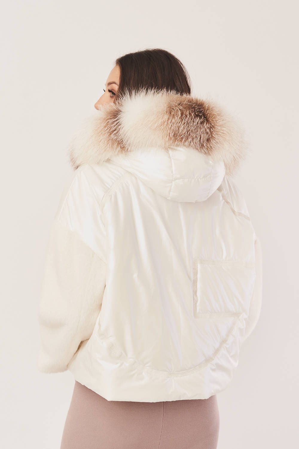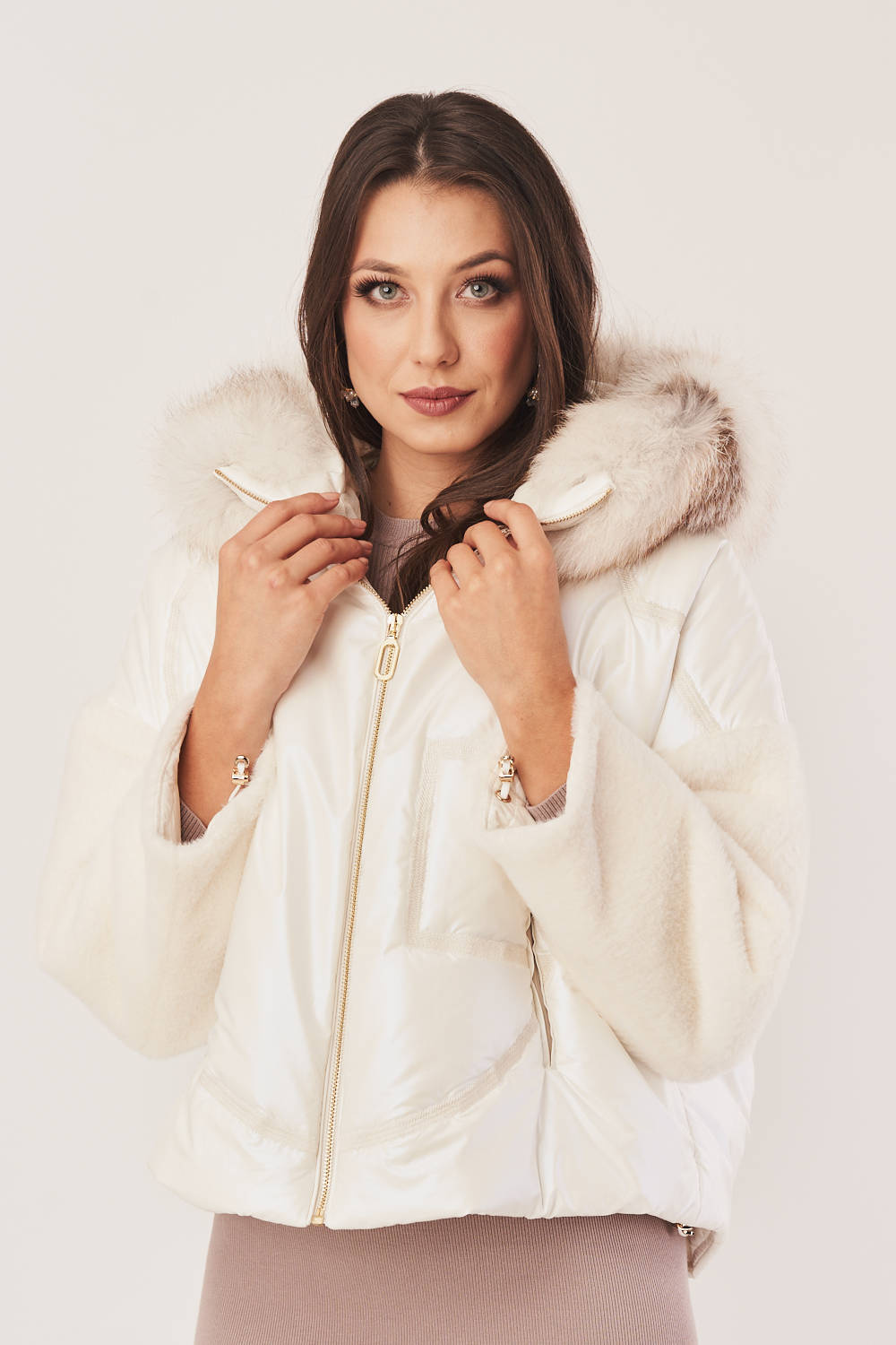 Moteriška pūkinė striukė su lapės kailio apdaila – bežinė, trumpa