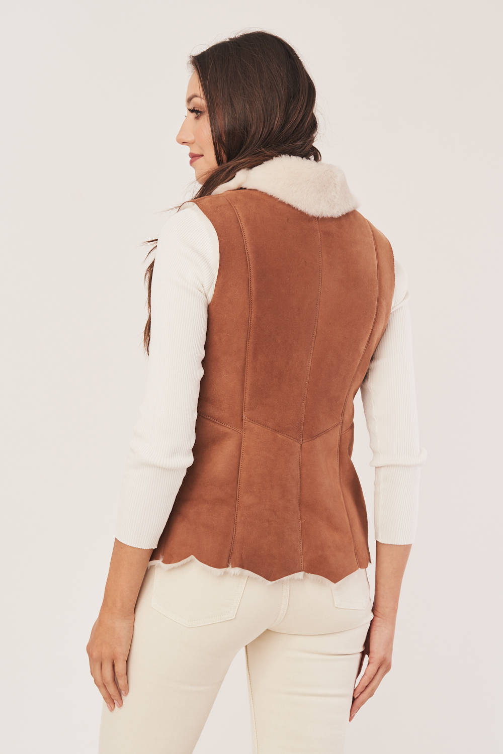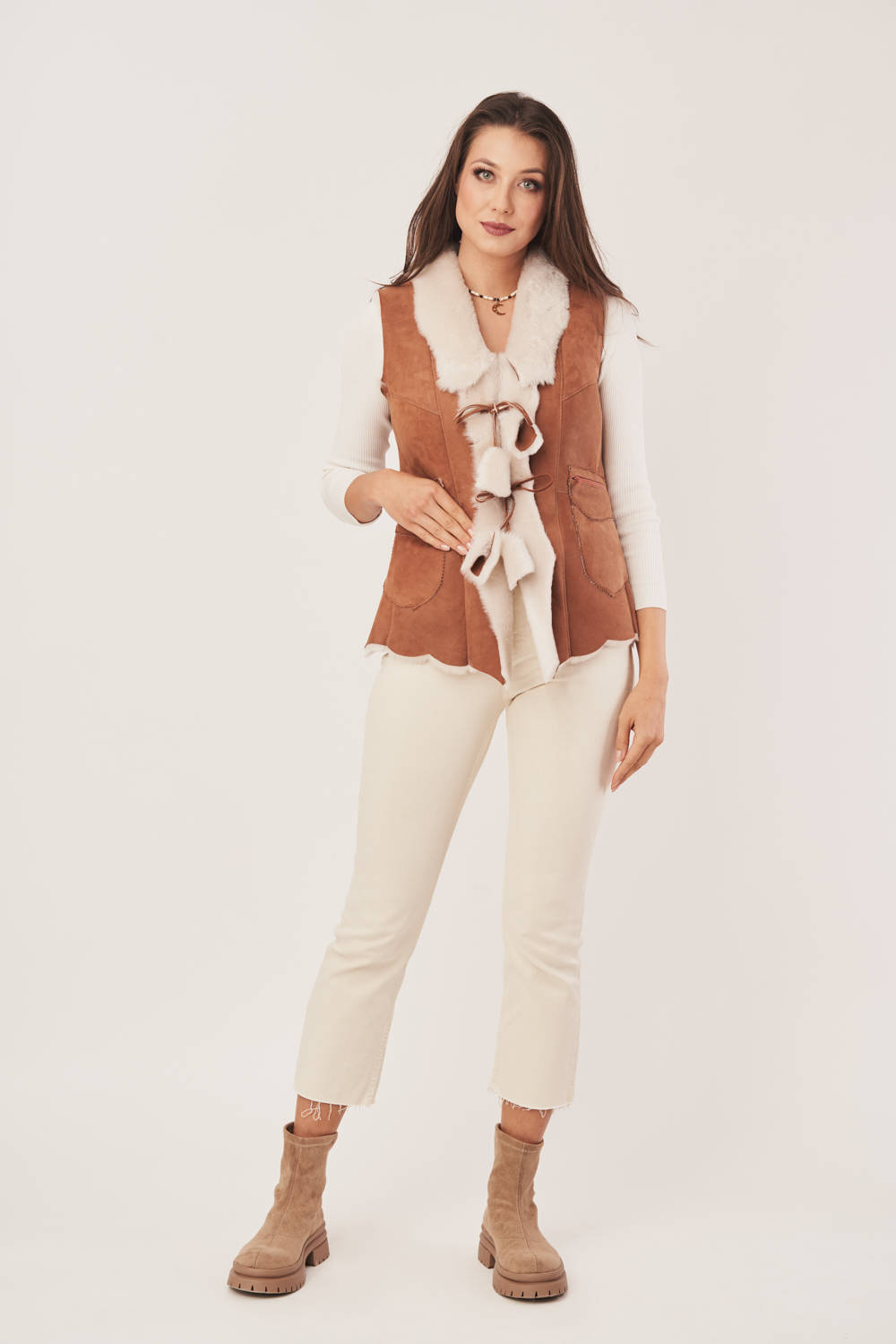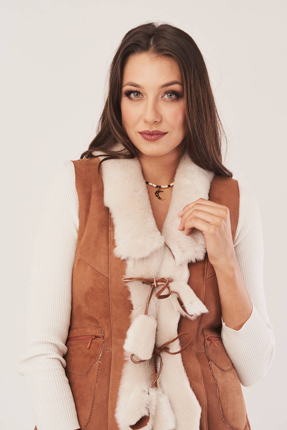 Moteriška avikailio liemenė su balta vilna – natūralus šilumos ir stiliaus derinys pereinamajam sezonui. Trumpa liemenė moterims, pasiūta iš impregnuotos natūralios avikailio odos medaus spalvos, su kontrastine balta vilna viduje. Tai itin lengva, minkšta ir švelni liemenė, kuri suteikia jaukumo ir šilumos vėsesnėmis rudens bei žiemos dienomis. Ši moteriška avikailio liemenė ne tik praktiška, bet ir stilinga – puikiai dera tiek su megztiniu, tiek su šilta suknele. Modelis dekoruotas dviem įleistinėmis kišenėmis su užtrauktukais bei odiniais raišteliais su kutais, kurie suteikia išskirtinumo ir žaismingumo. Švelniai priglundantis siluetas išryškina figūrą, o kokybiškos medžiagos užtikrina ilgaamžiškumą ir komfortą. Liemenė iš natūralios avikailio odos yra puikus pasirinkimas moterims, ieškančioms šilto, stilingo ir išskirtinio viršutinio drabužio. Ruda liemenė su balta vilna – tai universalus drabužis, tinkantis tiek kasdienai, tiek jaukiems savaitgalio deriniams.