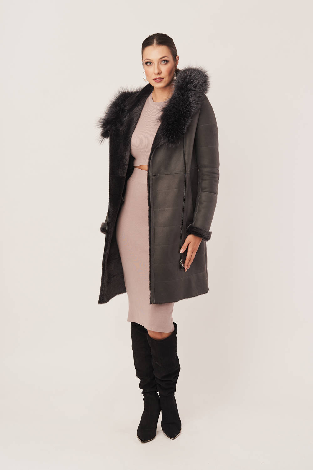 Ilgas moteriškas avikailio paltas su lapės kailiu