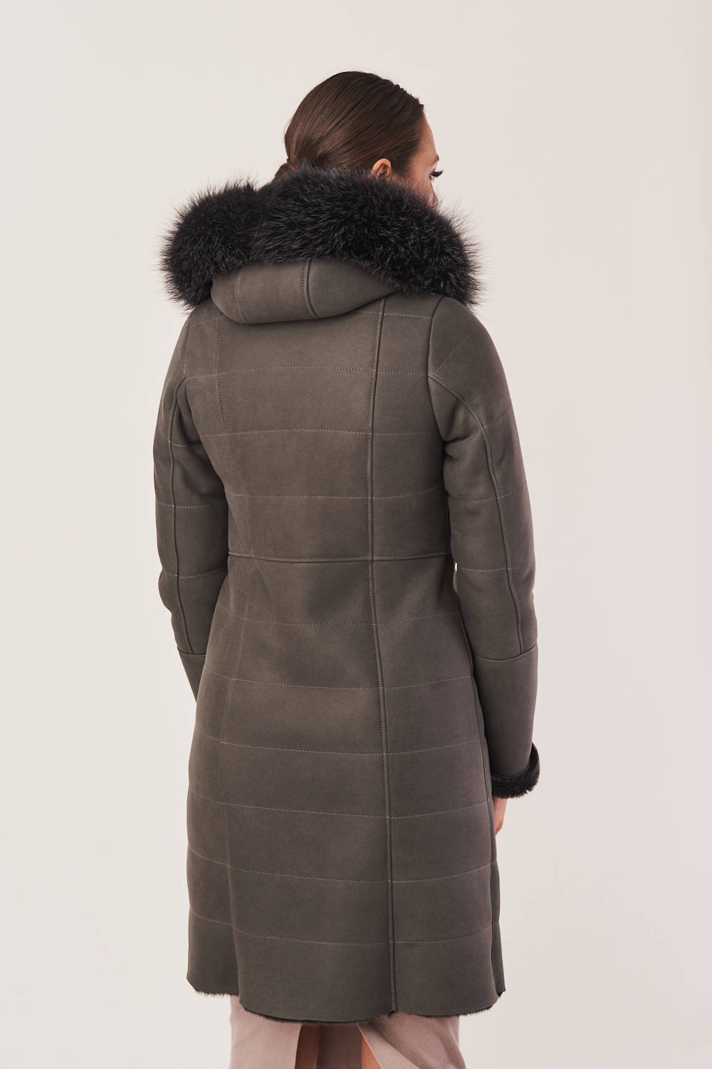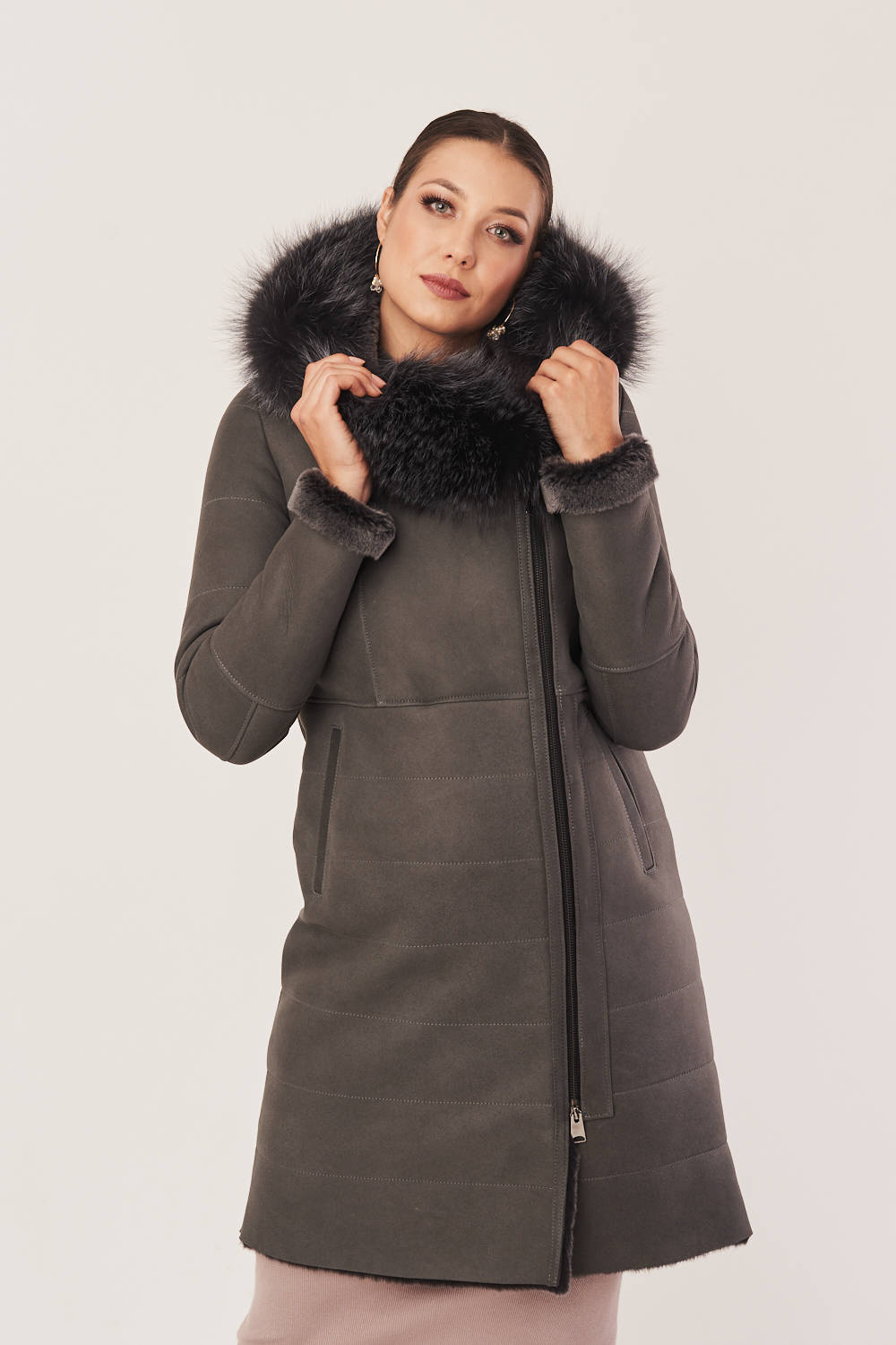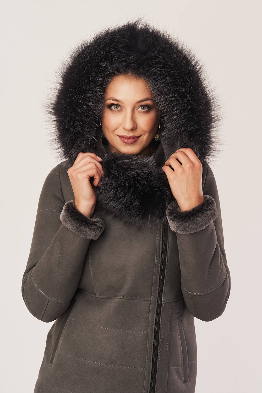 Pilkas moteriškas žieminis avikailio kailinis su gobtuvu ir natūraliu lapės kailiu – šiltas, elegantiškas ir praktiškas pasirinkimas kasdienai. Moteriškas žieminis paltas su gobtuvu, pasiūtas iš natūralios, minkštos ir švelnios avikailio odos. Modelis – šiek tiek įliemenuotas, todėl dailiai pabrėžia siluetą. Ši moteriška žieminė avikailio striukė su lapės kailiu užsegama užtrauktuku, kuris subtiliai pasuktas į šoną. Turi dvi patogias įleistines kišenes bei praktišką gobtuvą, puoštą tikru natūraliu lapės kailiu. Avikailio kailis iš vidaus suteikia aukšto lygio šilumos izoliaciją – išlaiko pastovią kūno temperatūrą net itin šaltomis dienomis. Horizontaliai išdėstytos siūlės šviesiais siūlais vizualiai lieknina figūrą, suteikia lengvumo pojūtį ir išskirtinumo. Šis moteriškas žieminis avikailio paltas su lapės kailiu puikiai tiks tiek kasdieniam dėvėjimui, tiek ir kuriant elegantiškesnį miesto stilių.