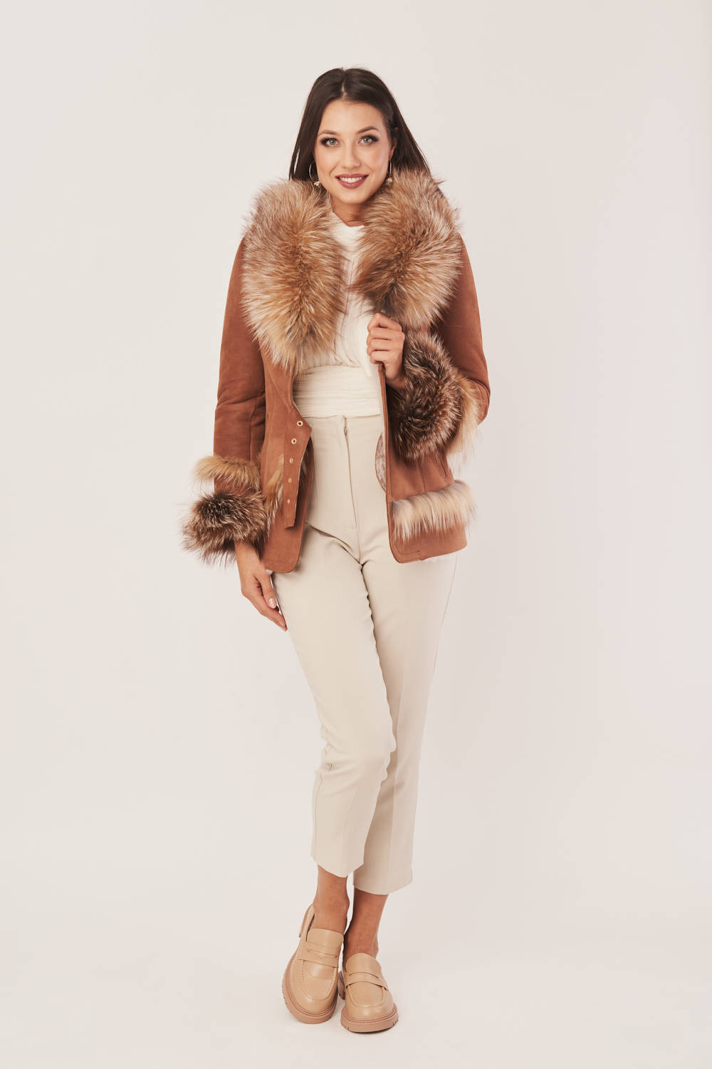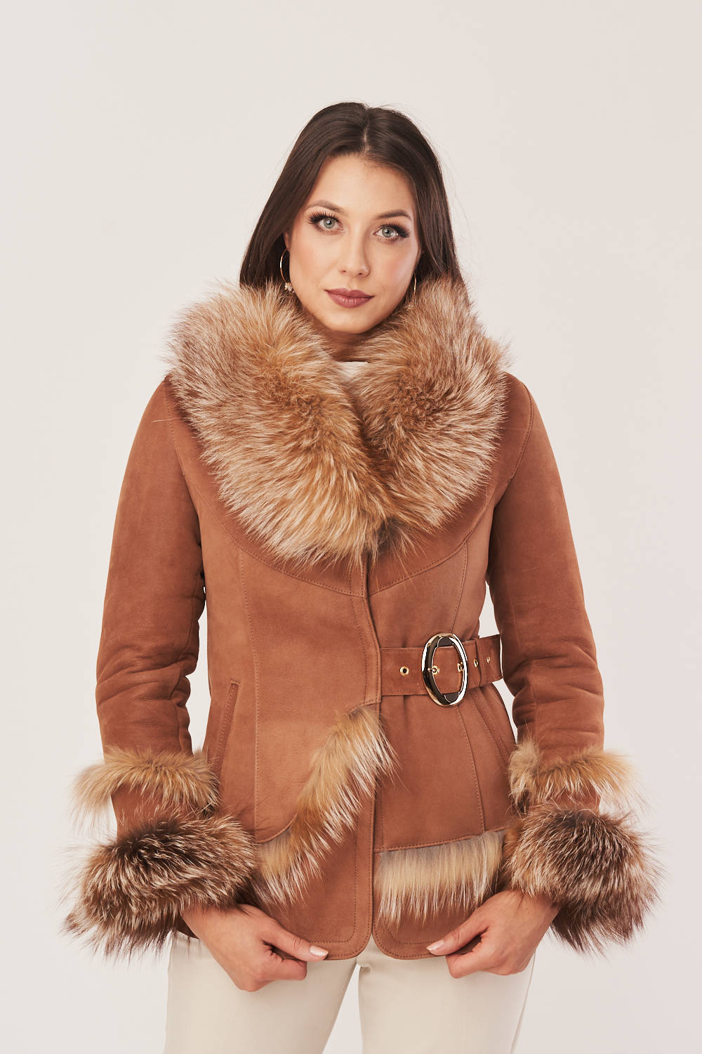 Moteriški žieminiai kailiniai iš avikailio su balta vilna ir lapės kailiu – šiltas ir stilingas pasirinkimas šaltam sezonui. Moteriški žieminiai kailiniai šiltos medaus spalvos, su balta avikailio vilna viduje. Siūti iš natūralios, aukštos kokybės avikailio odos ir puošti tikru lapės kailiu. Ši trumpa moteriška striukė iš avikailio su kailiu pasižymi išskirtiniu šilumos komfortu – švelnus ir purus avikailio kailis iš vidaus padeda išlaikyti pastovią kūno temperatūrą net šalčiausiomis žiemos dienomis. Modelis turi dvi patogias įleistines kišenes, segamas dviem dekoratyvinėmis sagomis ir diržu su sagtimi ties liemeniu. Trumpi avikailio kailiniai moterims su lapės kailiu puikiai dera tiek su kasdienėmis aprangomis, tiek su elegantišku, formaliu stiliumi. Tai žieminis moteriškas kailinis su baltu avikailiu ir lapės kailiu, tinkantis norinčioms išsiskirti, tačiau išlikti praktiškomis ir sušildytomis šaltuoju metų laiku.