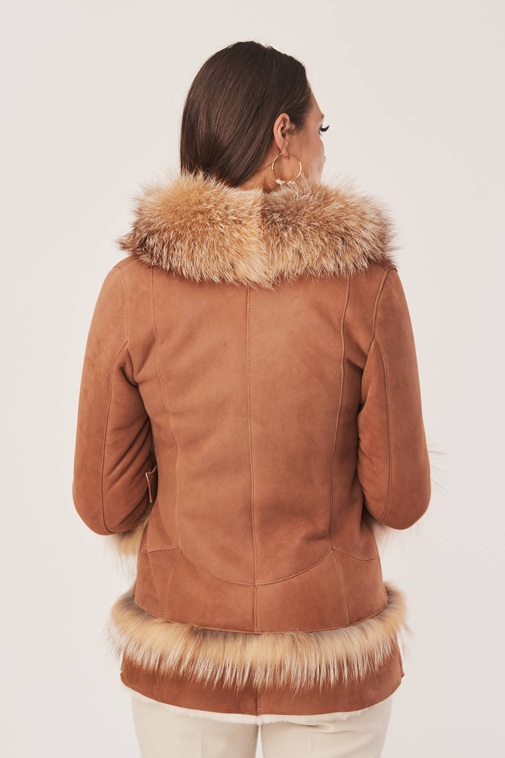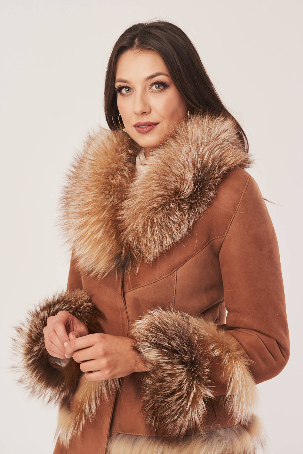 Moteriškas avikailio paltas su lapės kailiu, rudas