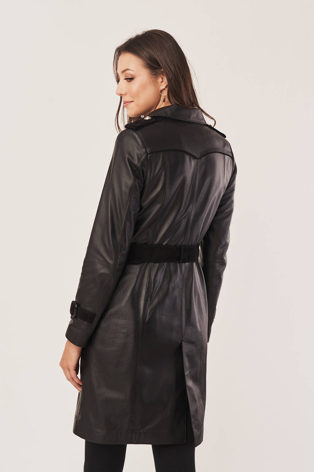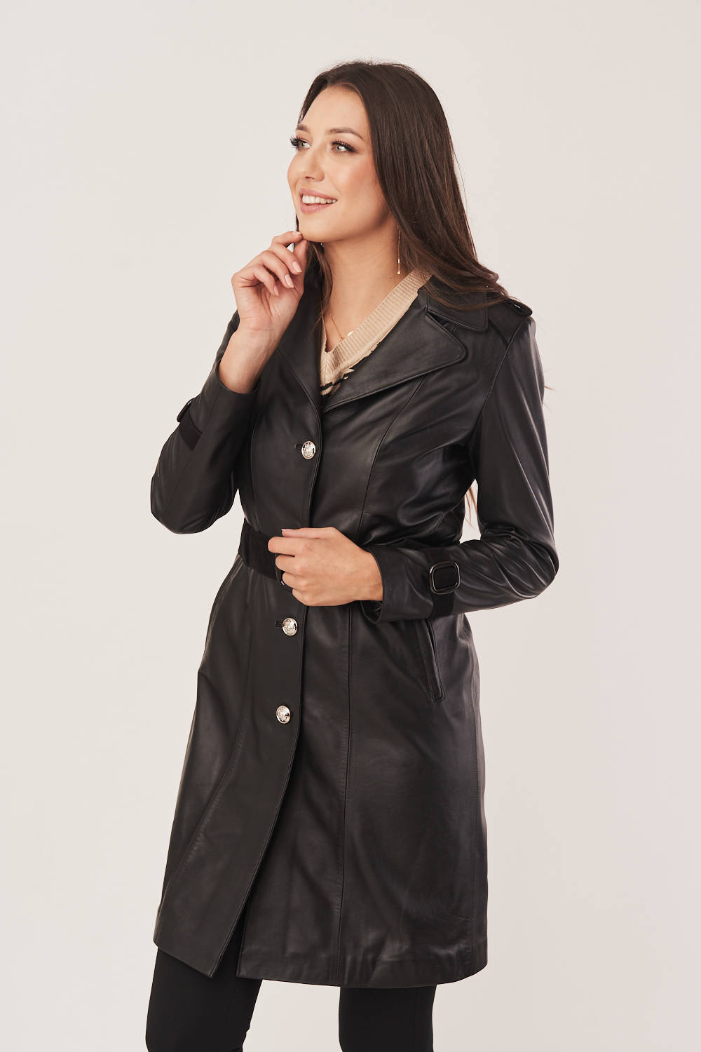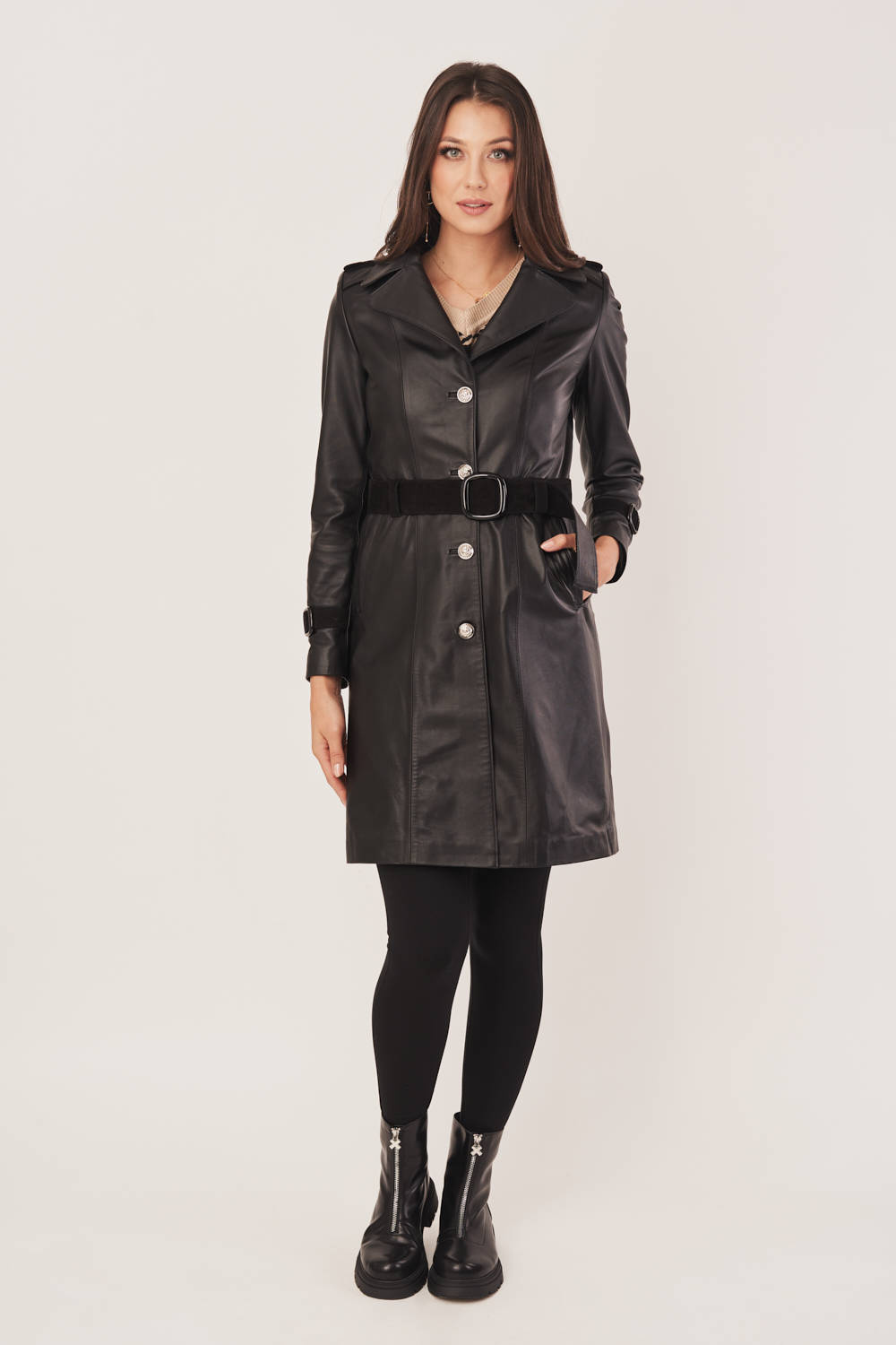 Moteriškas odinis paltas juodos spalvos – elegantiškas pasirinkimas pereinamajam sezonui. Šis moteriškas odinis paltas juodos spalvos, pasiūtas iš aukštos kokybės natūralios avies odos, išsiskiria savo minkštumu, lengvumu ir patogumu dėvėti kasdien. Paltas yra iki kelių ilgio, lengvai prigludusio silueto, kuris subtiliai pabrėžia figūrą. Užsegamas sagomis, nepašiltintas, todėl puikiai tinka dėvėti pavasarį ir rudenį. Modelio išskirtinumas – veliuros odos detalės: dekoratyviniai pečių atvartai bei rišamas diržas ties juosmeniu, kurie suteikia klasikinei formai modernumo ir charakterio. Tai universalus, stilingas ir praktiškas paltas iš natūralios odos, kuris lengvai derės tiek su elegantiškais kostiumėliais ar suknelėmis, tiek su kasdiene apranga – džinsais, golfais ar odinėmis pirštinėmis. Ieškančioms kokybės, funkcionalumo ir moteriško silueto – šis lengvas odinis paltas pavasariui ir rudeniui taps nepakeičiama garderobo dalimi pereinamuoju metų laiku.