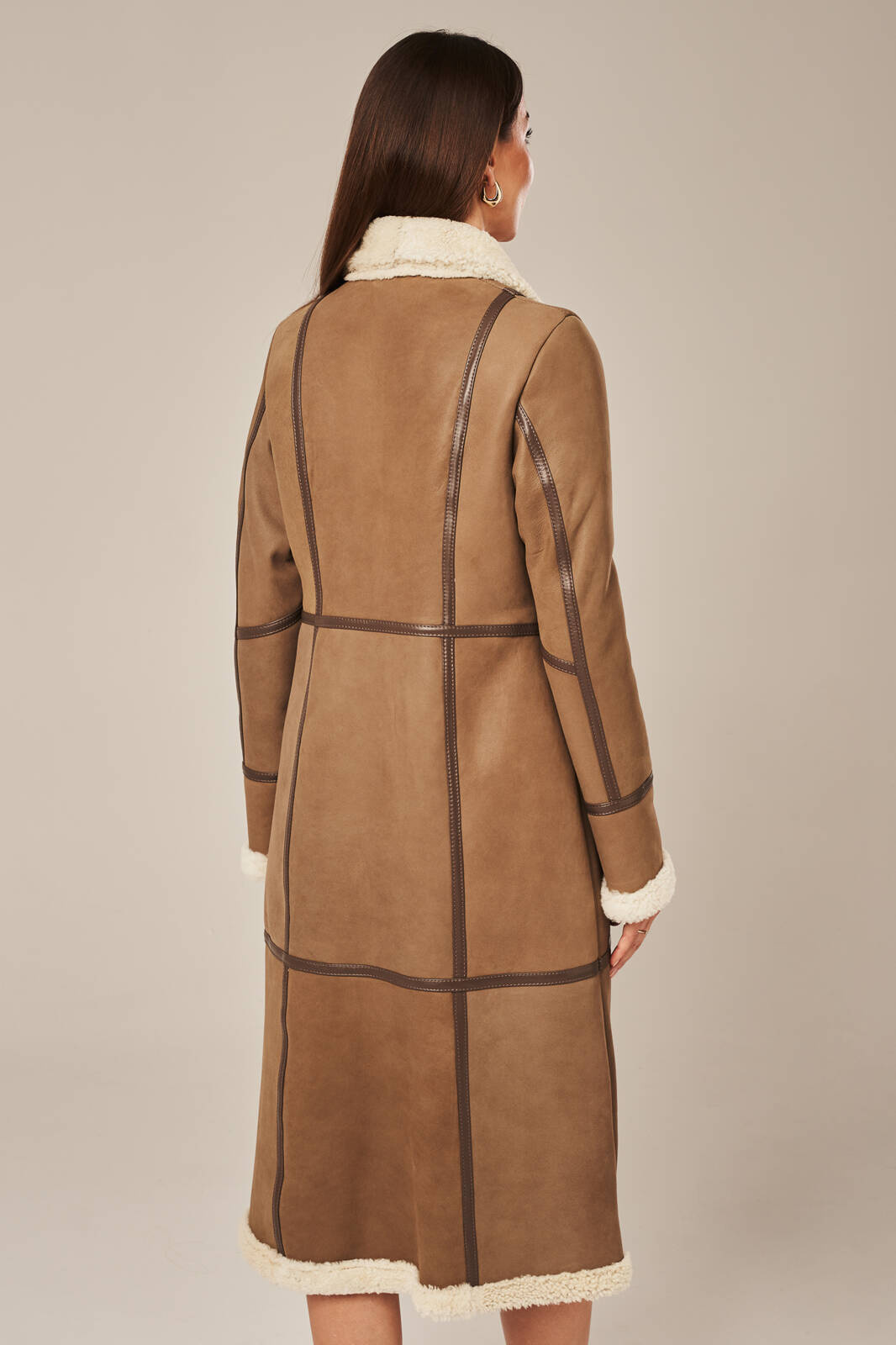 Stilingas avikailio kailinis smėlinės spalvos – ilgas natūralus paltas moterims. Elegantiškas natūralus moteriškas kailinis, pasiūtas iš impregnuotos, aukštos kokybės avikailio odos šviesiai rudos (smėlinės) spalvos. Šis modelis pasižymi lengvumu, šiluma ir ypatingu minkštumu – puikiai tinka ilgiems žiemos pasivaikščiojimams ar kasdieniam dėvėjimui. Vidinėje pusėje – švelnus, garbanotas trumpas avikailis, užtikrinantis natūralią šilumos izoliaciją net esant stipriam šalčiui. Tamsiai rudos spalvos įsiuvai pagaminti iš lygios odos, suteikiant subtilios kontrasto estetikos. Kailinis turi dvi patogias įleistines kišenes ir stilingą apykaklę-stovą, kurią galima nuleisti. Šis ilgas avikailio paltas moterims užsegamas sagomis, yra šiek tiek įliemenuoto silueto ir pasižymi tiesiu, klasikiniu kirpimu. Moteriškas kailinis iš natūralios avikailio odos yra funkcionalus ir stilingas pasirinkimas šaltajam sezonui – nesenstantis dizainas, pritaikytas šiuolaikinei moteriai.