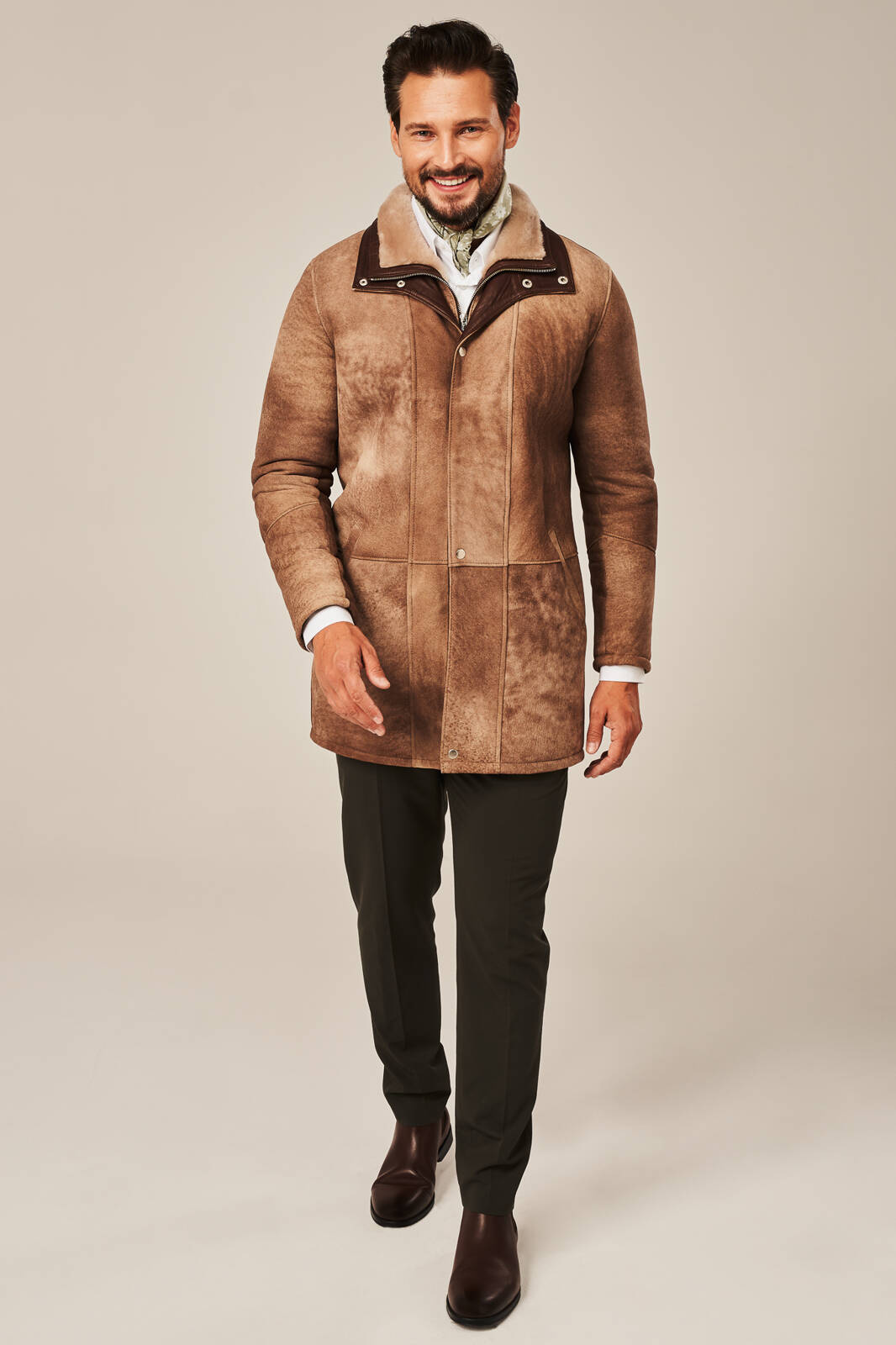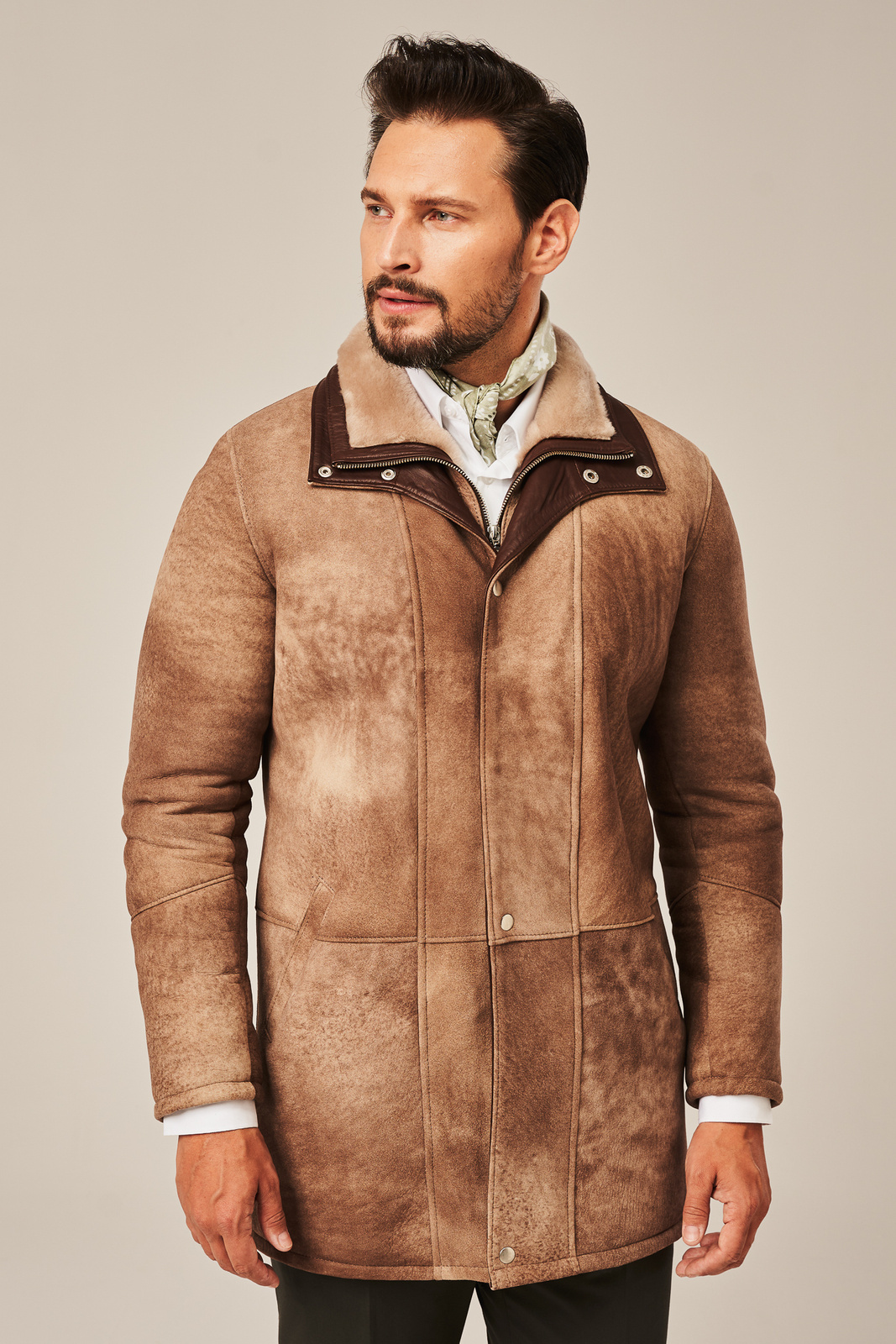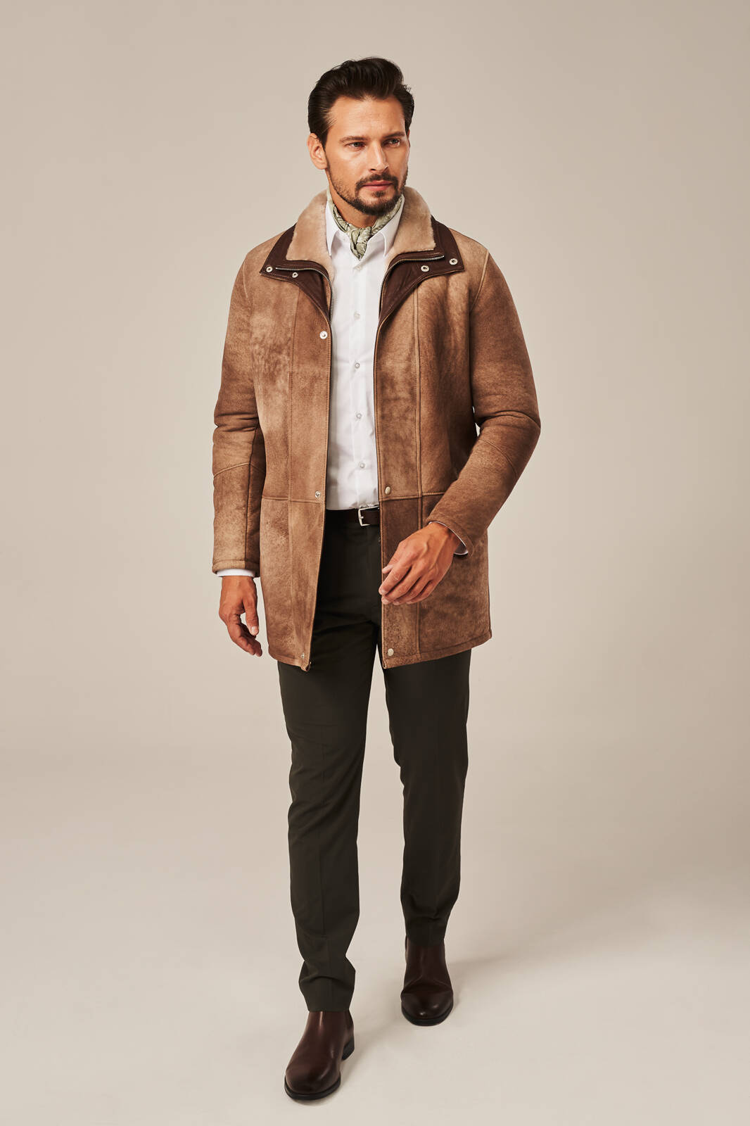 Natūralus vyriškas avikailio paltas – elegantiškas rudos spalvos, klasikinio stiliaus