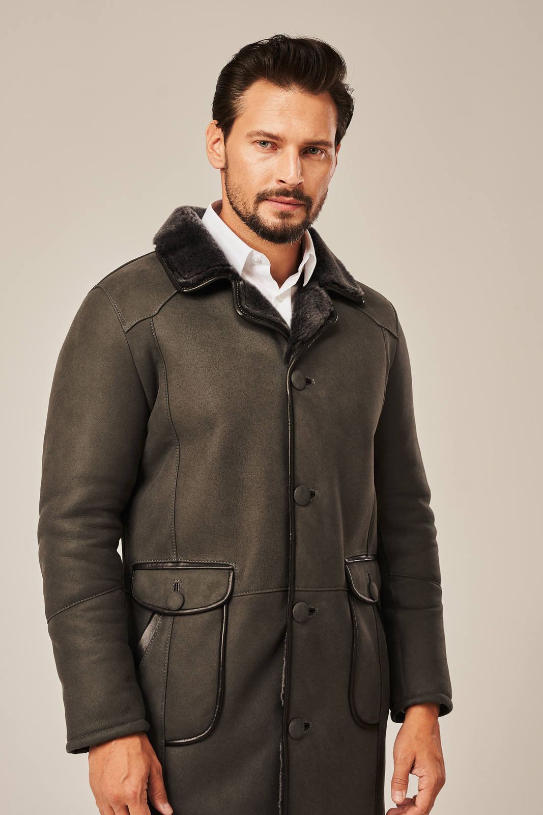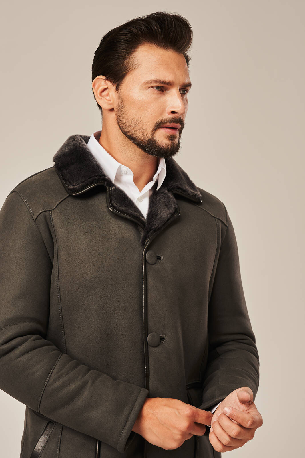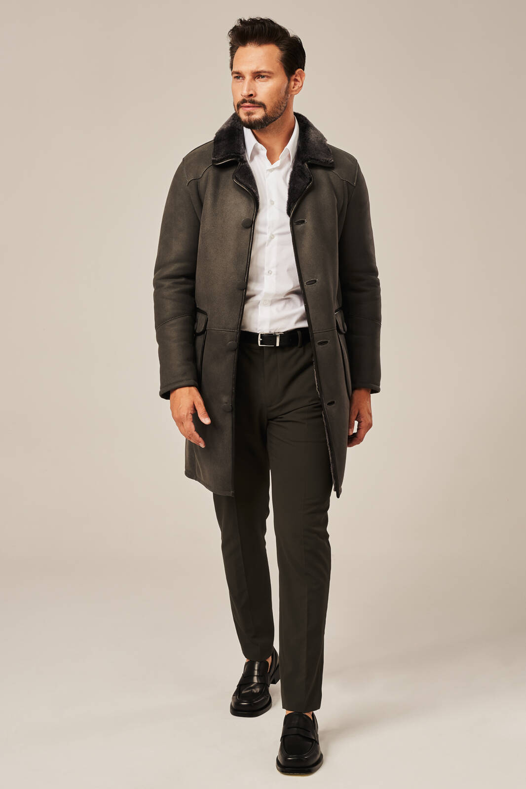 Tikras vyriškas avikailio paltas žiemai – ilgas pilkas kailinis iš natūralios avikailio odos. Stilingas ir ilgaamžis tikras vyriškas avikailio paltas žiemai, pagamintas iš aukštos kokybės, impregnuotos natūralios avikailio odos, užtikrina nepriekaištingą šilumą ir komfortą net atšiauriausiomis žiemos dienomis. Vidinę pusę dengia švelnus ir minkštas ėriuko kailis, kuris efektyviai palaiko pastovią kūno temperatūrą, todėl tai puikus pasirinkimas vyrams, vertinantiems natūralias medžiagas ir aukštą kokybę. Paltas turi dvi patogias įleistines kišenes ir dar dvi, kurios susegamos sagomis – tai leidžia saugiai nešiotis svarbiausius daiktus. Ilgas modelis buvo kruopščiai suprojektuotas taip, kad puikiai tiktų dėvėti ir su kostiumu ar švarku, todėl šis avikailio paltas vyrams puikiai dera tiek prie klasikinio, tiek prie laisvesnio stiliaus. Papildomo išskirtinumo šiam vyriškam žieminiam paltui suteikia rankų darbo natūralios odos apsiuvai šiek tiek tamsesniame pilkame atspalvyje – tai detalė, kuri ne tik sustiprina paltą, bet ir priduoda charakterio bei elegancijos. Norintiems visumos įvaizdžio, galima papildomai įsigyti ir tokią pačią kepurę, puikiai derančią prie palto spalvos. Avikailio paltai vyrams – tai ne tik šiluma, bet ir išliekanti vertė.