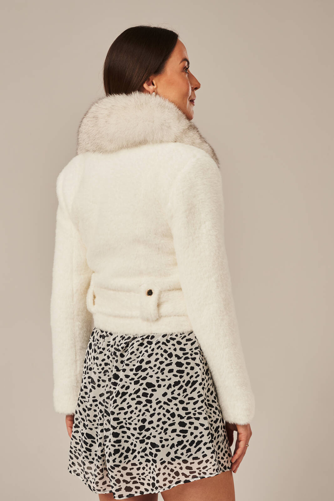 Trumpa moteriška šviesiai kremine striukė su natūralaus lapių kailio apdaila