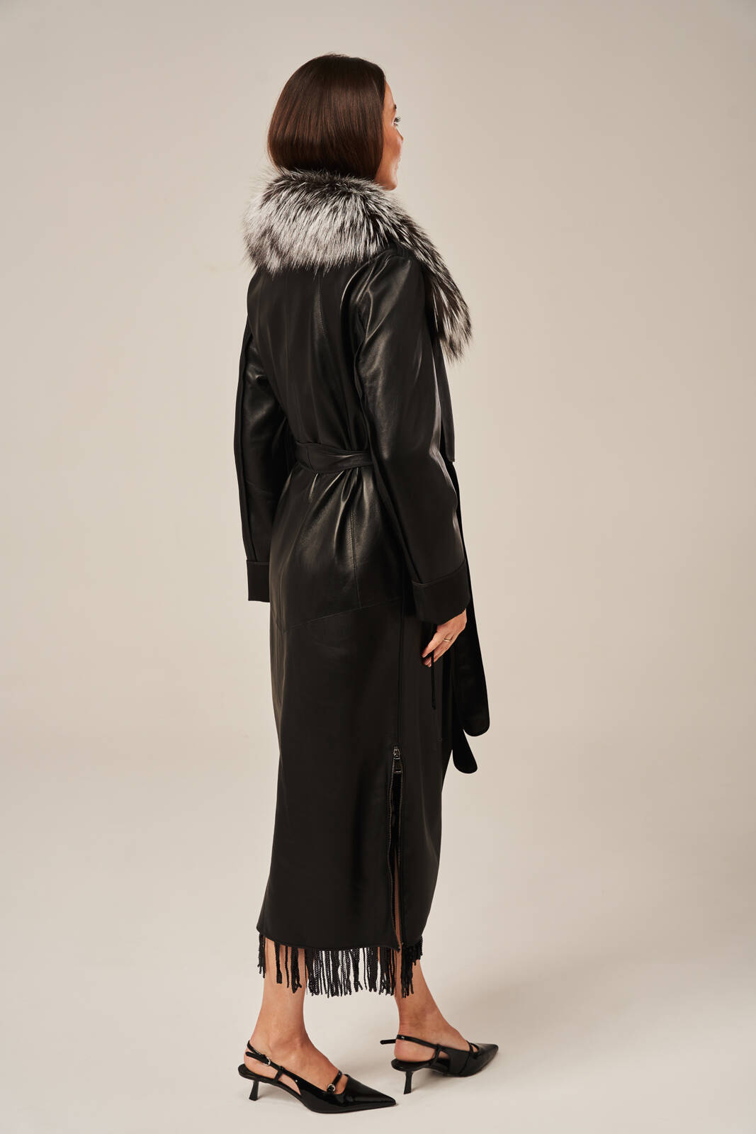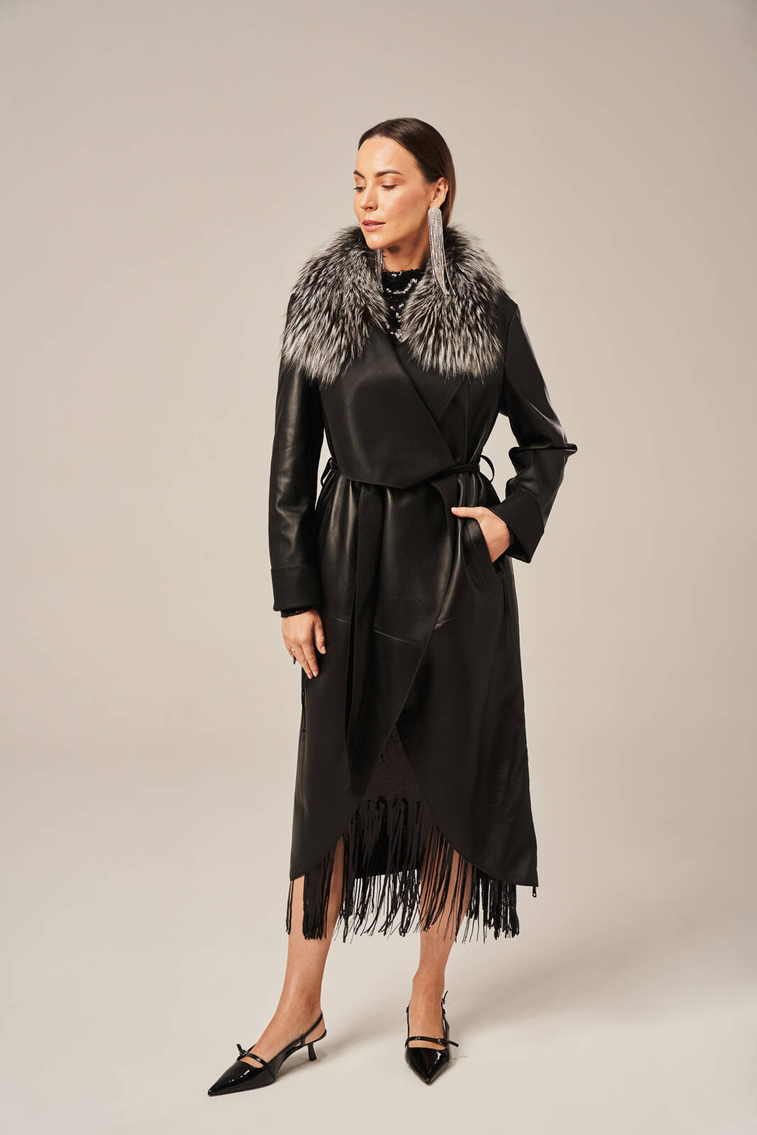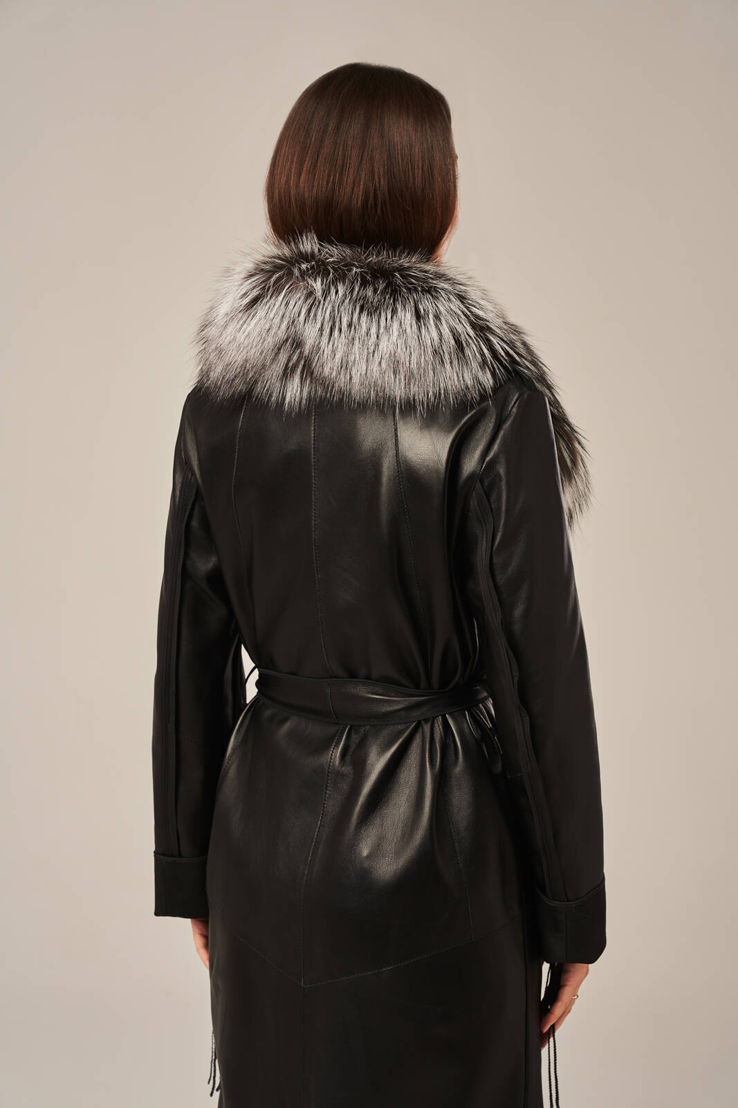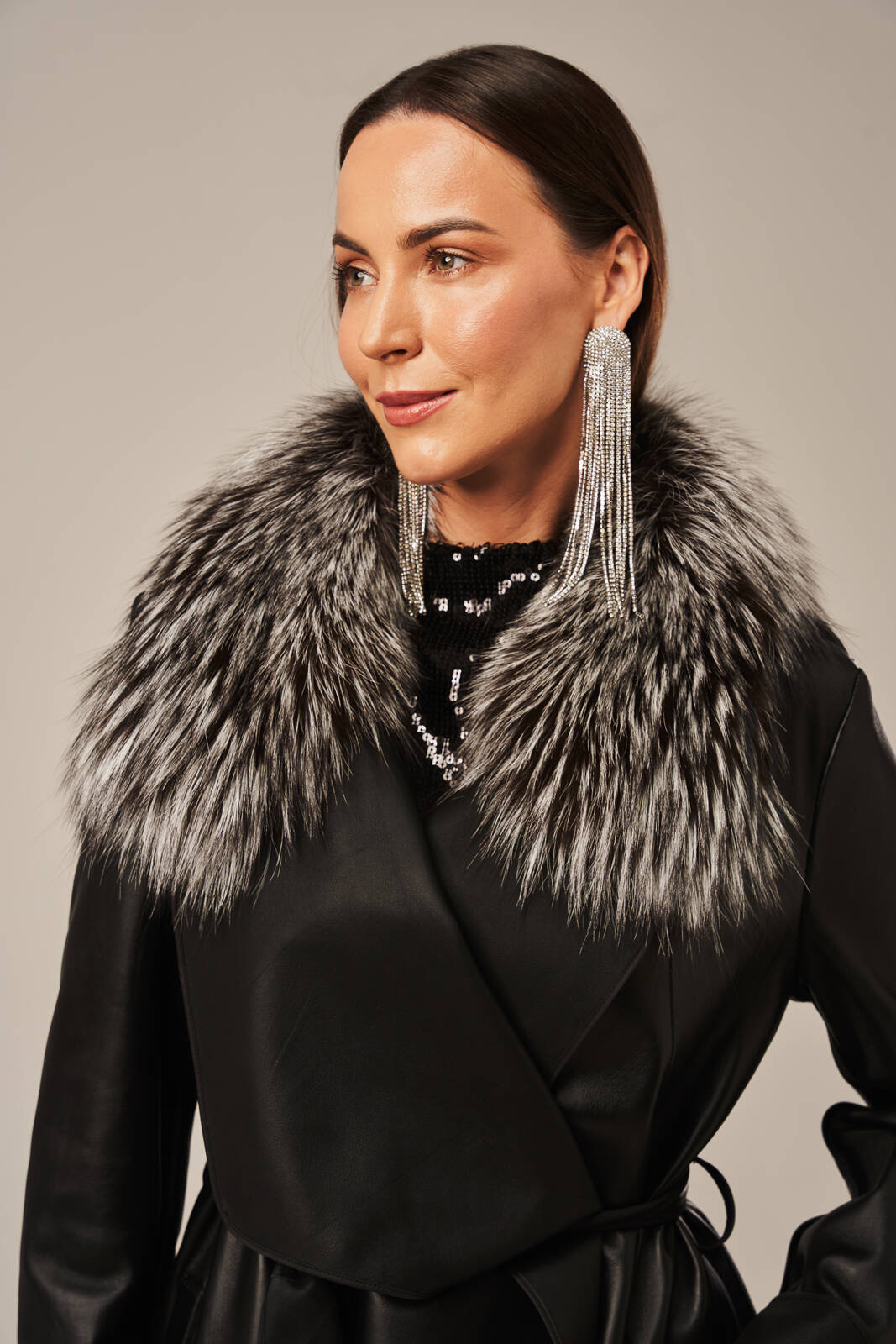 Juodos spalvos moteriškas odinis paltas su natūralios lapės kailio apykakle – elegancija ir komfortas